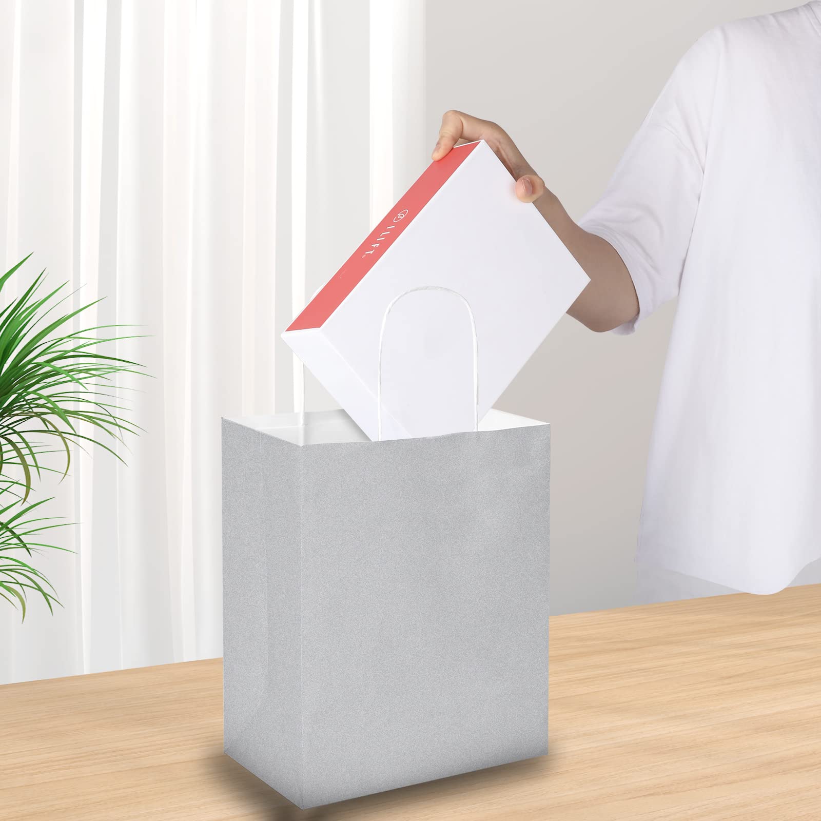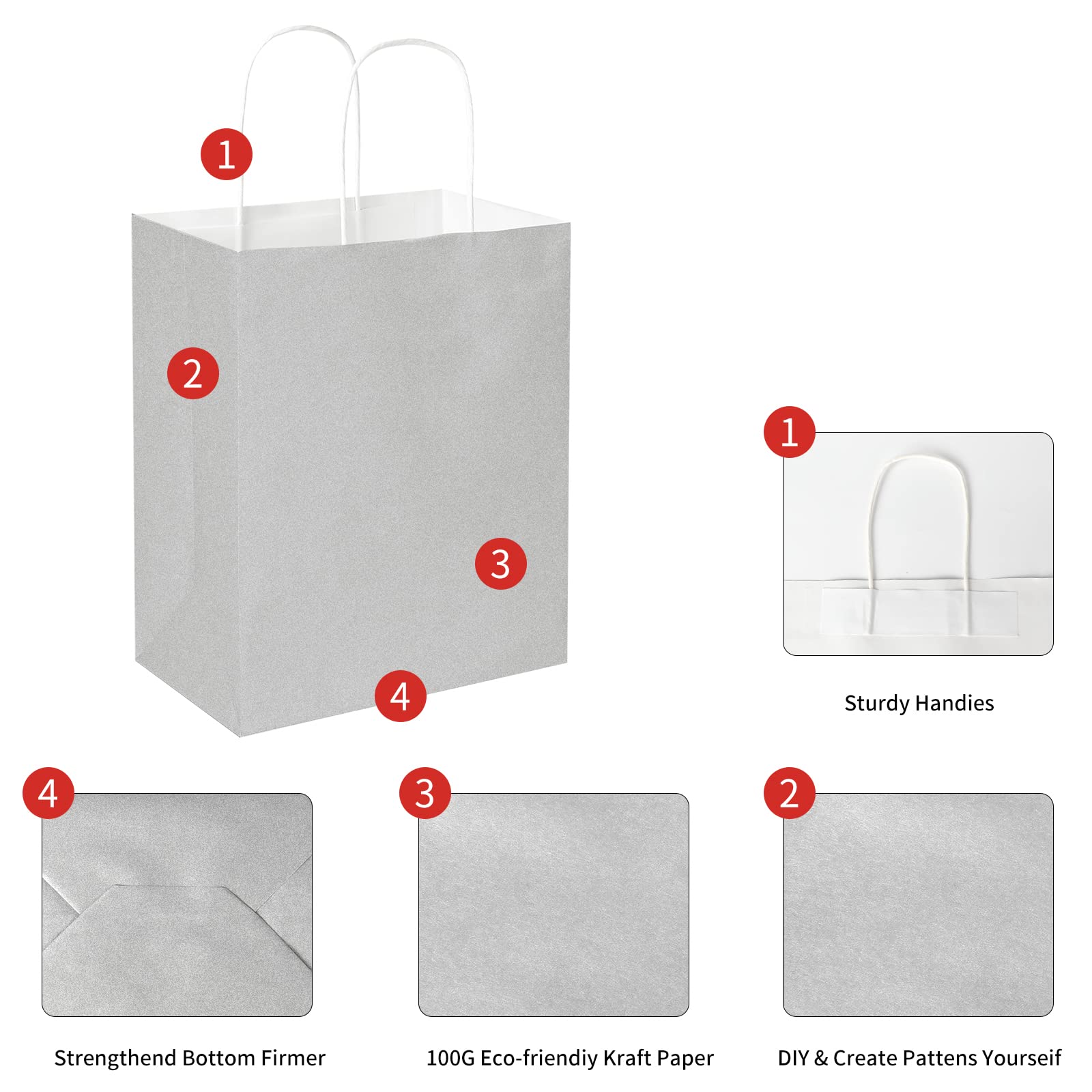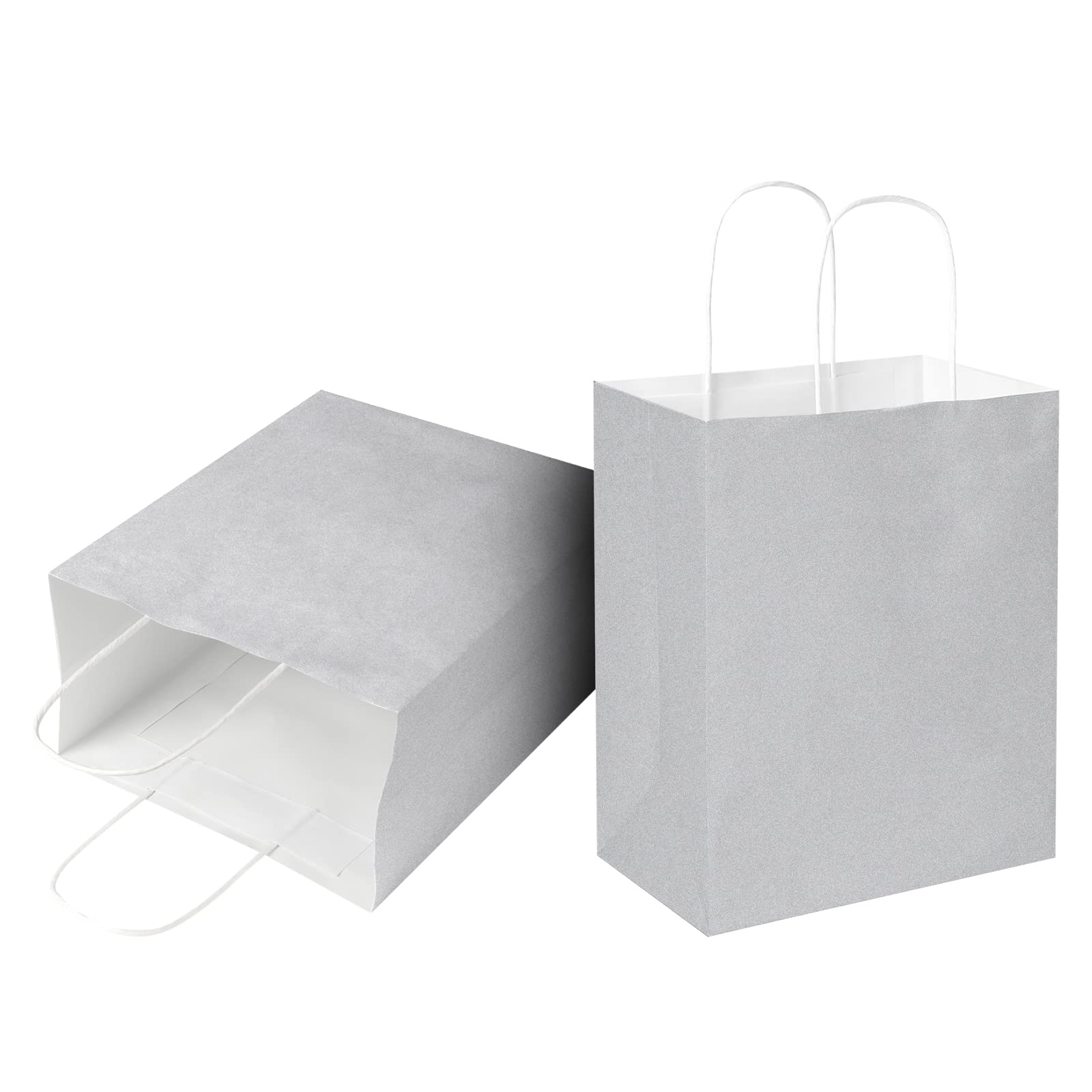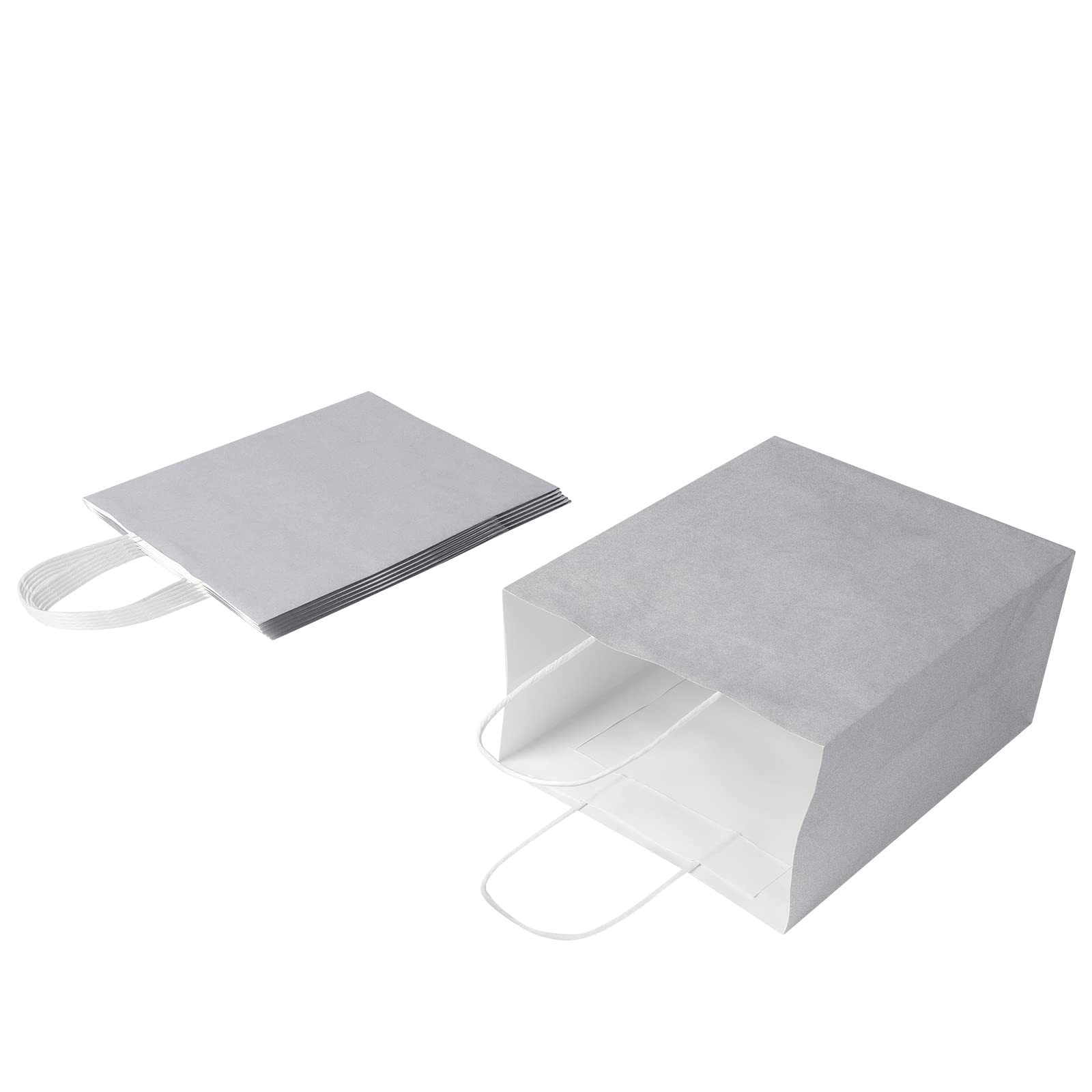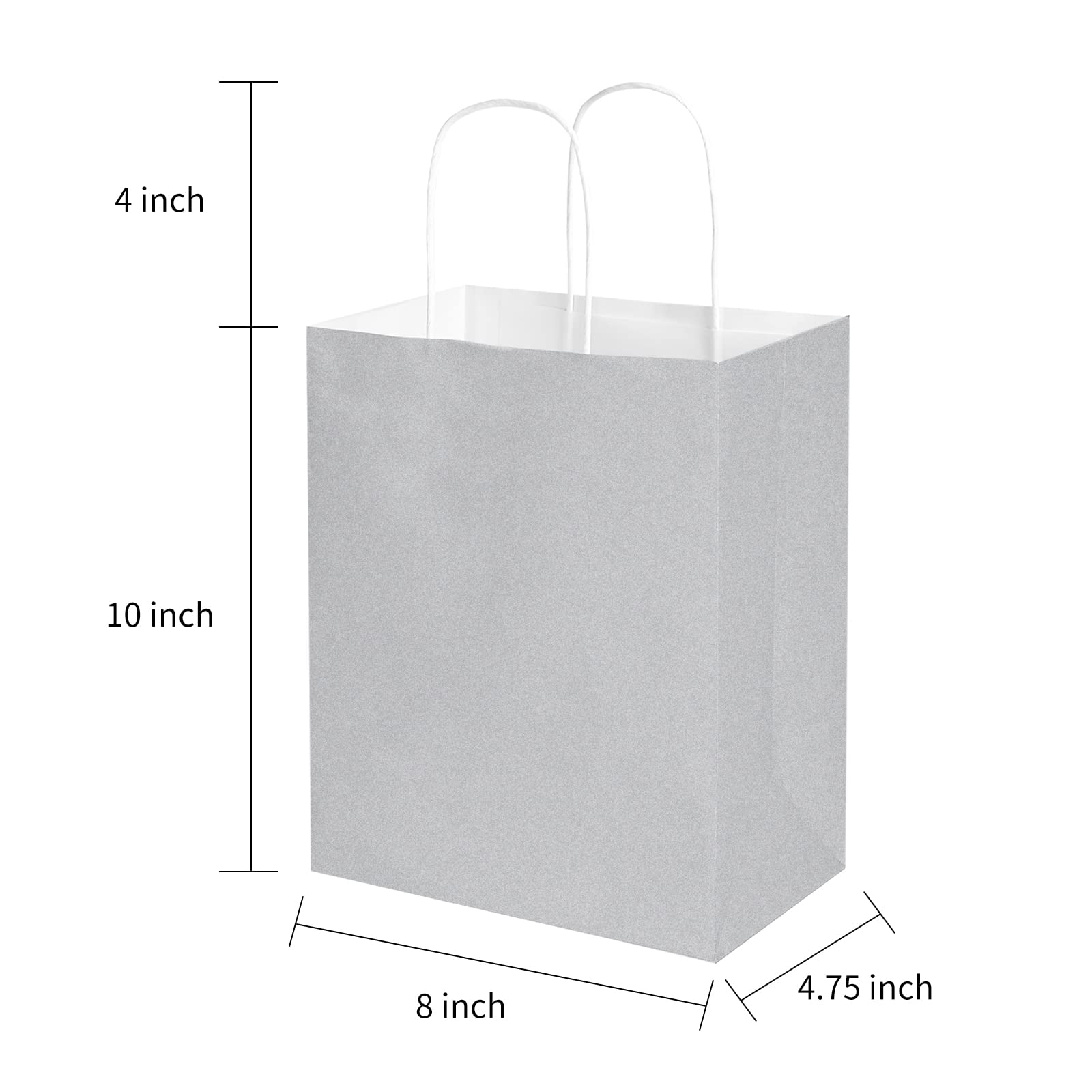 Oikss Silver Grey Kraft Paper Bags Shopping Bag,Kraft Bag with Handles for Gifts,Natural Party Retail Craft Silver Grey Bag Product specifications Thickness of paper:100GSM PAPER GIFT BAG SIZE:8x4.75x10 inch Handle length:4 inch WEIGHT CAPACITY:8 lbs, Bag,Kraft Bag with Handles Paper bag with handles Kraft bag bulk Medium craft bags silver grey craft bags