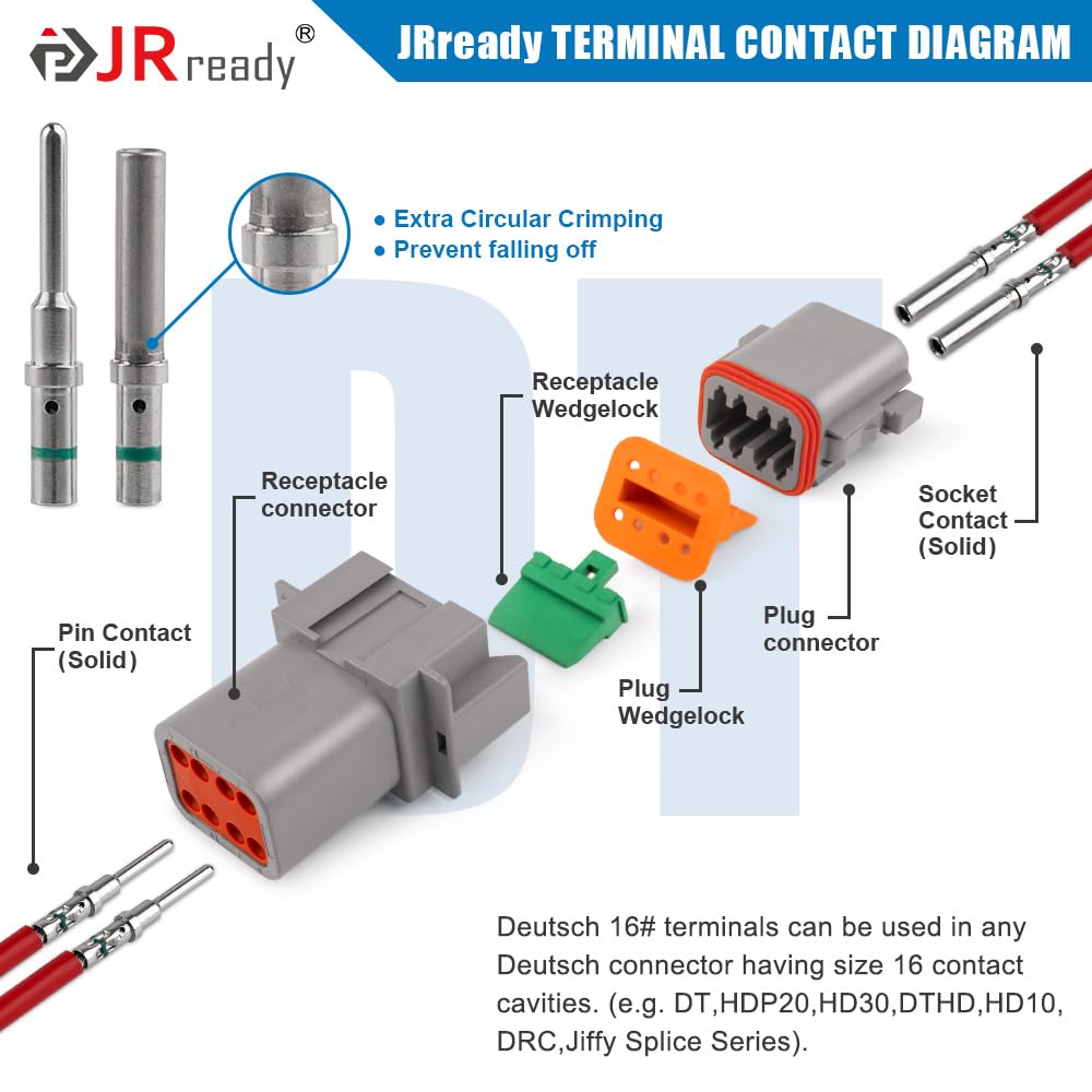JRready Precise Size 16 Solid Contacts: Each 13A(MAX), wire size range 14–20 AWG, tinned copper(nickel plating and tinned copper end). Both crimping and soldering can be used to connect components, increasing solderability and reducing crimping resistance.