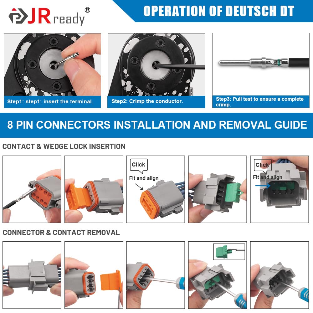 Applicable Crimping Tools: Recommended JRready ACT-DT1 crimping tool. This Deutsch pin crimping tool is suitable for crimping 12# 16# 20# turned pin/socket contacts.