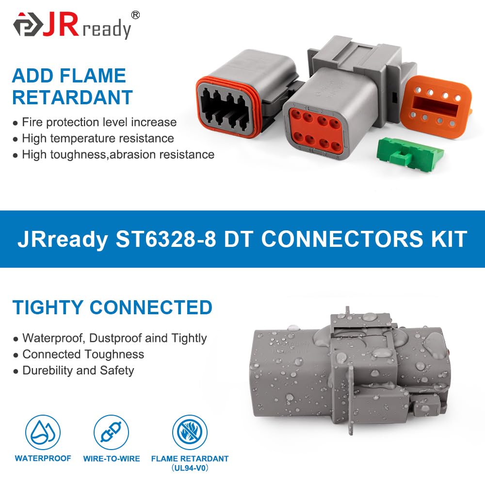 8 Pin DT Connector Versatility: JRready connectors offer reliability and performance widely used in truck, bus, off-highway, construction, agriculture, mining, emergency vehicles, forestry, recreational marine, motorcycle on the engine or transmission, under the hood, on engine controls, solenoid interfaces or in the cab.