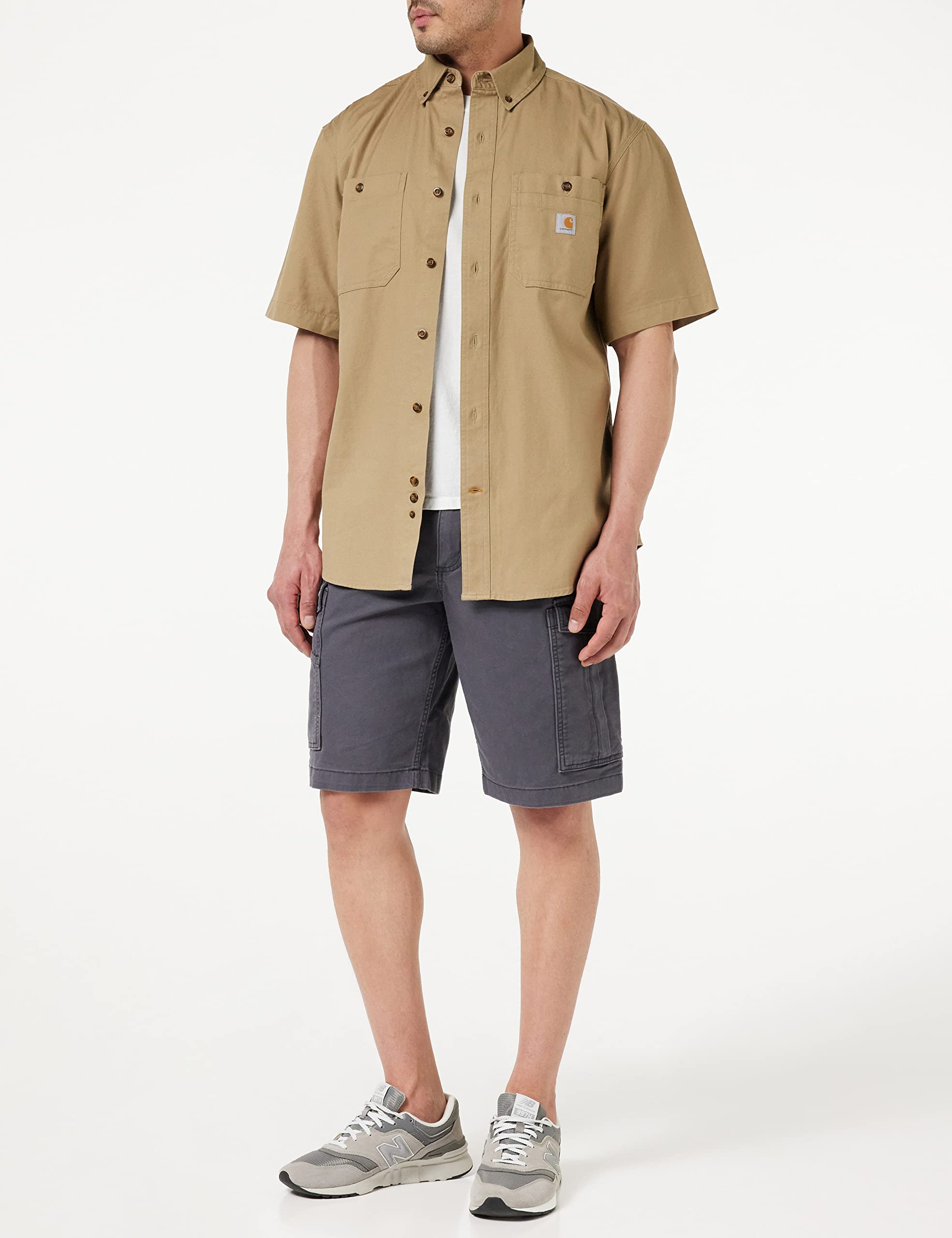 Description Built to move, these men's Carhartt shorts are also rugged enough to handle the demands of your work day. They're made from durable midweight canvas with a relaxed fit. They've got side, back, and cargo pockets, including secure storage for your phone. 8-ounce, 98% cotton / 2% spandex canvas. Built to move with Rugged Flex® stretch technology #Relaxed Fit: Comfortable fit through the seat and thigh with more room to move. Strong sewn-on-seam belt loops. Left-leg hook-and-loop cargo pocket with cell phone compartment. Right-leg hook-and-loop cargo pocket with utility pocket