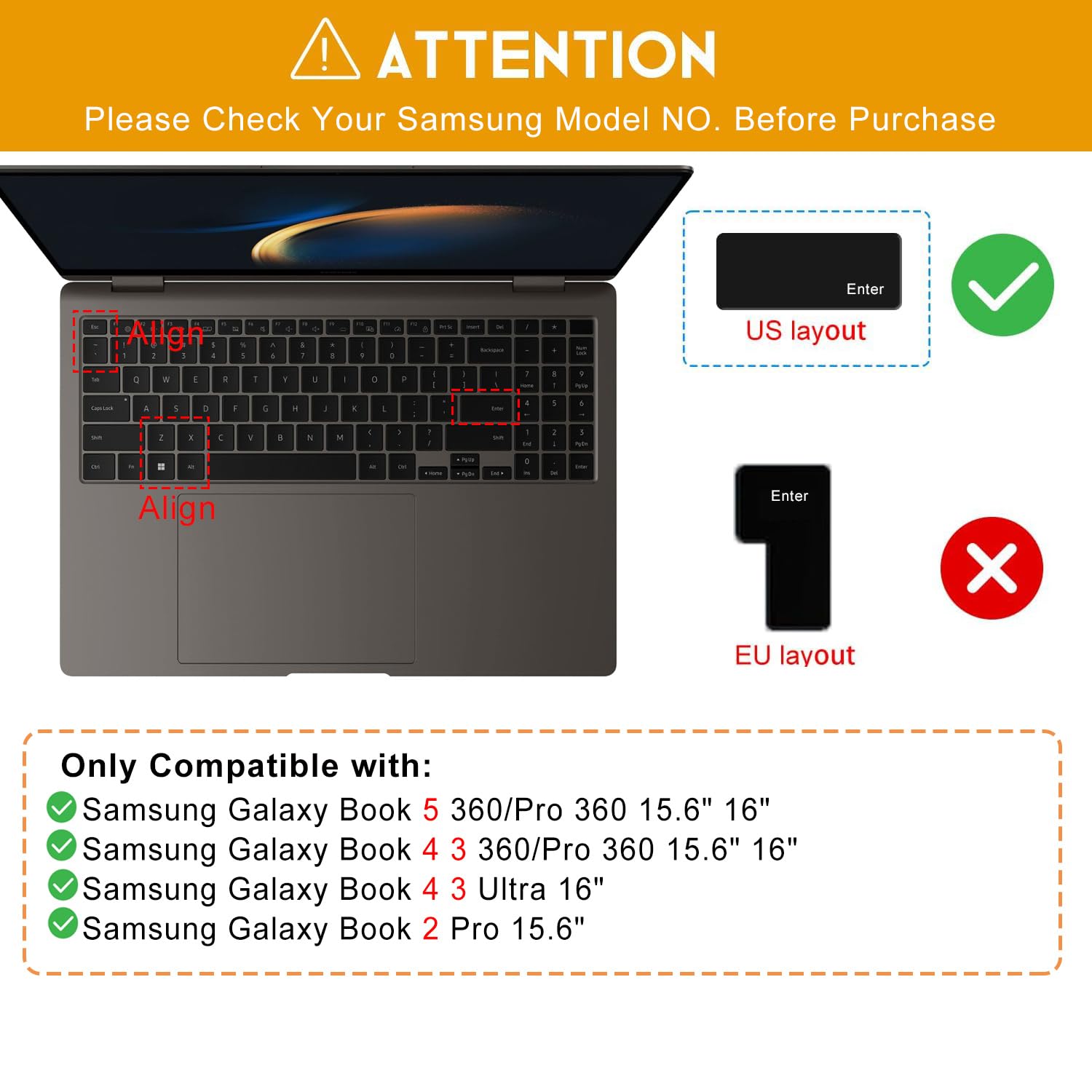 【COMPATIBILITY】 - Designed for 2025 Samsung Galaxy Book 5 360 / Galaxy Book 5 Pro 360 15.6" & 16" | 2024 2023 Samsung Galaxy Book 4 15.6" / Galaxy Book 4 360 15.6" / Galaxy Book 4 Pro 360 16"/ Galaxy Book 4 Ultra 16" / Galaxy Book 4 Pro 16" | Samsung Galaxy Book 3 Pro 360 16" NP964XFG NP960XFG | 2022 2021 Samsung Galaxy Book 2 Pro 15.6" Laptop NP950XED NP950XDB |Samsung Galaxy Book Pro 360 15.6" AMOLED Touch-Screen Laptop. Samsung Galaxy Book Pro 15.6 Keyboard Cover Protector. (US Keyboard Layout Only, the shape of "Enter" key is like the "Rectangle"), ❌❌❌Not Fit Galaxy Book 5 Pro 14