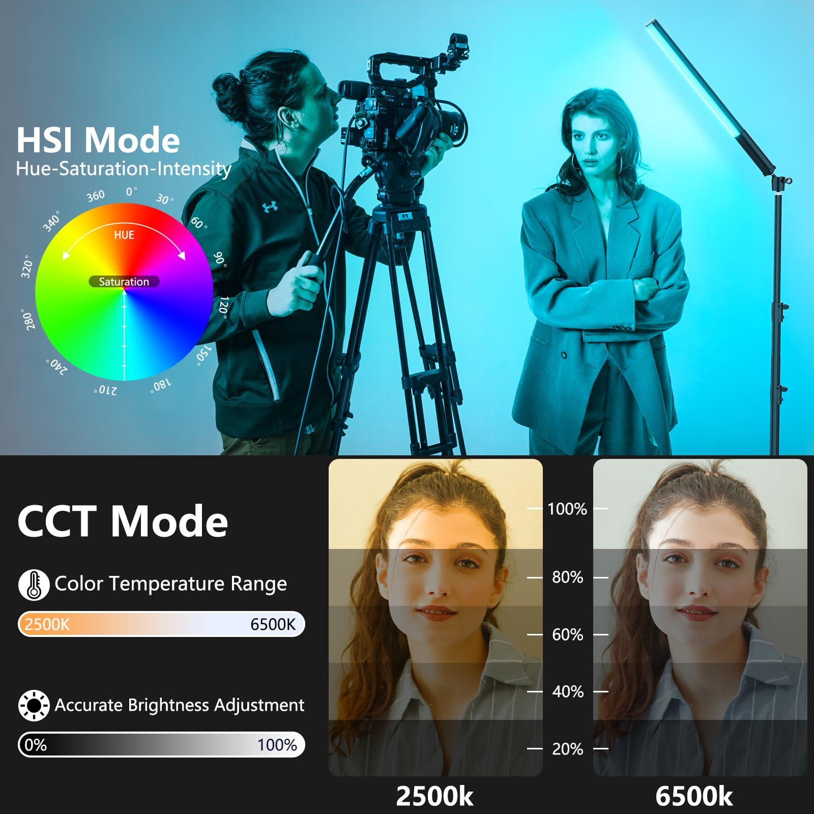 【RGB & CCT & Scene Mode】 LED video light stick equips with LCD display for accurate readings, aiming to reach visualization of parameter adjustment. Hue adjustable from 0° - 360° multi color, brightness from 1%-100% dimmable, color temperature is adjustable from 2500K(warm) to 6500K(cold). And 12 dynamic light effects can adapt to different scenes.