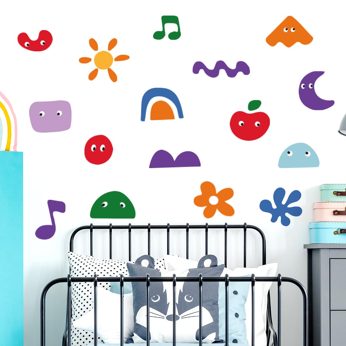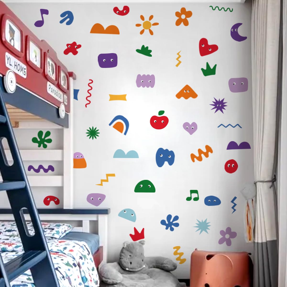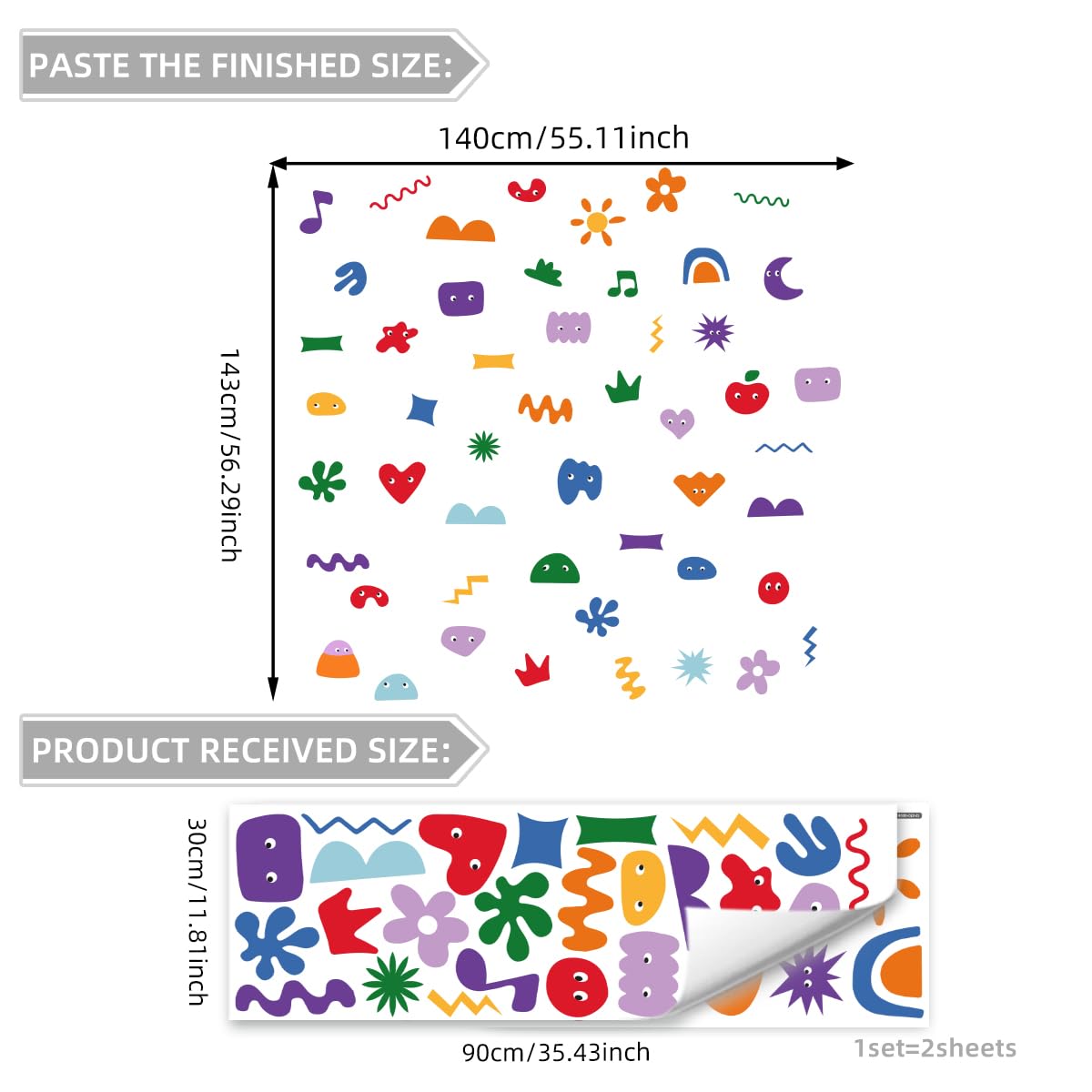 Package Contents: The complete set includes 1 sheet of colorful geometric-themed wall decals featuring dozens of abstract patterns such as stars, waves, hearts, flowers, and irregular color blocks. All elements can be freely combined and applied to fulfill one-stop whimsical wall decoration needs.