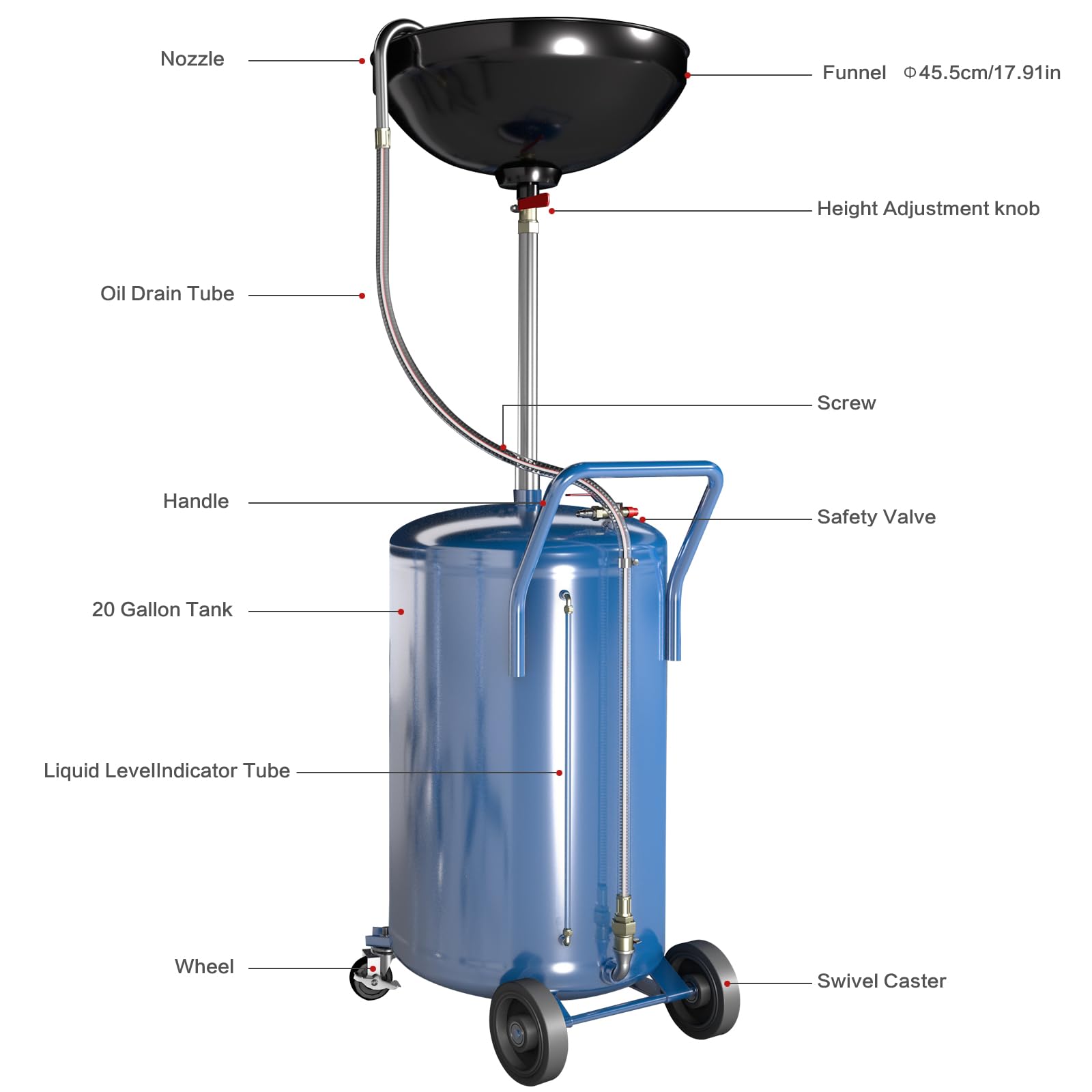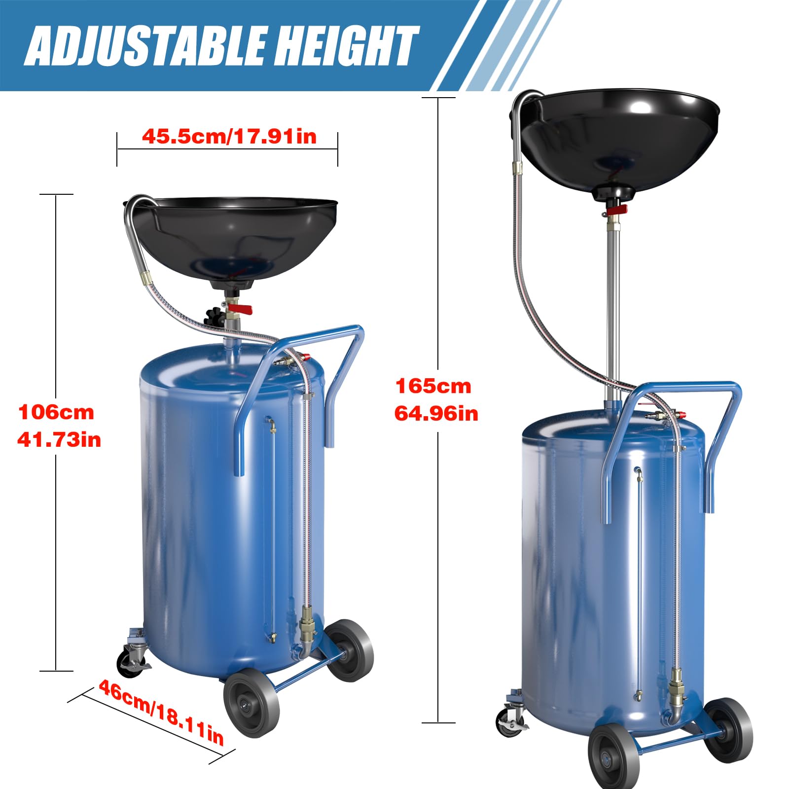 【Height Adjustable】LARBANKE oil drain tank are height adjustable from 42‘’ to 65‘’, making them ideal for draining vehicle fluids on lifts, and oil drain tank are equipped with two advanced fixed wheels and two swivel casters for greater manoeuvrability and mobility.