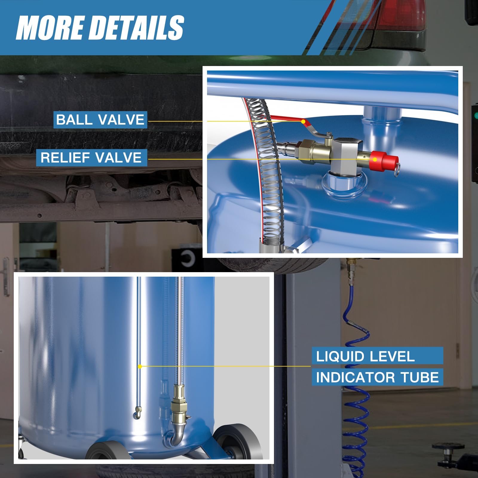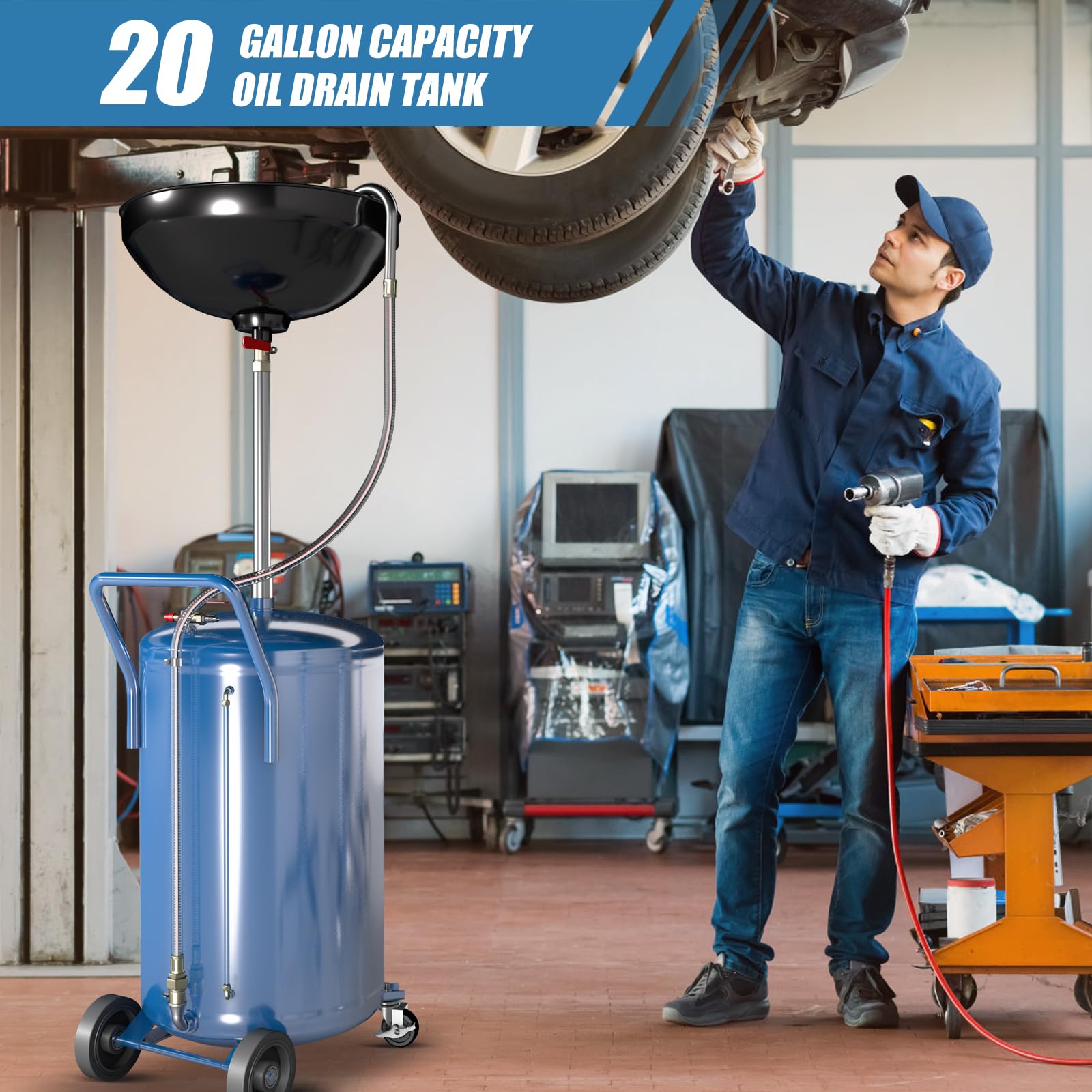 【20 Gallon Capacity】LARBANKE waste oil drain tank has a capacity of 20 gallons and can collect waste oil from 8-10 vehicles. The oil drain works on a pneumatic principle to drain waste oil from the tank in a short period of time.