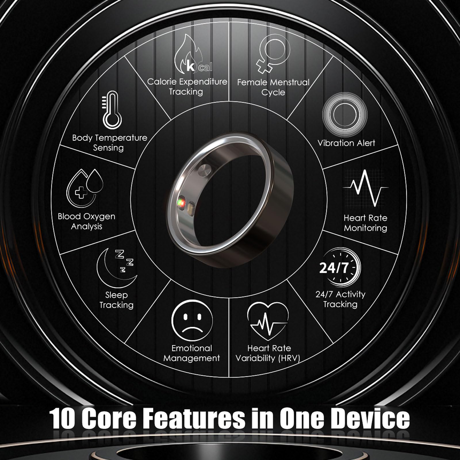 Multi-Sport Tracking :AI algorithm tracks basal body temperature (BBT) to predict menstrual cycles and ovulation with 95% accuracy. Automatically detects and records 10+ activities (running, yoga, swimming) while measuring calories, steps, and distance. During workouts, the ring monitors heart rate zones and vibrates to warn against overexertion. Post-activity HRV analysis suggests optimal rest periods.