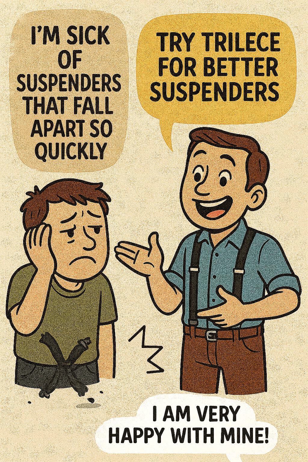 EASY WEAR COMFORTABLE: Trilece Mens Womens Suspender smooth edge shape braces provide a relaxed snug fit that wouldn't dig into your skin or damage your outfit. Synthetic leather crosspatch gives a solid Y-Back look and strong hold up for that special day. Updated heavy-duty clips superbly provide that hold so your pants, shorts, or trousers will never fall off.