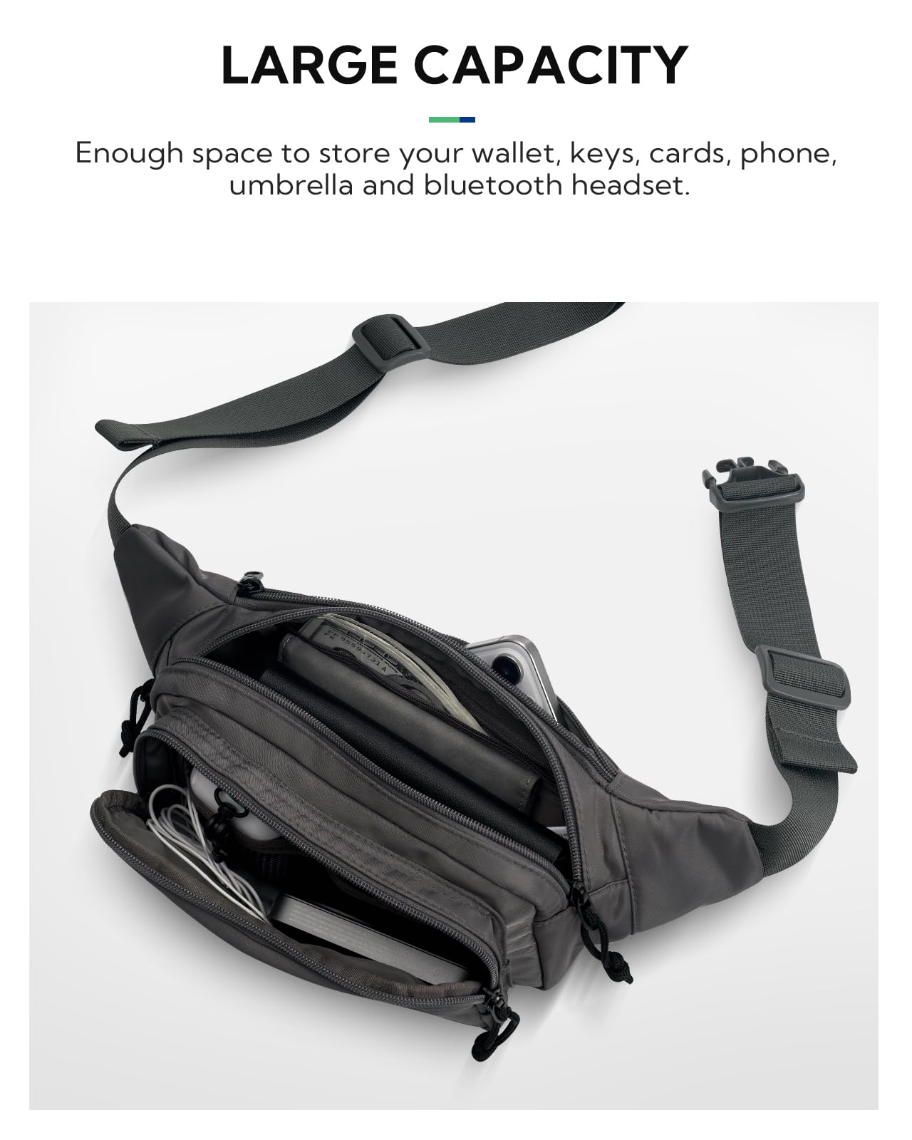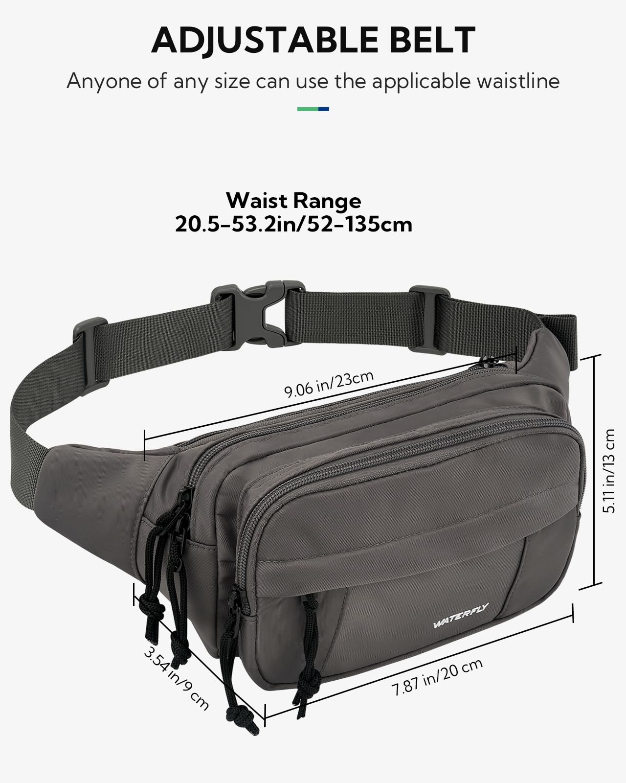Roomy & Adjustable Strap: The size of large waist pack is 9.06 x 5.11 x 3.54 in, it can hold your mobile phone, cards, cash, passport and umbrella, meets all your storage need. A flexible strap ranges from 31.49-49.21 in, fit your waist even better