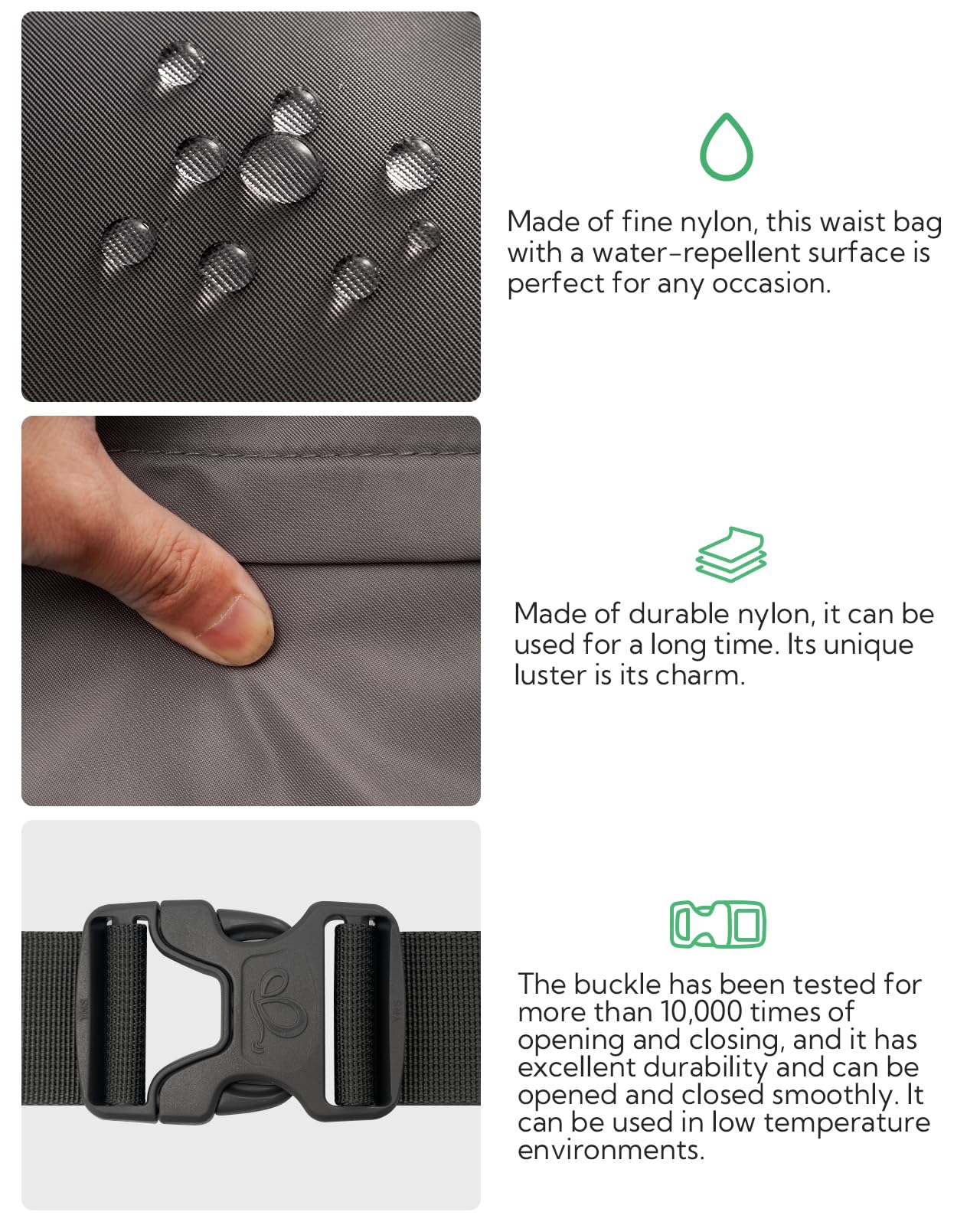 Premium Material & Sturdy SBS Zipper: Hiking waist bag is made of high-quality nylon material, durable and breathable, fine workmanship and tight stitching. Smooth zippers ensure users to quick access to the items, preventing items from falling