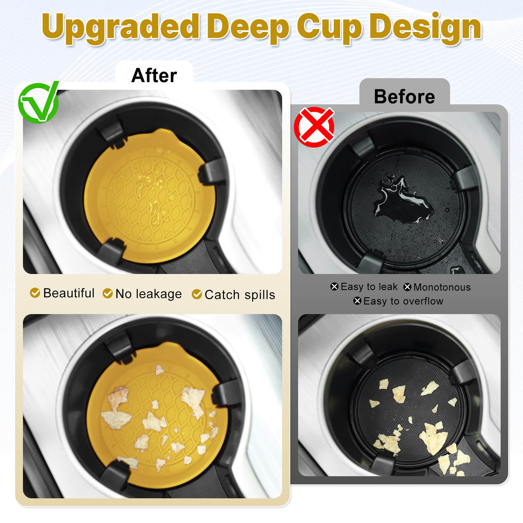 Protection Function: Our car cup holder coaster has a carry handle design and a stand-up ring edge on its edge to effectively prevent food crumbs, drinks and water from leaking out and preventing the car cup holder from getting dirty.Meanwhile,Thickened design effectively prevents the cup holder from being scratched by the cup when driving on bumpy roads and eliminates the annoying thumping sound, making your journey more enjoyable.
