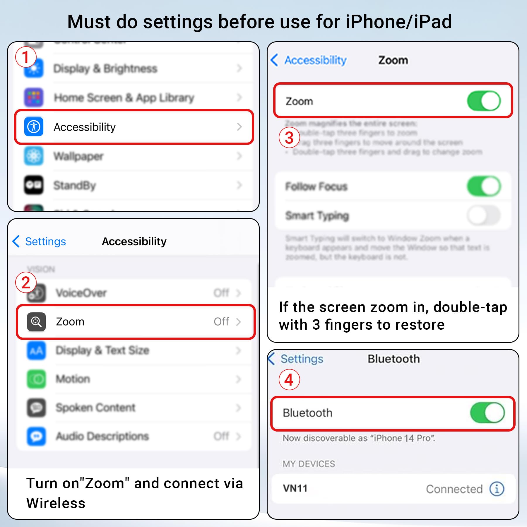 【Zoom in & out】This remote shutter with zoom feature (Must open zoom in accessibility setting for iPhone/iPad) can help you easily zoom in and out from a distance when taking photos and videos, bringing great convenience and making your shooting more professional.