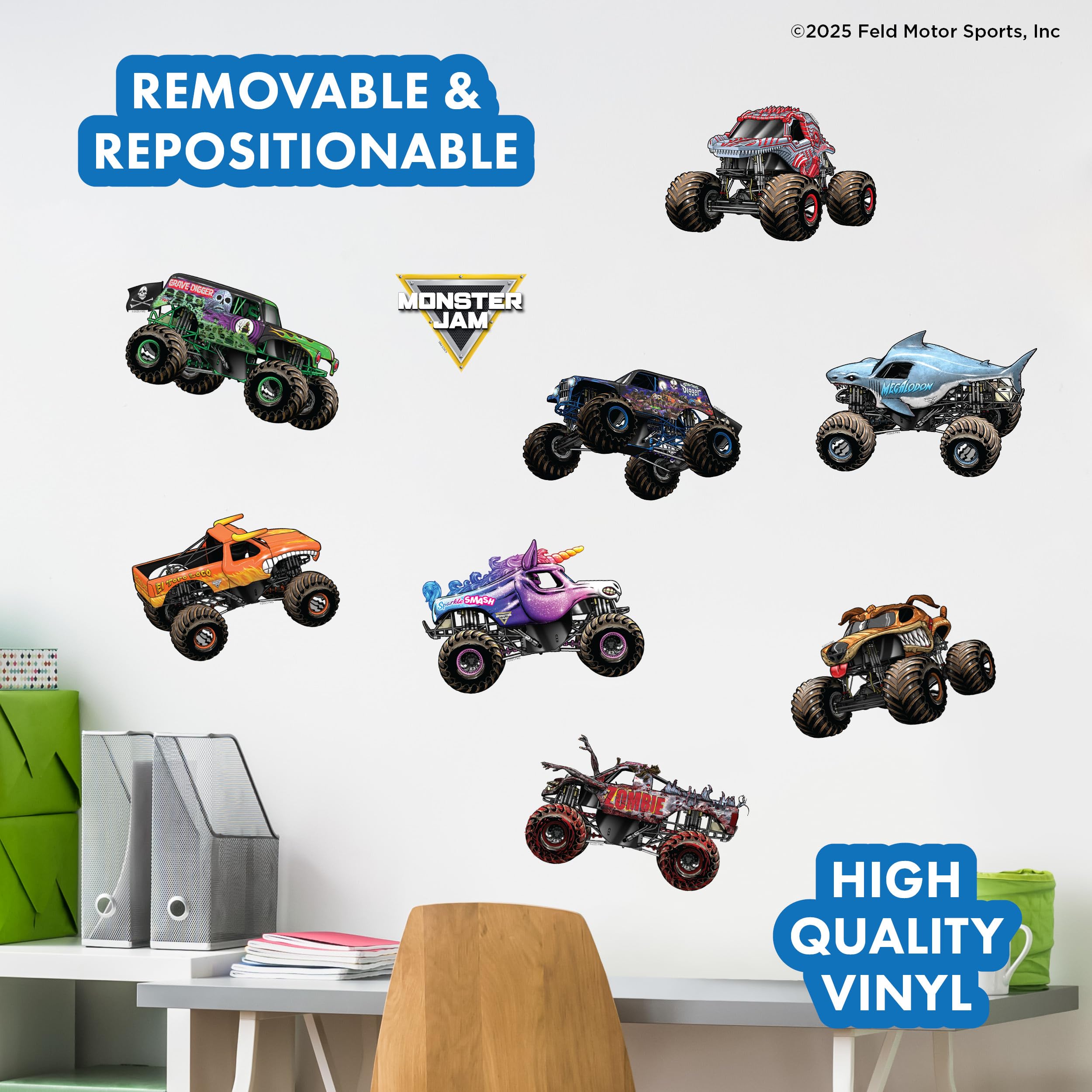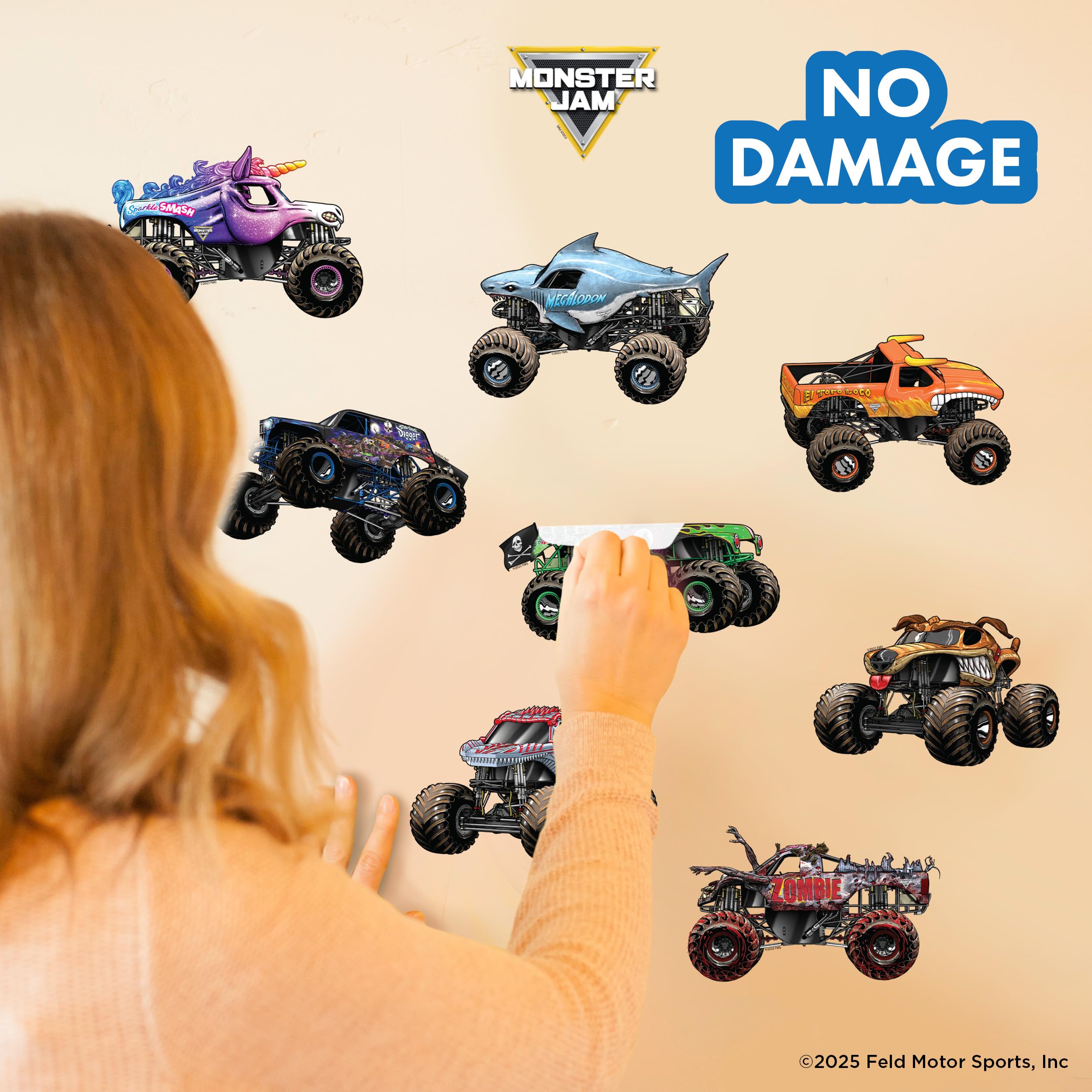 Safe for Multiple Surfaces - Our Monster Jam stickers aren't just for walls, they can be applied to doors, mirrors, furniture, laptops, or any smooth surface. They’re repositionable and remove cleanly, so you can rearrange your epic Monster Jam scene without leaving sticky residue or damage. Bring the adrenaline-pumping excitement of Monster Jam to bedrooms, playrooms, or even man caves.