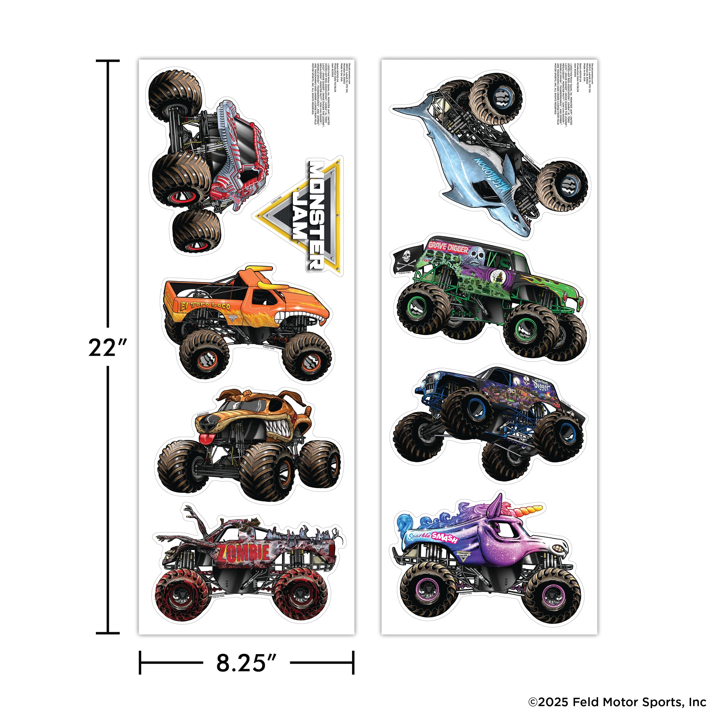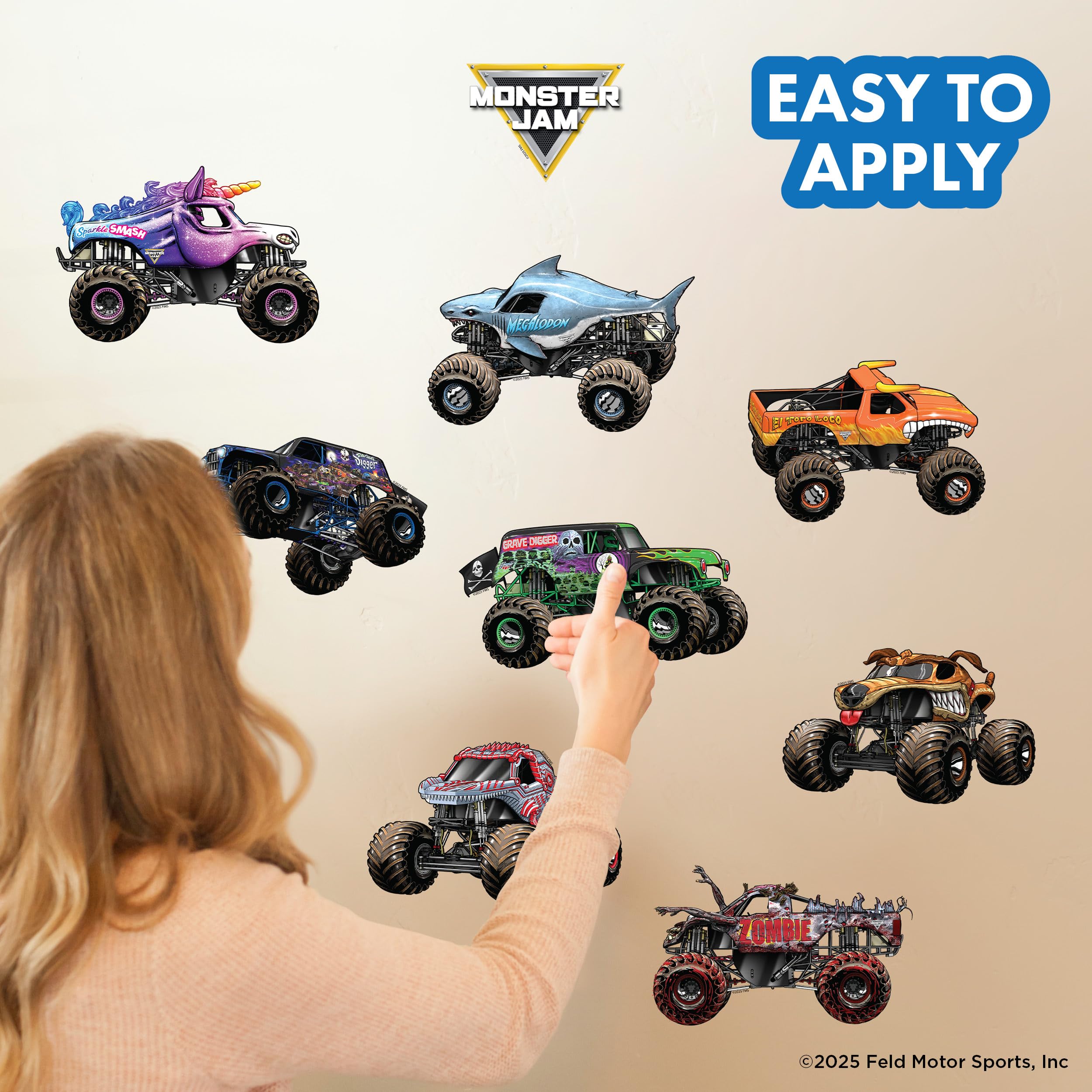 Turn your walls into an action-packed Monster Jam arena with this Monster Jam Wall Decal Set! Featuring the iconic Monster Jam logo and 8 high-energy trucks—Grave Digger, Son-Uva Digger, El Toro Loco, Megalodon, Zombie, ThunderROARus, Sparkle Smash, and Monster Mutt—this set is designed to bring the thunder of the track to your home. Each truck decal measures approximately 7.5" wide, showcasing every intricate detail, from Grave Digger’s iconic green flames to the jaw-dropping design of Megalodon. The bold, colorful artwork perfectly captures the personality of each truck, making your walls come alive with Monster Jam energy. These decals are crafted in the USA with premium materials for lasting quality and vibrant colors. They stick easily to smooth surfaces like walls, mirrors, or doors and are just as simple to remove or reposition, leaving no sticky residue behind. Whether you’re creating a monster truck-themed bedroom, adding excitement to a playroom, or surprising a Monster Jam superfan, this wall decal set is the perfect way to celebrate the heart-pounding thrills of Monster Jam. Gear up and let the monster-sized adventure begin!