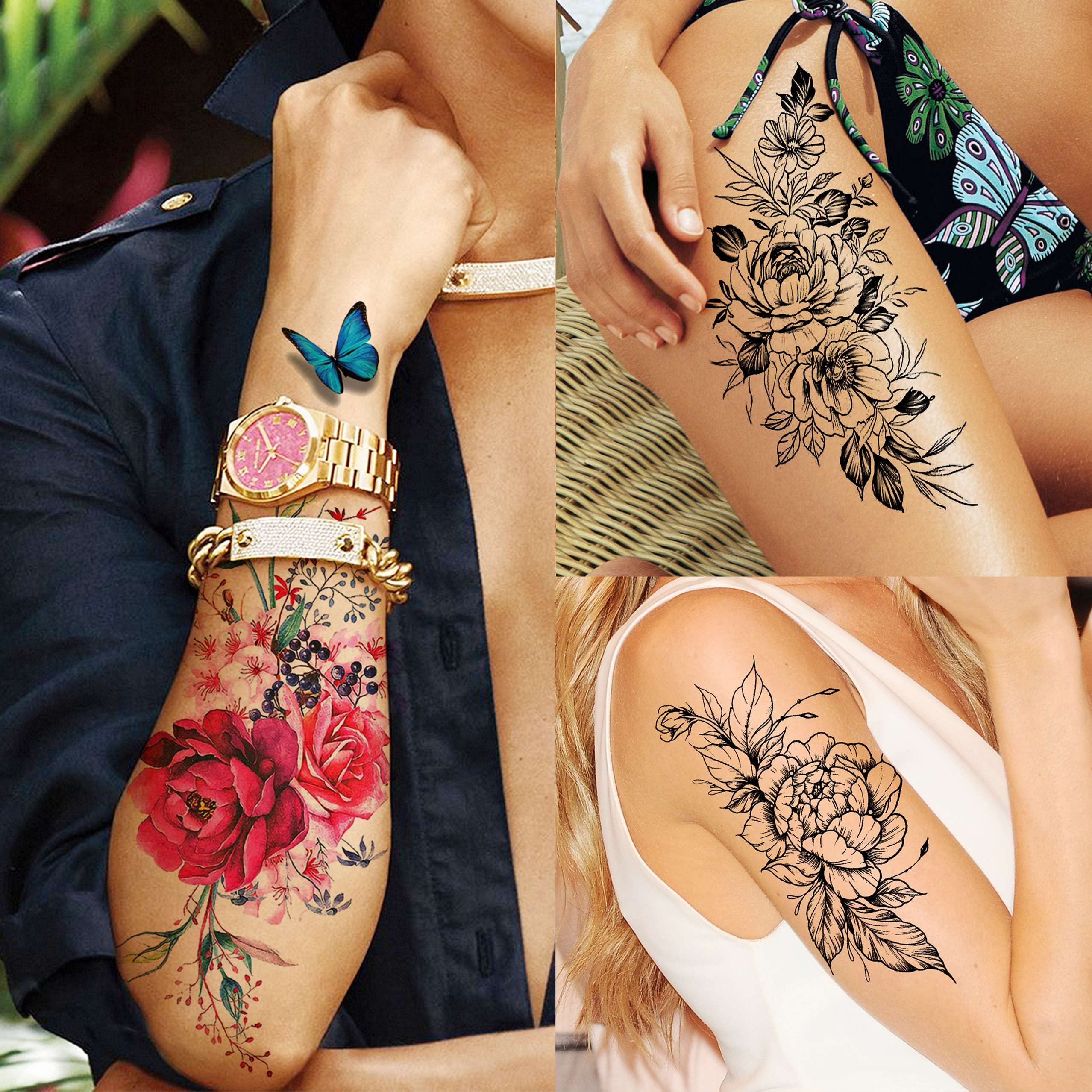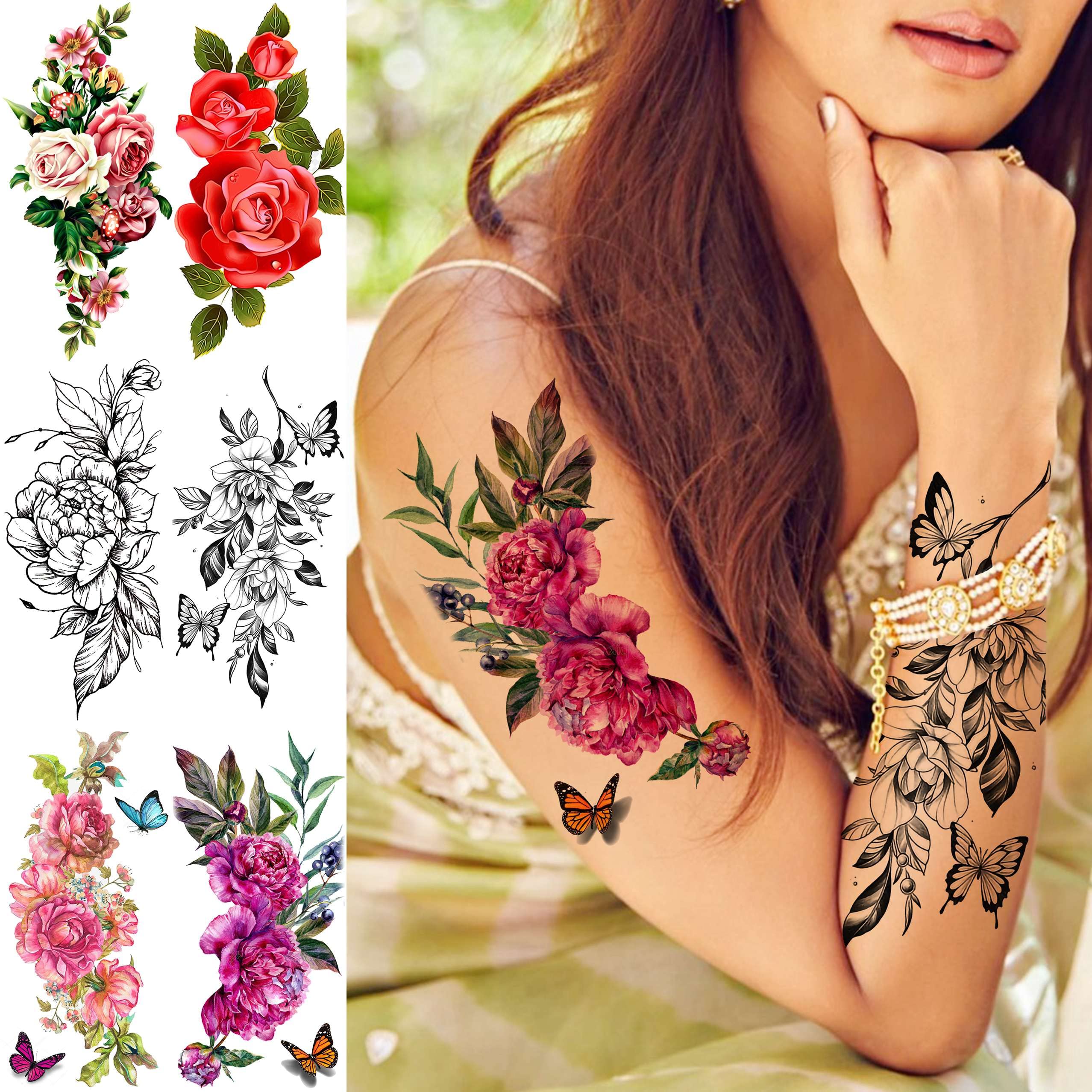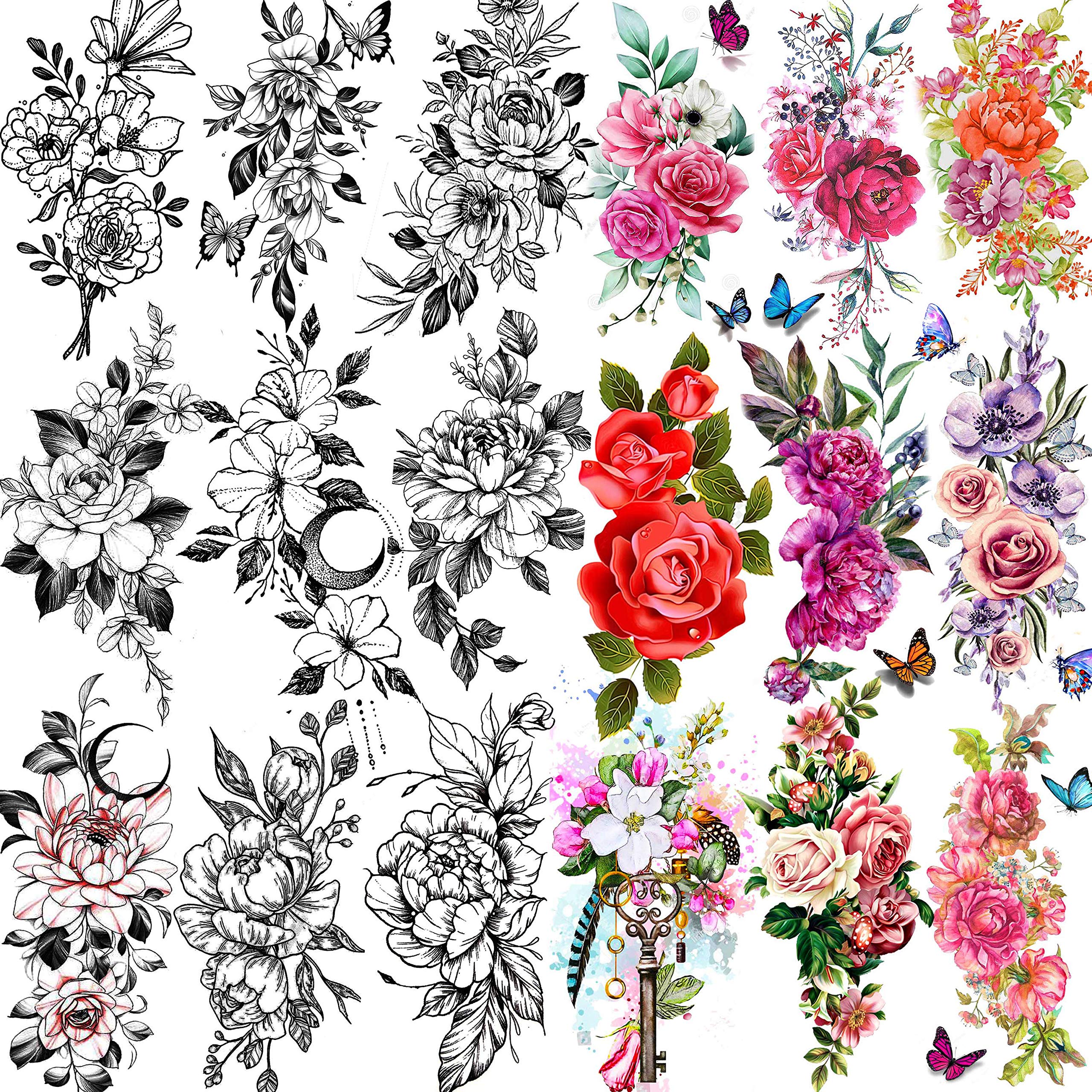 🐳[ALL 18 Sheets Popular Patterns in One Package] - Original Brand of TASROI Sexy Black Rose Flower Temporary Tattoos For Women and Kids Adults. There Are 18 Sheets High Quallity Big Large Temporary Tattoo Stickers In Each Package, Fake Tattoo Temporary Dahlia Peony Tulip Cherry Glory Blossom Moon Carnations Vines Plants Daffodil Leaf Leaves Blooming Butterfly Black Floral Sketch Orchid Temporary Tattoos For Kids Lady Female.