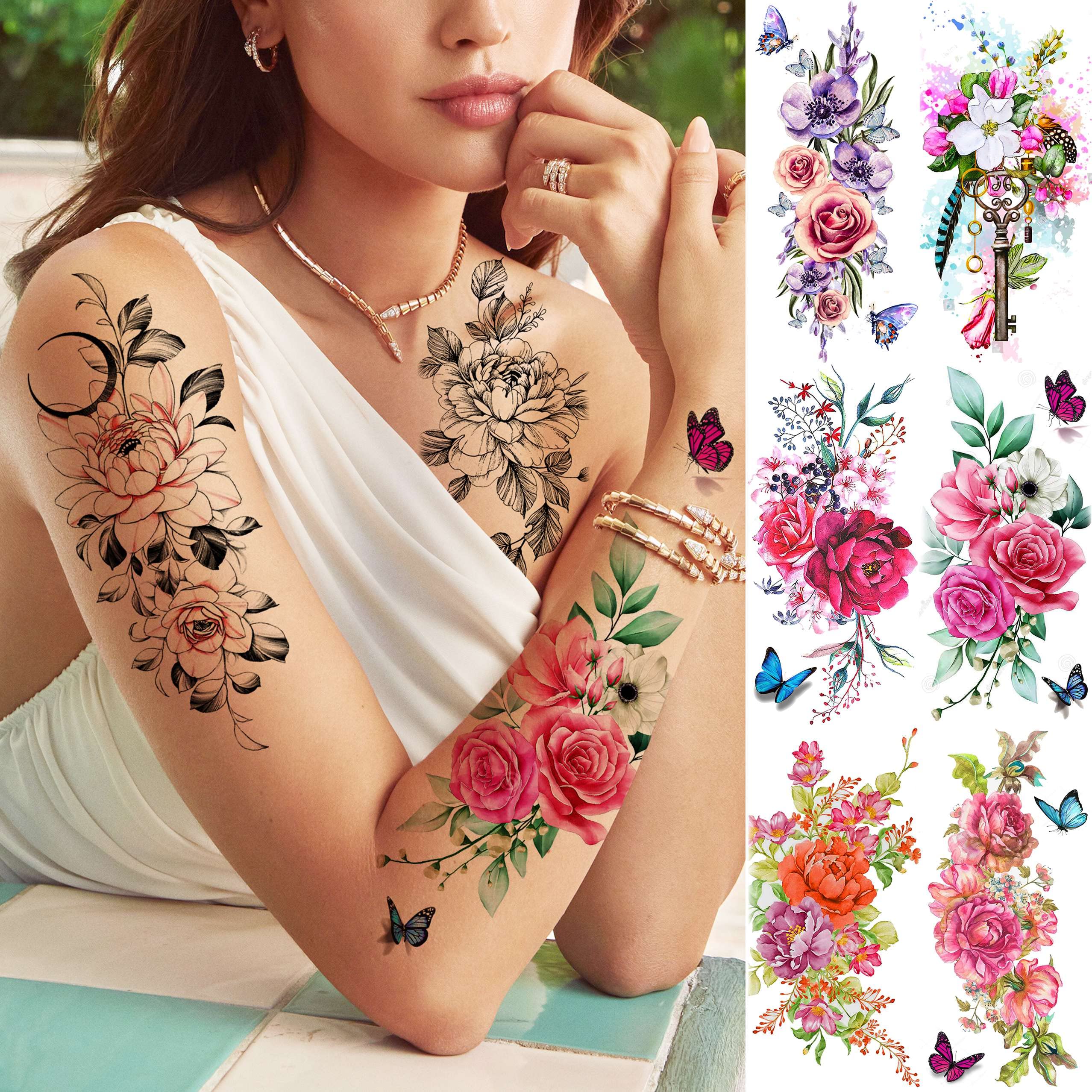 Brands of TASROI Temporary Tattoos For Adults and Women Makes You Attractive Beautiful and Colorful Life. TASROI Temporary Tattoos Have High-end Design Team, Scientific Management System, Good Quality Control System, Affordable Price And Satisfied After-Sales Service. We Develop Fashionable Designs And Market-Worthy Tattoos With High Efficiency. Be Confident To Choose Us! Package Includes: 18 Sheets 19x9CM 7.4"x3.5" Temporary Tattoos for Kids Adults Women Feature: 1.Can Use In The Skin, Metal Ceramics, Glass Surface, Bottle Decor, Cup. Do Not Apply To Sensitive Skin, Near Eyes Or If Allergic To Adhesive. 2.Printed Designed Patterns, Color Bright And Looks Realistic Like Real Tattoo. 3.Very Good Choice As Temporary Tattoo, Body Makeup, And Also It Can Cover Scar On Body. 4.Long Lasting, Waterproof, Easy Wear And Easy Clean. How To Apply: 1.Clean The Part Of Skin That You Want To Apply With Tattoos. 2.Choose Your Prefered Pattern And Cut It. 3.Remove The Transparent Protective Film, Face Down The Paper And Stick It Onto The Skin. 4.Wet The Tattoo Paper Completely With A Towel And Wait For 20-30 Second. 5.Remove The Paper, Let The Tattoo Dry. Your Colorful Tattoo Is Done. How To Remove: Temp Tattoos Could Be Simply Rub Away By Household Alcohol Or Body Oil.