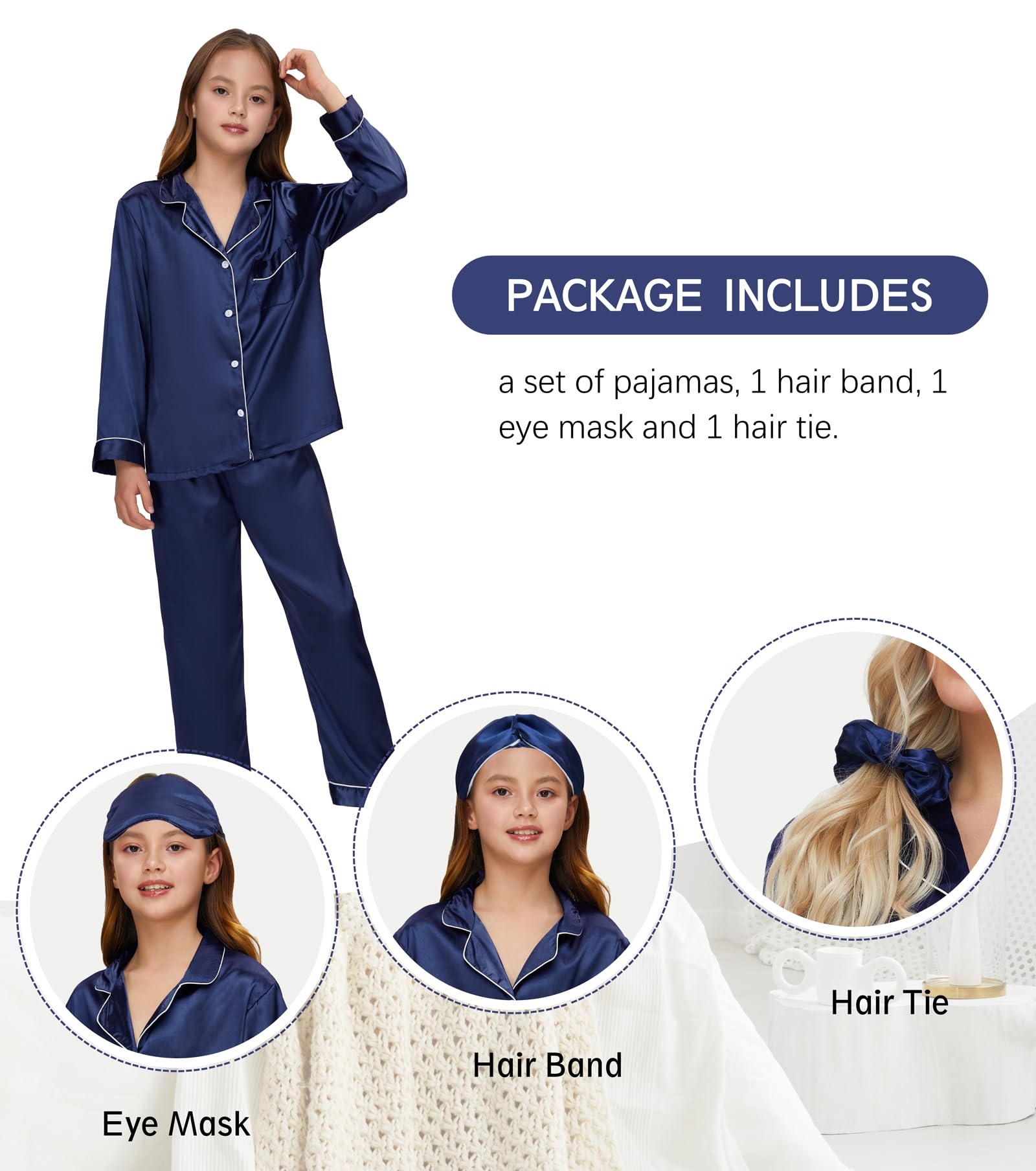 The pajamas set your children not only beautiful look but also smooth, soft and comfortable feeling. Eye masks help children sleep, hair ties and hair bands can be very good to organize children's hair.