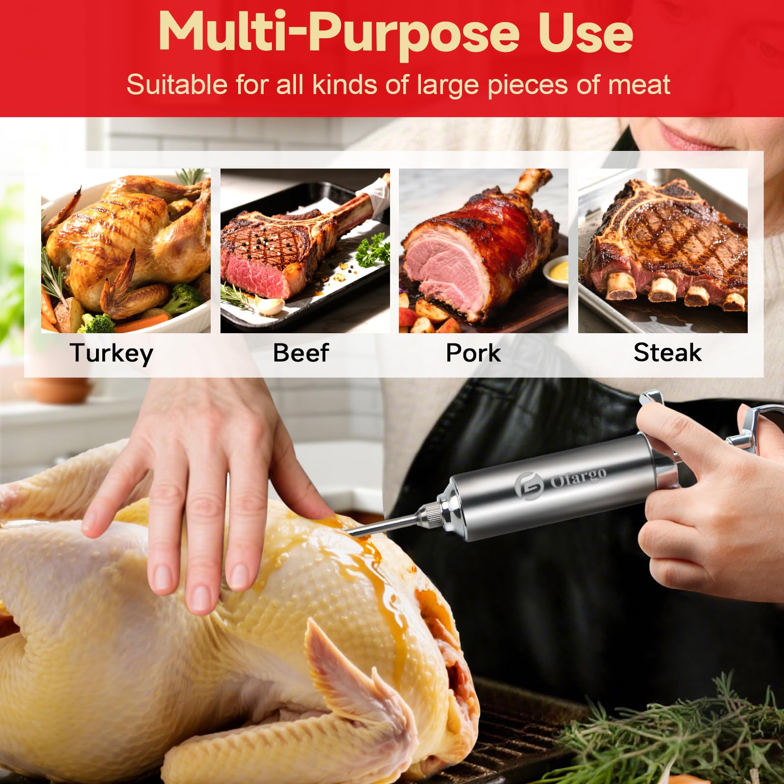 EASY to USE & DISHWASHER SAFE: Ergonomic threaded design, easy to assemble or dismantle. 2-oz large capacity injection barrel minimizes refills; plunger handle offers a comfortable grip and friendly pressure control; 4 interchangeable turkey needles w/ multi-holes for deep penetration and sauce distribution, like chunky marinades or liquid brine