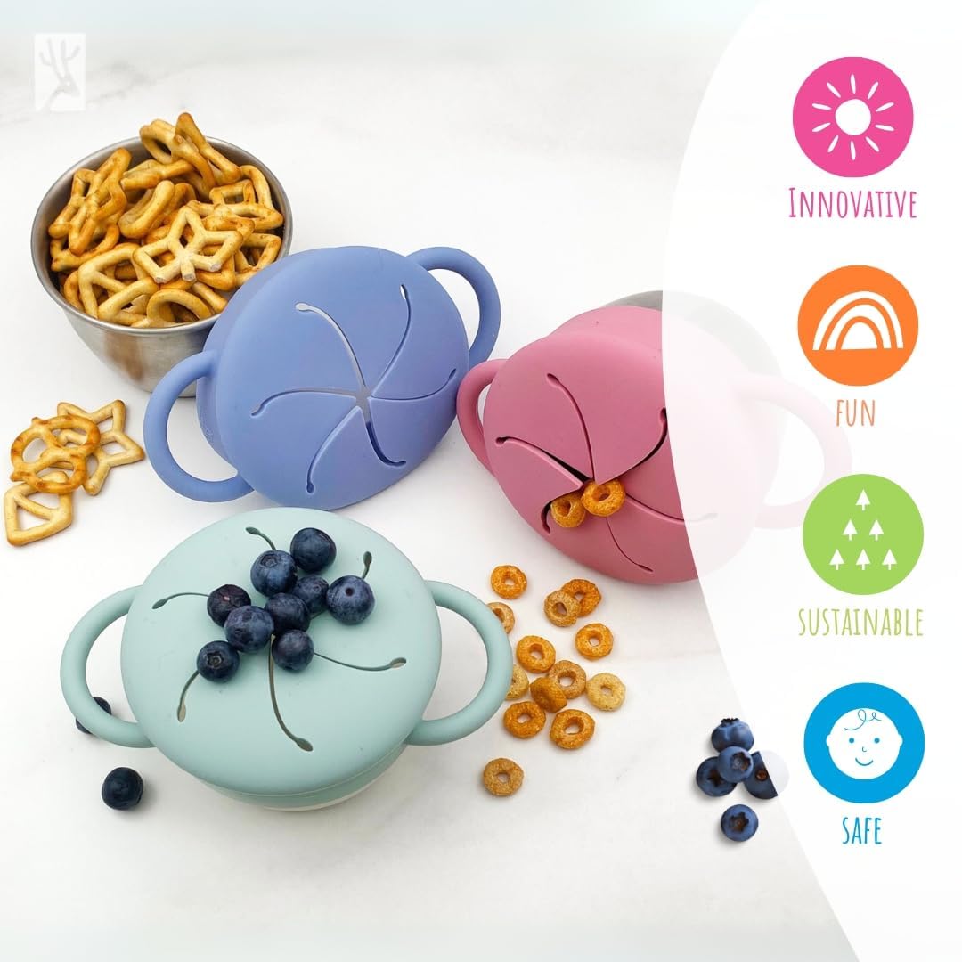 PERFECT FOR EVERYDAY SNACK: With easy grip side handles, these snack cups are made for tiny hands to hold. The soft silicone catcher keeps snacks safely inside. Lightweight and portable, these cups are great for indoor fun or outdoor adventures. Plus, they fit into most cup holders - strollers, car seats, and more.
