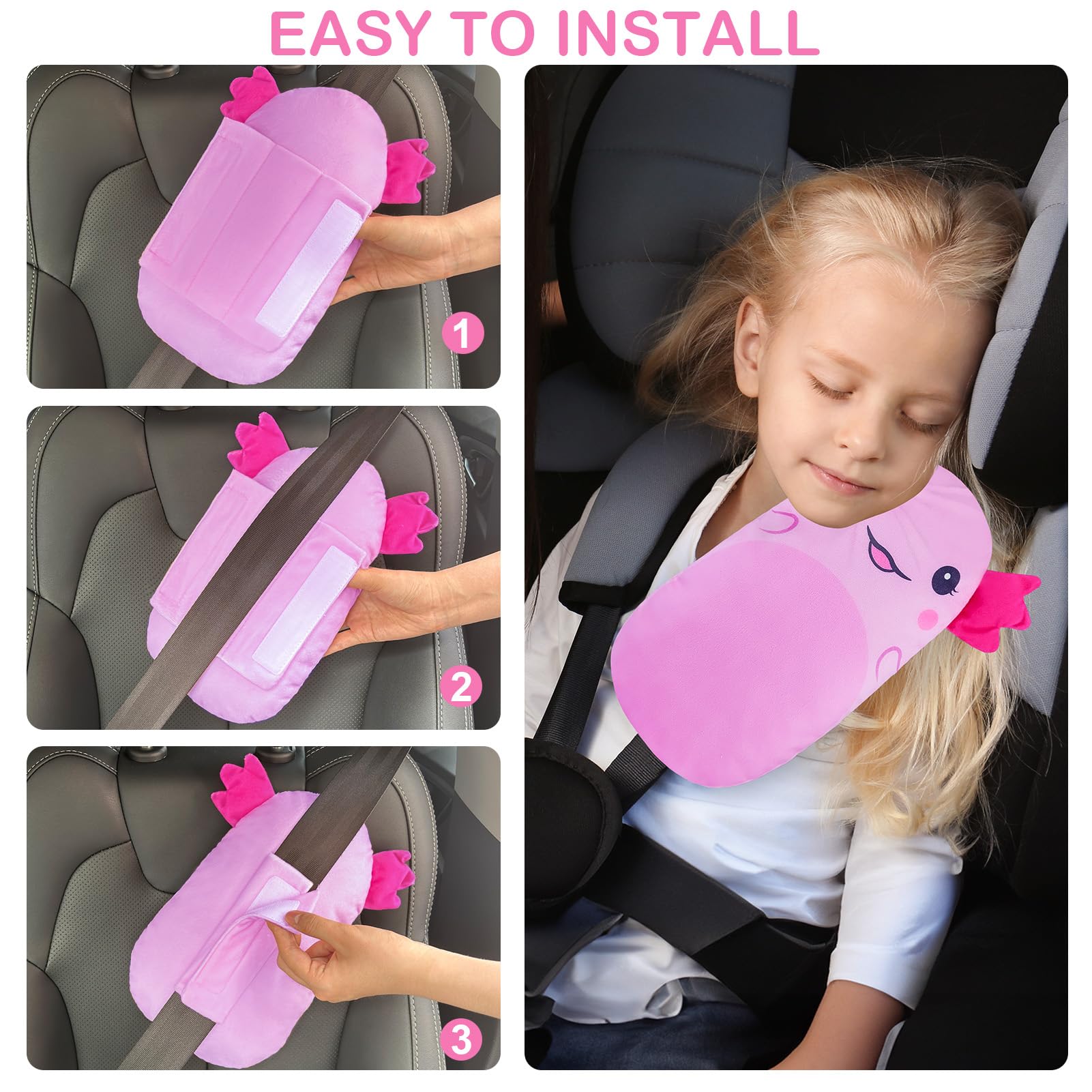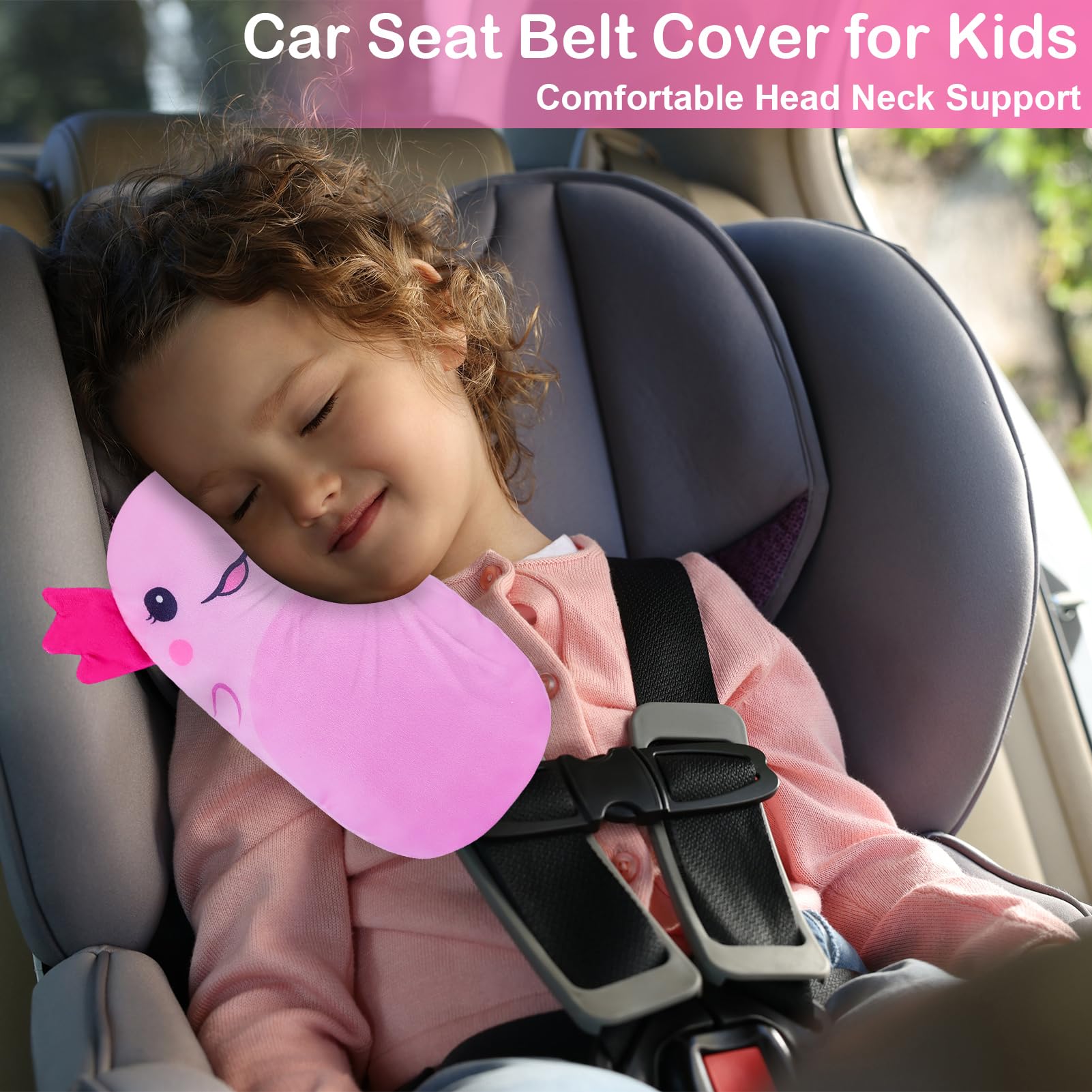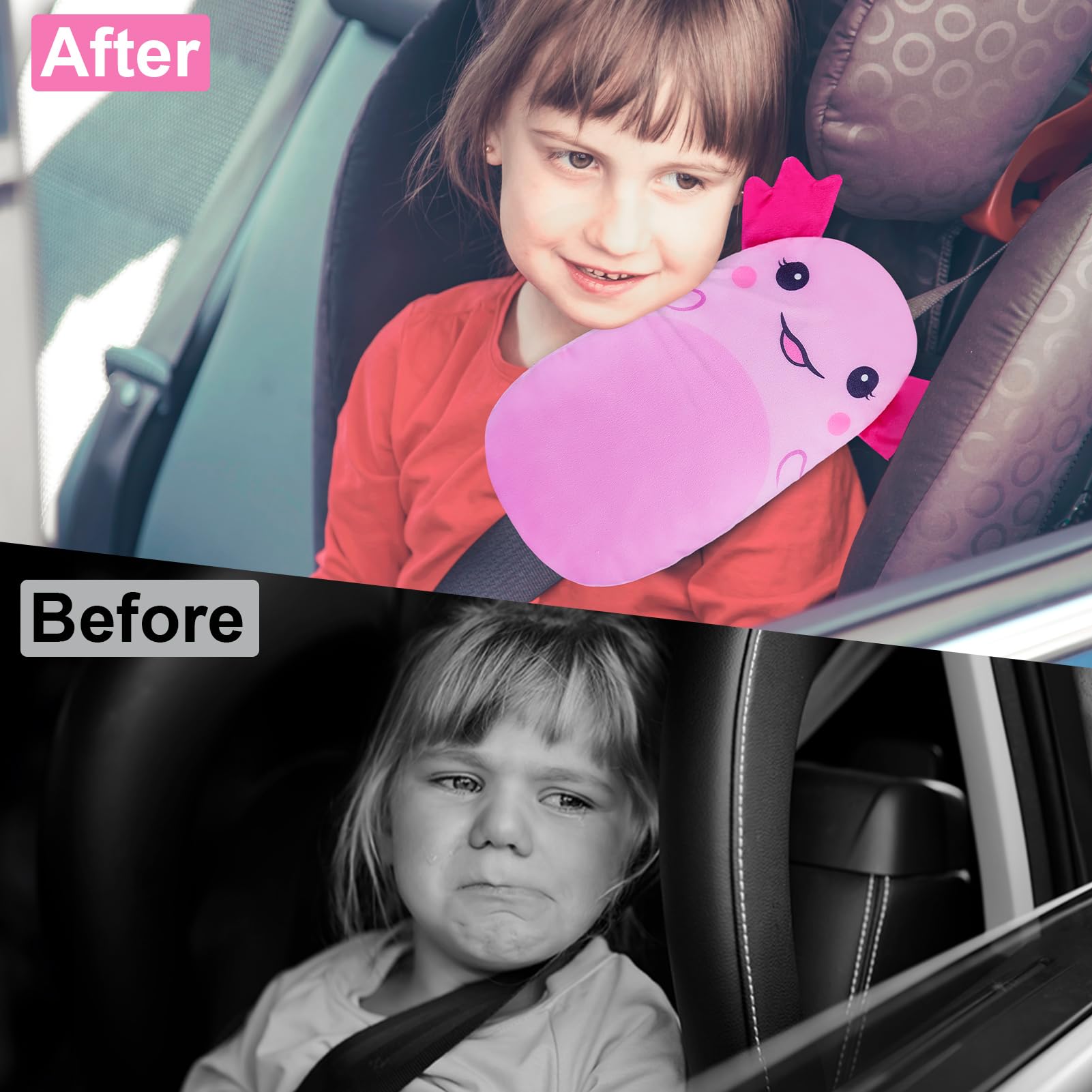 Cute Design: The seat belt cover pads for kids are designed with adorable dinosaur/unicorn/cat and other shapes,with bright colors, popular with toddlers children girls boys; This kids seat belt pillow will make the car travel comfortable and enjoyable