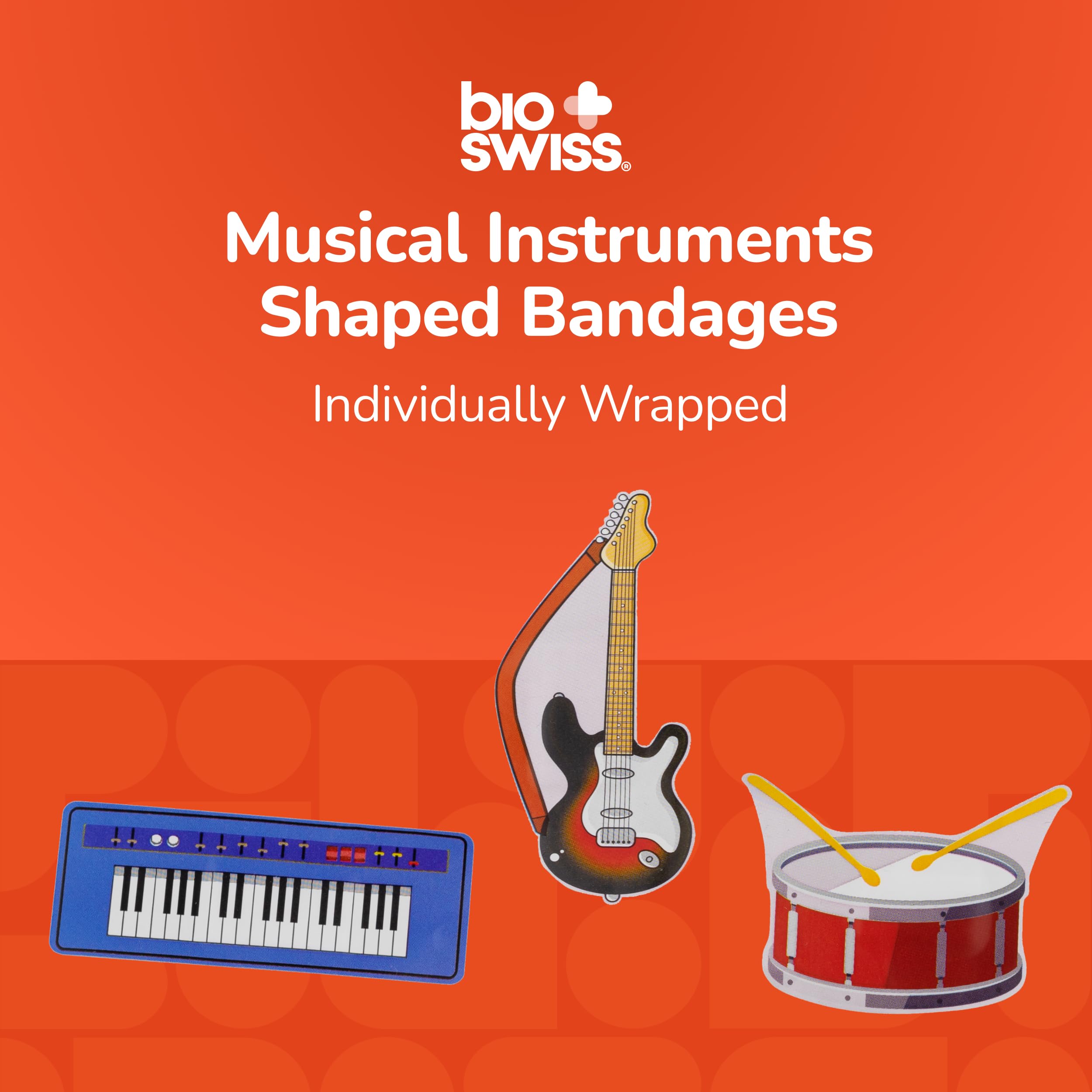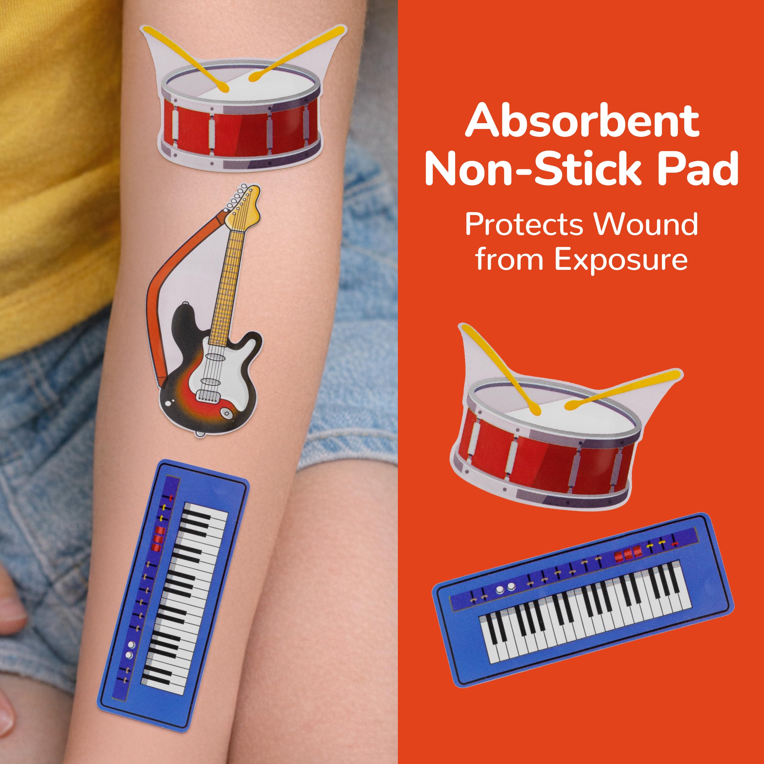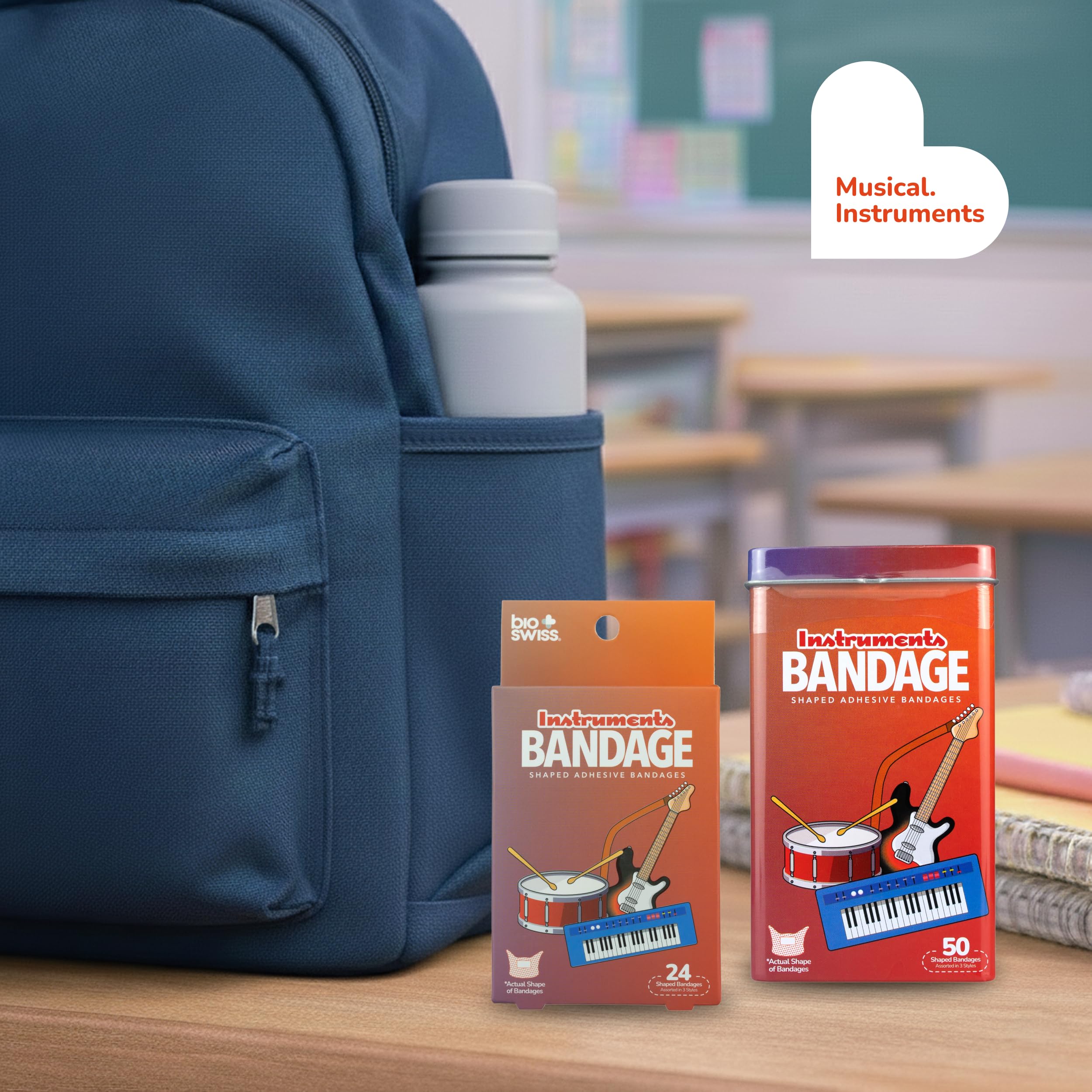 50 MUSIC INSTRUMENT BANDAGES: Musical instruments-shaped adhesive bandages tin helps protect cuts, scrapes, and minor wounds while making healing less stressful; bandages come in 3 assorted styles