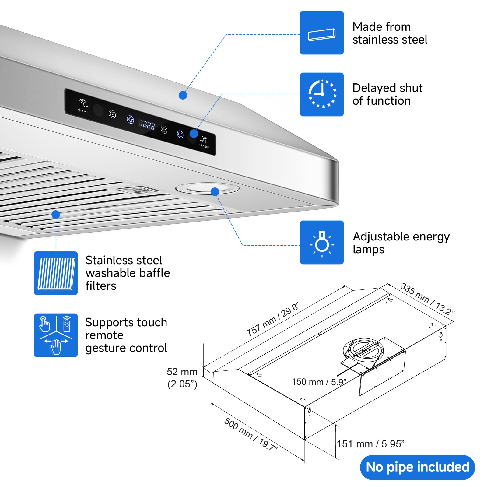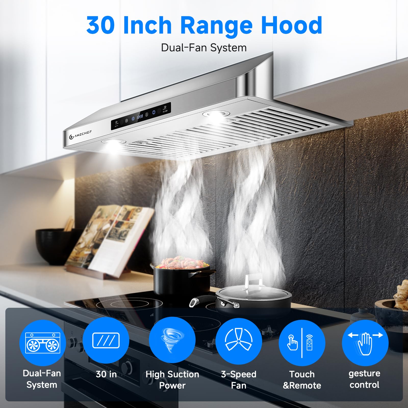【Easy to Assemble/Disassemble】30 inch width AMZCHEF range hood matchs all modern and classic kitchens.Look concise and save space by installing it under the cabinet or wall-mounted. Kitchen extractor product size: 29.8''x19.7''x5.98''. Air outlet diameter: 6''.