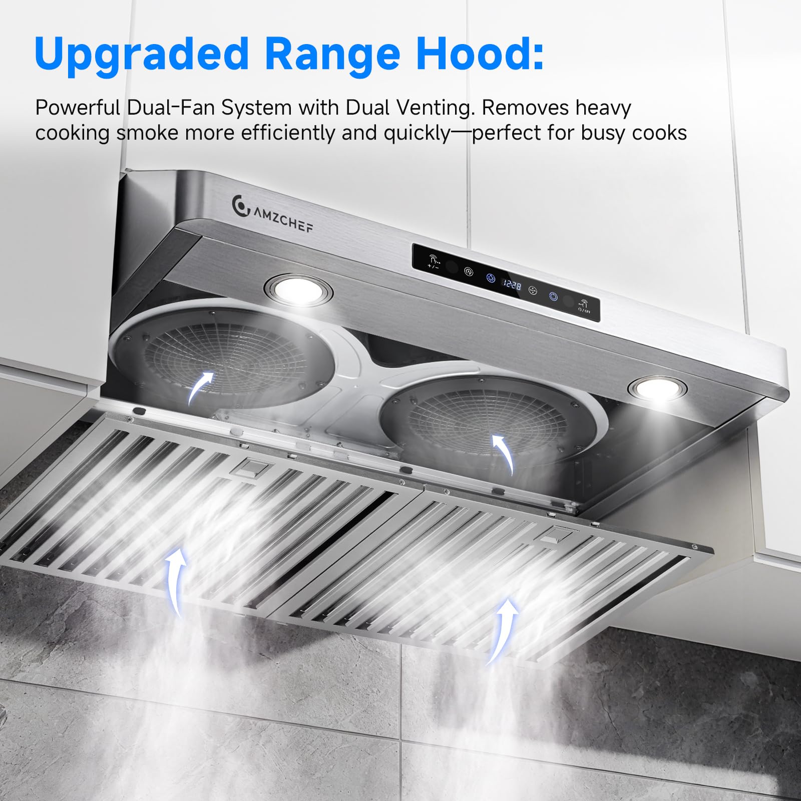 【Advanced Dual Blower System】 AMZCHEF's innovative dual-motor design delivers 30% more suction power than single-fan hoods, while operating 15% quieter. Two synchronized centrifugal fans create vortex airflow that captures smoke/grease simultaneously from Left and right burners - no more uneven ventilation when cooking multiple dishes. The motors ensure 50,000+ hours lifespan with 20% less energy consumption. Perfect for heavy-duty frying or open-flame cooking in kitchens.