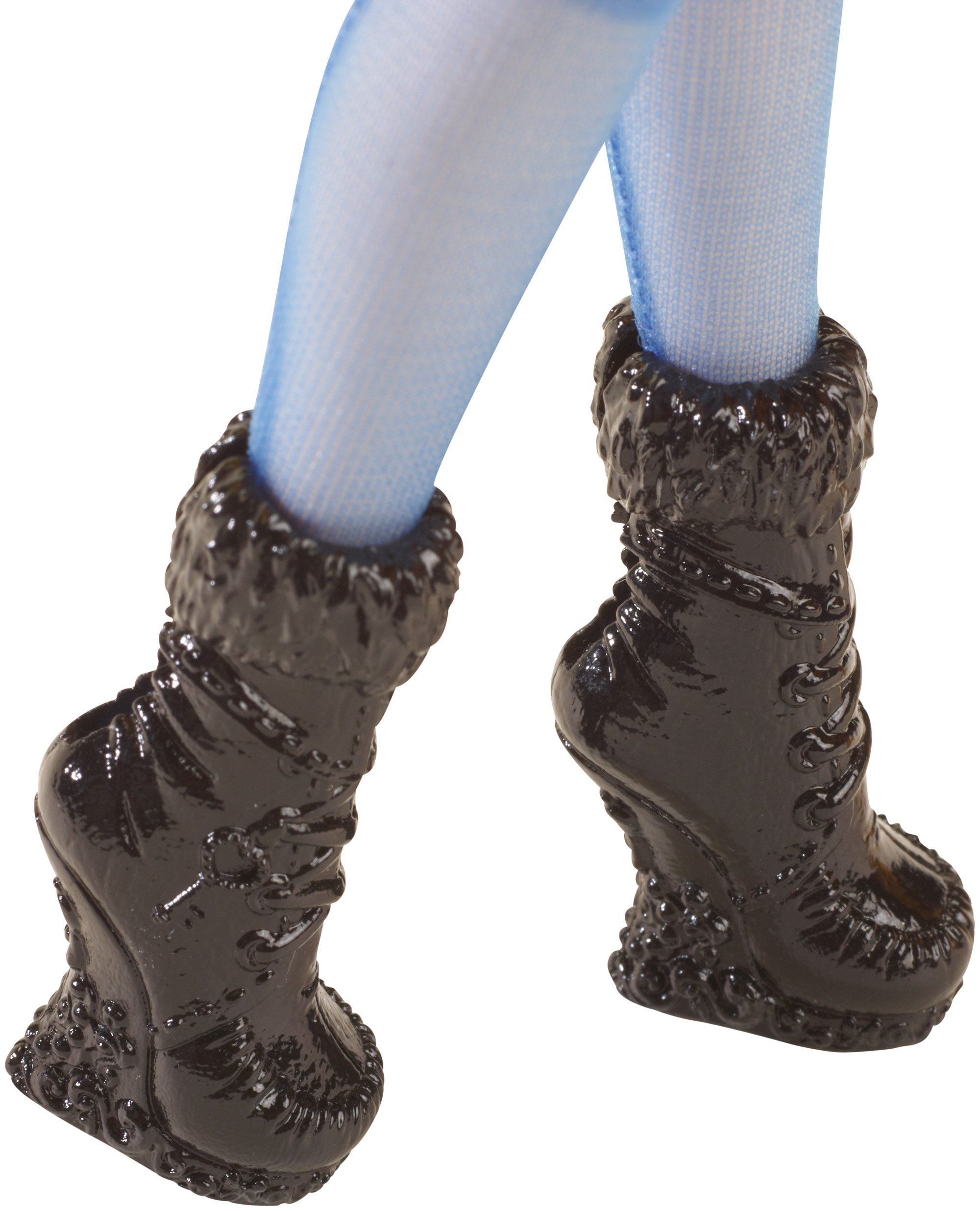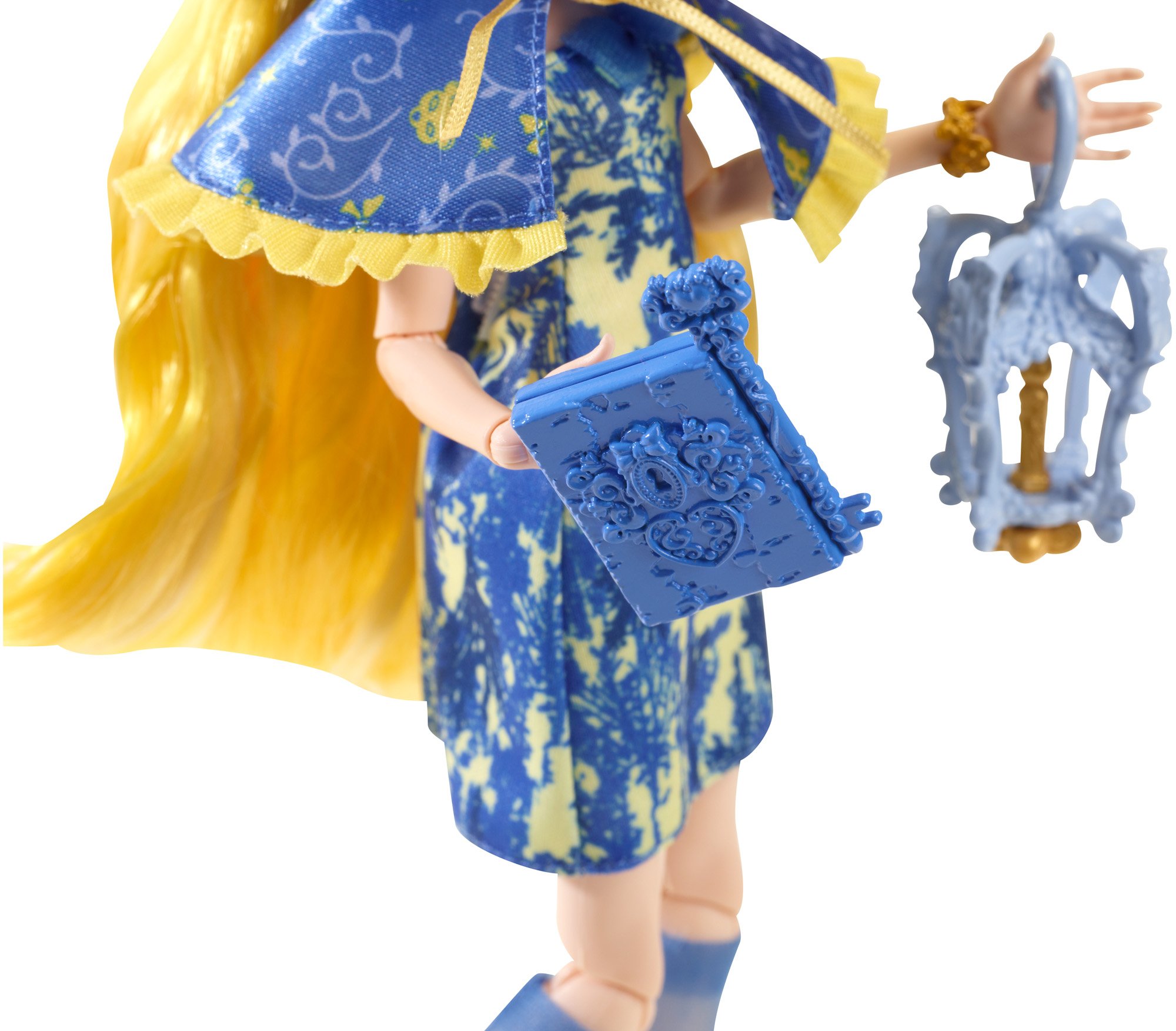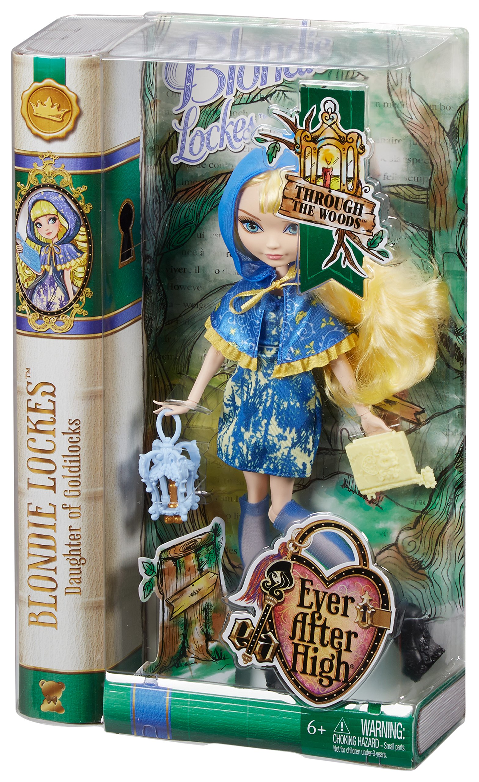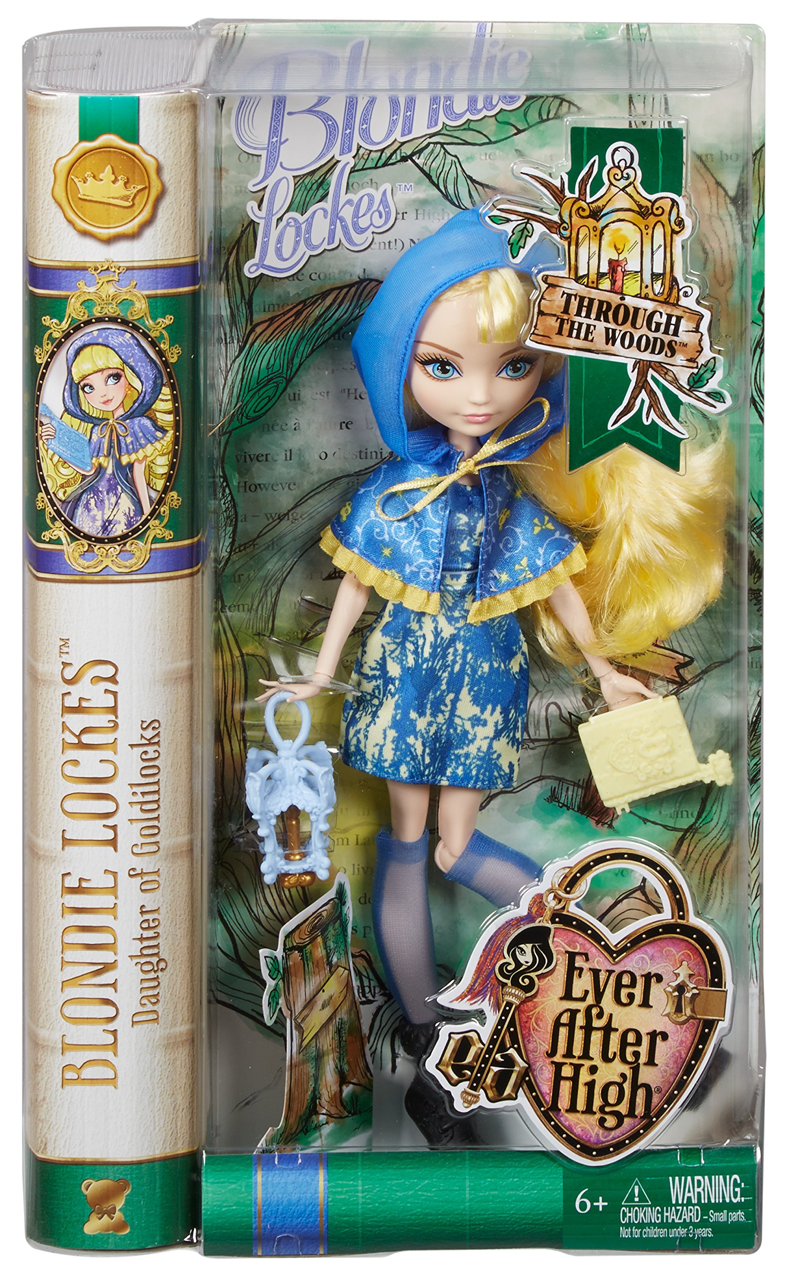 It’s a legendary night when C.A. Cupid, Poppy O’Hair, Ashlynn Ella and Blondie Lockes are invited to the hexclusive Blue Moon Forest Fest! Located deep within the enchanted forest, the girls venture “through the woods” to find this epic event. Whether or not they are following in their parents’ fabled footsteps, they are definitely following their chosen path to get to what is sure to be an epic event! Blondie Lockes, the daughter of Goldilocks, has dressed for the occasion in a spellbinding dress with a forest print in hues of periwinkle blue, a sheer overlay, matching knee socks and a hooded capelet that looks just right with a yellow tie and hood. Golden earrings and a bracelet are a fairytale ending to the fashion story. Plus, black “fur”-trimmed booties and a matching lantern will be oh-so-useful on her journey through the woods. And don’t forget her notebook and pen -Blondie Lockes doll can hold them in her hand! Doll also comes with a doll stand and hairbrush (to style her blonde legacy locks). Watch the “Through the Woods” story unfold in new webisodes. Collect all of the spellbinding students of Ever After High (sold separately) for hexquisite display and storytelling fun. Each sold separately, subject to availability. Colors and decorations may vary. Doll cannot stand alone. Ages 6 and older.
