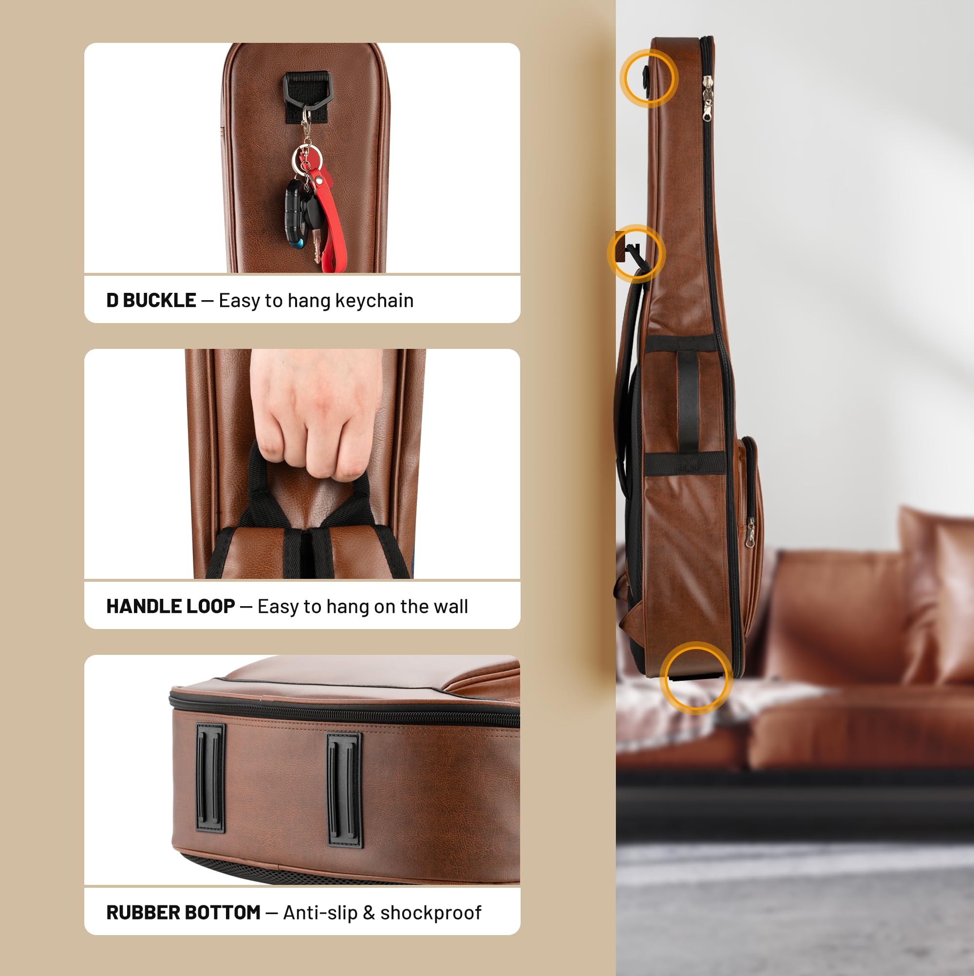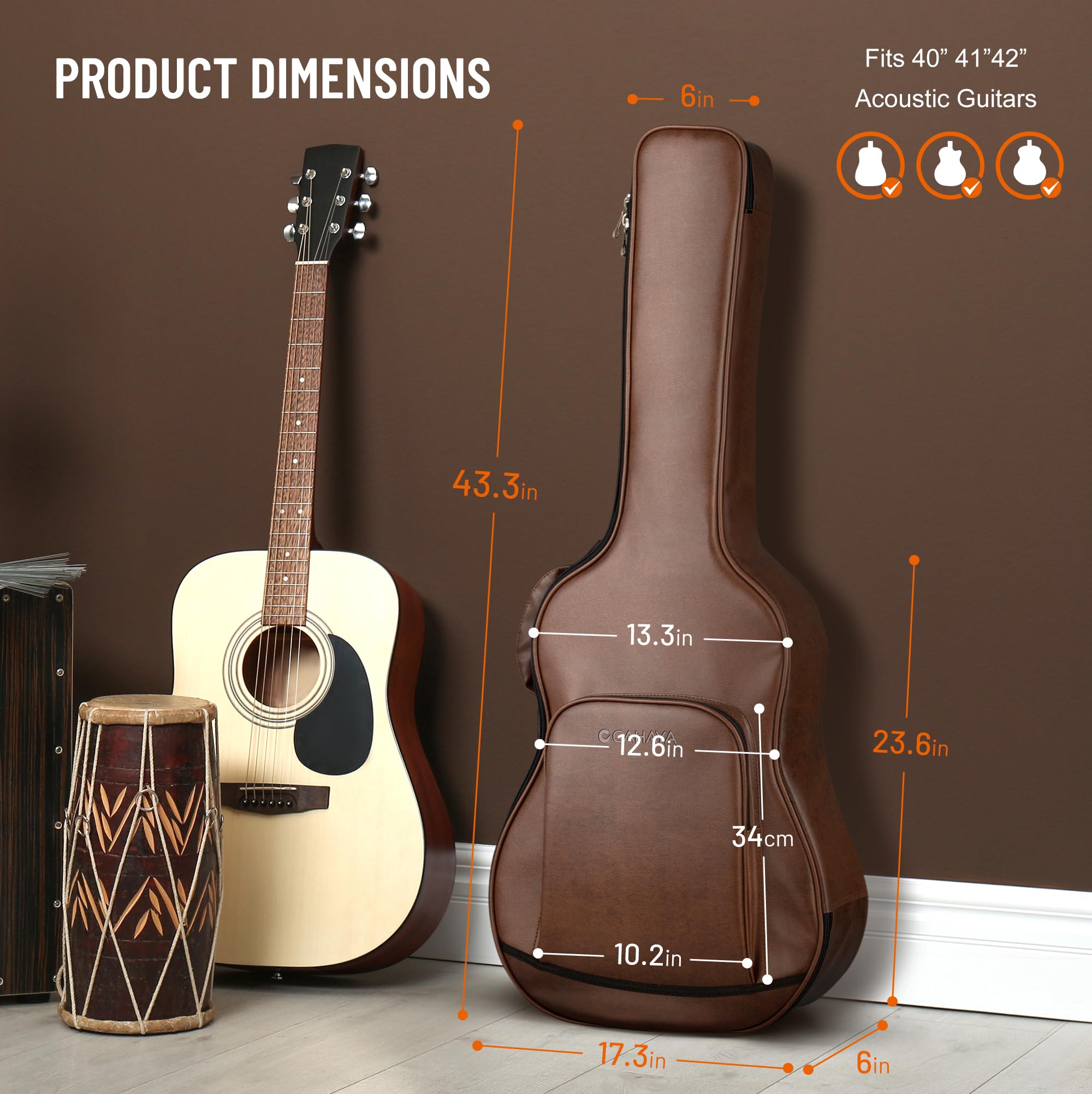 Experience Strong Protection for Your Guitar! Our acoustic guitar case features a 3-layer reinforced protection system designed with your instrument's safety in mind. Outer layer is made from brown PU leather, waterproof and easy to clean. In the middle, 0.6-in thick padding to prevent any bumps. Inner layer features a smooth, durable lining that’s gently on your guitar and built to last, keeping your instrument safe for years to come.