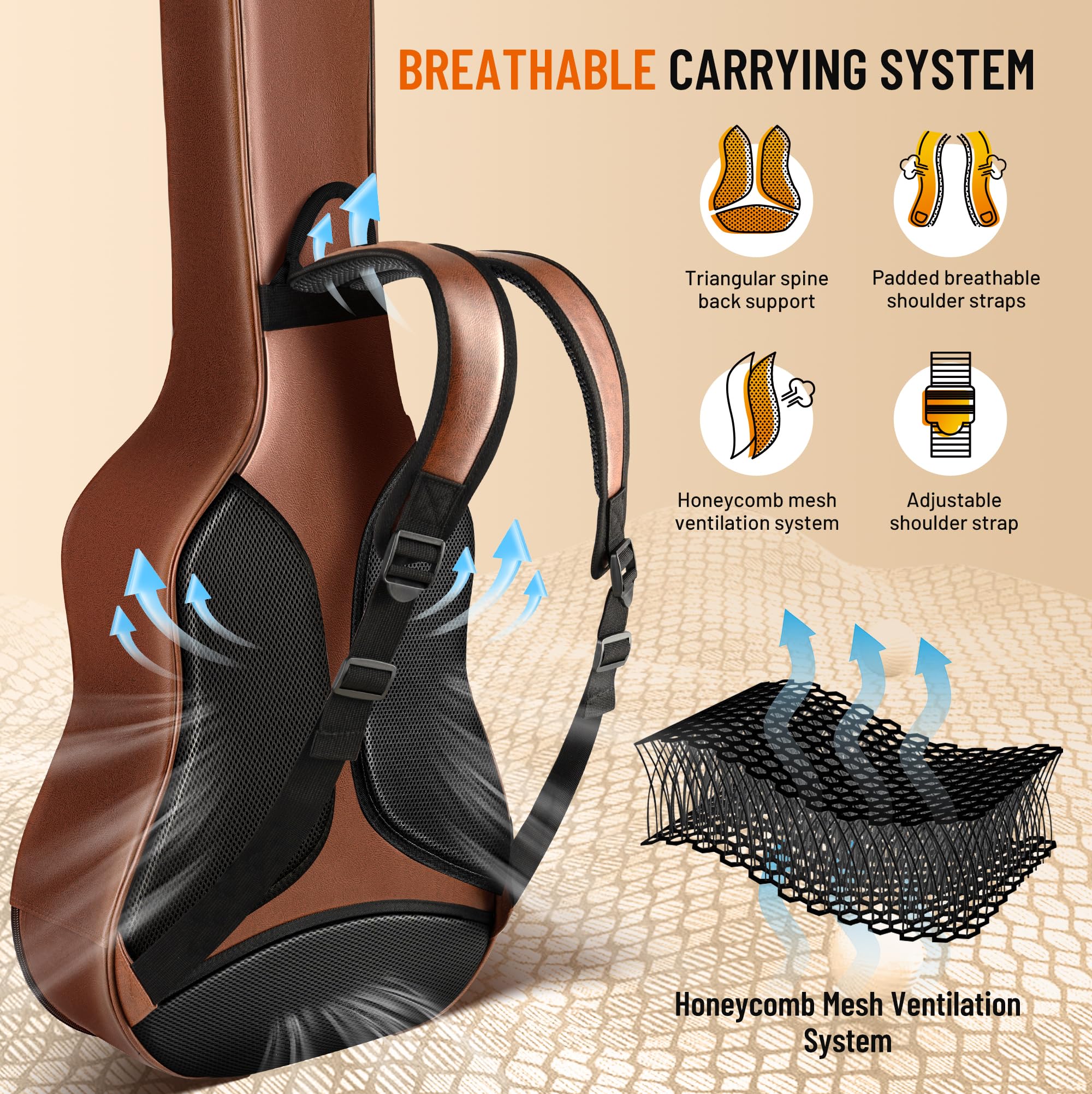 Breathable & Comfortable: The guitar bag features a breathable mesh design on the back, which helps keep the back dry and increase carrying comfort. This is particularly important for those who carry their guitar for extended periods. Additionally, the breathable mesh provides cushioning, which helps reduce wear and tear during use.
