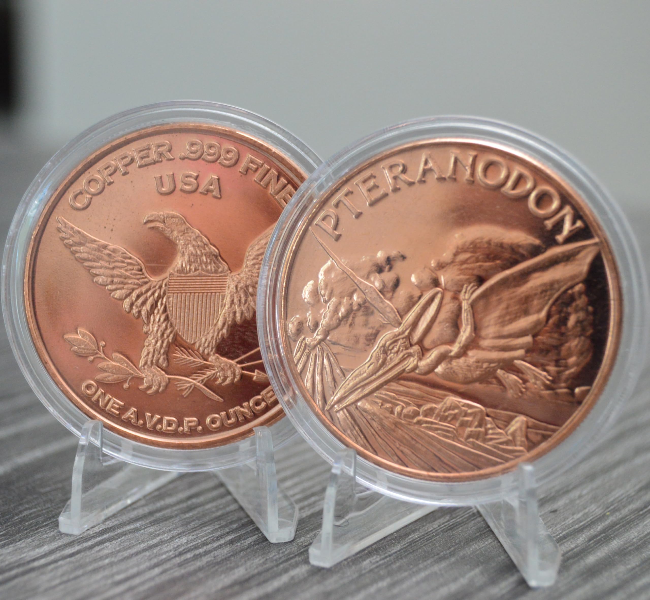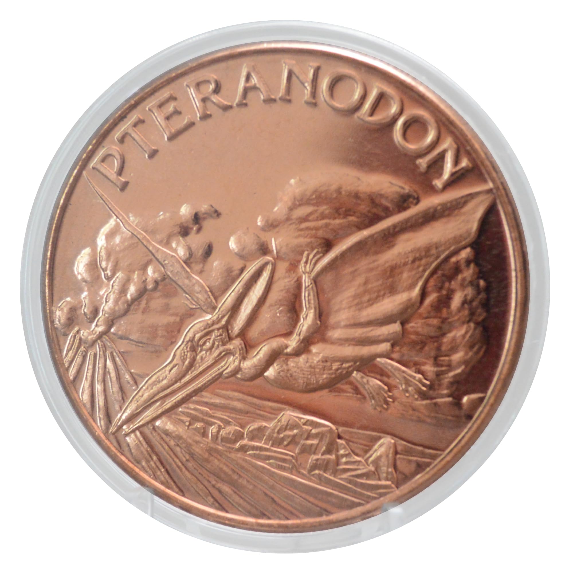 Step back in time with this stunning tribute to the Pteranodon, part of our Prehistoric Dinosaur Series. Minted from 1 AVDP ounce of 99.9% pure copper, this coin brings a slice of prehistory to your hand. The front side of the coin beautifully captures a Pteranodon mid-flight, showcasing the creature's vast wingspan and unique head crest. Known as one of the largest flying reptiles, Pteranodon is a symbol of power and magnificence. On the back, the coin features an eagle resembling the US seal, gripping a branch and three arrows, symbolizing peace and defense. Each detail on this copper round, from the dinosaur's texture to the eagle's features, is meticulously designed for a high-quality finish. This coin is a perfect addition to any collection and a wonderful gift for those fascinated by the world of dinosaurs and prehistoric life. The coin comes securely encapsulated in a protective capsule, which not only maintains its condition but also allows for a clear view of its intricate details. A Certificate of Authenticity by Heavenly Metals is included, confirming the copper round's purity and origin. Whether for a history enthusiast, a coin collector, or a dinosaur lover, this prehistoric Pteranodon copper round offers a tangible piece of Earth's history. Don't miss the chance to own a part of the Prehistoric Dinosaur Series.