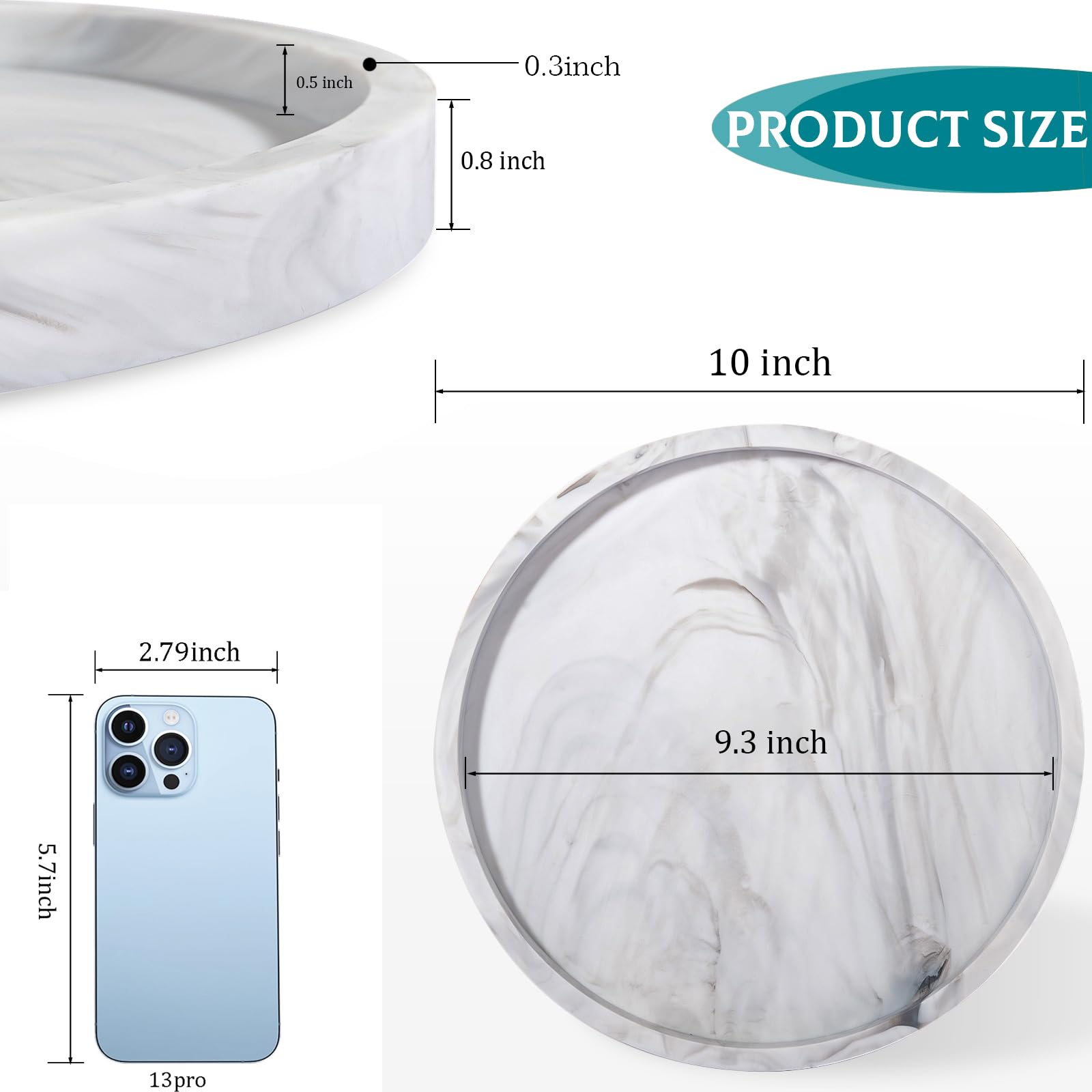 Perfect Size: Measure 10‘’ in outer diameter and 9.3‘’ in inner diameter, round shape, this coffee table tray is suitable for placing in different areas without taking up too much space. The raised edges are 0.3 inches thick to prevent soap dispensers, soaps, and other bathroom essentials from falling over.