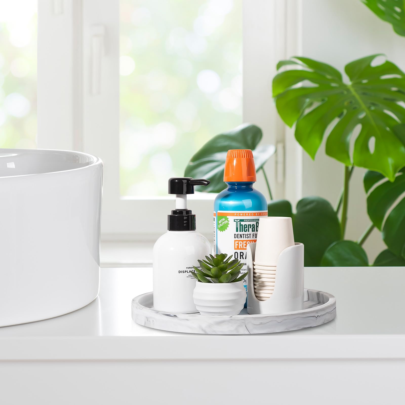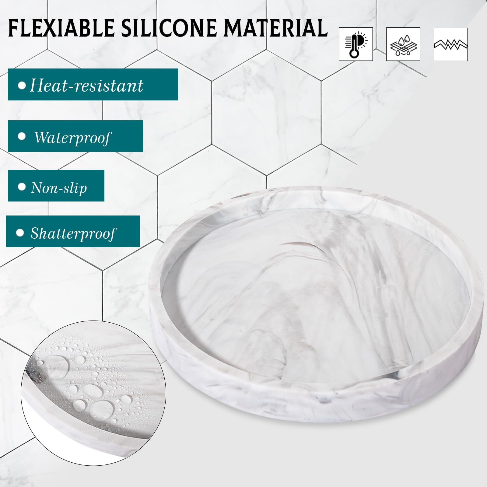Solid Construction: Made of thickened silicone material, sturdy and robust. With smooth edges and flat bottom, the round perfume tray is non-slip, shatterproof and scratch resistant, which can better protect your granite countertops.