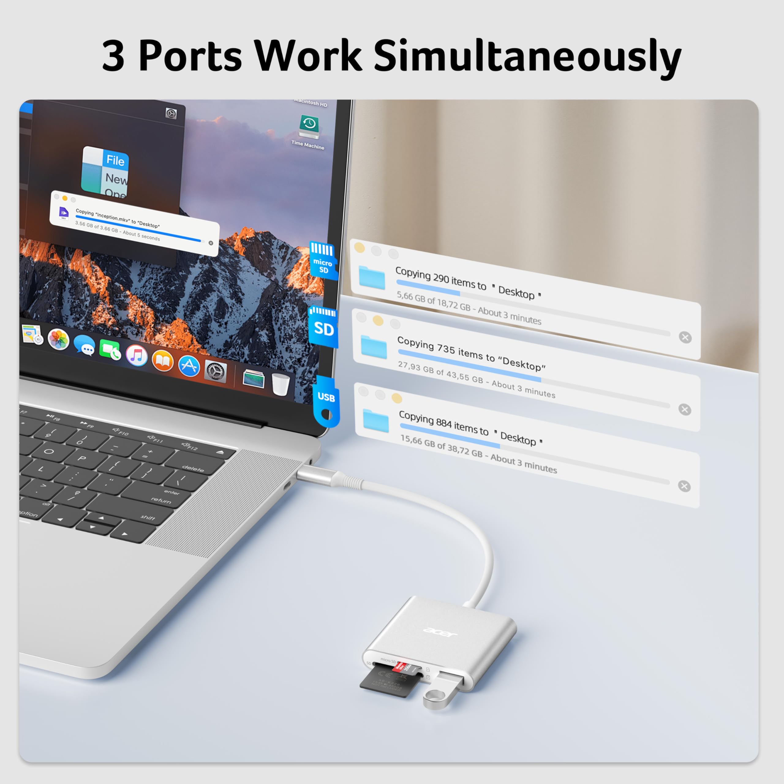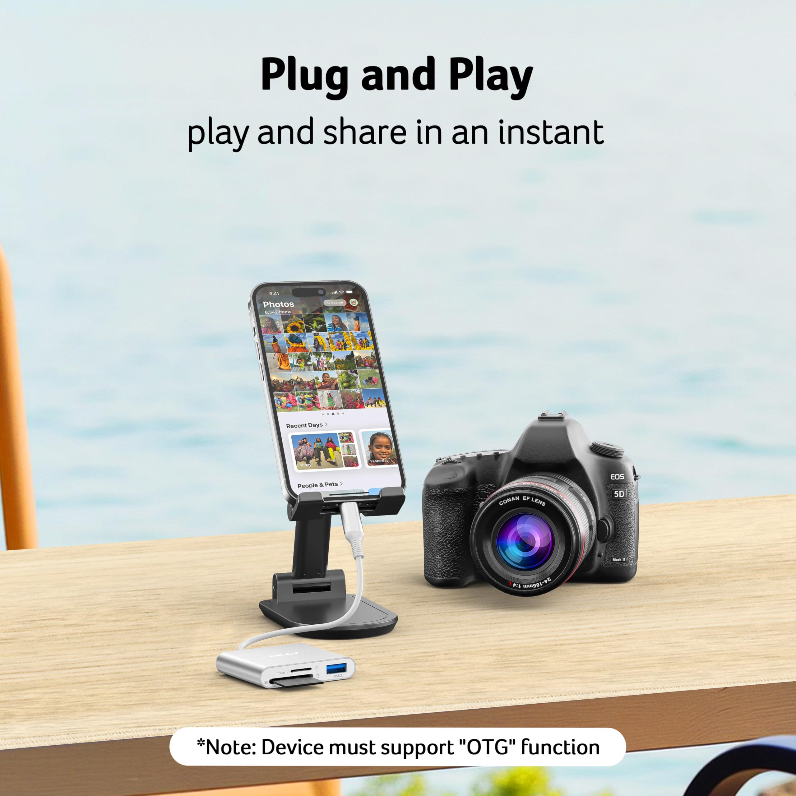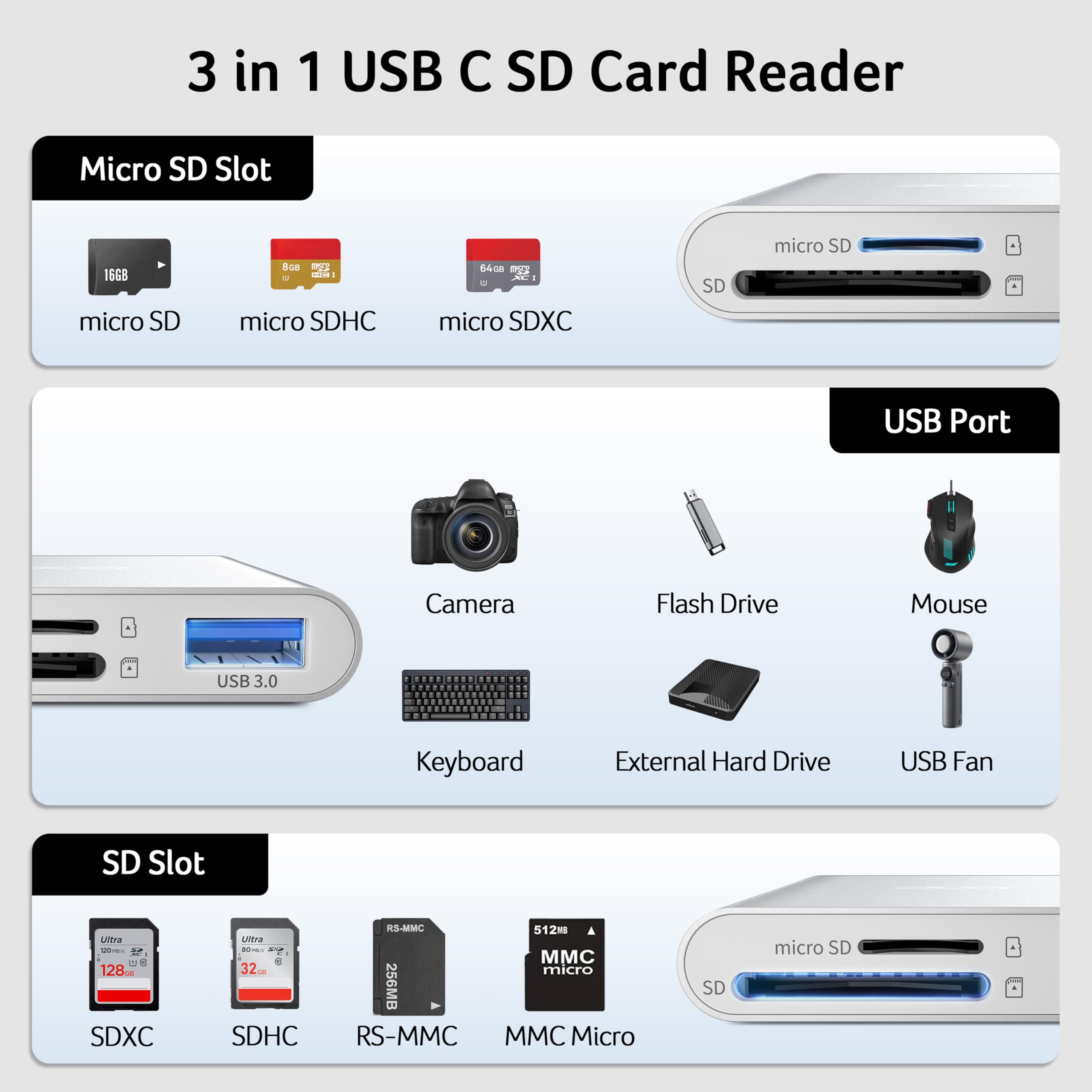 【3-in-1 Card Reader】The USB C SD Card Reader features dual card slots and a USB 3.0 port, enabling simultaneous data transfer from SD, microSD, and USB devices at up to 5Gbps. Transfer photos, videos, and files fast—no need to swap devices(📌Note:Thick cases may prevent full insertion)