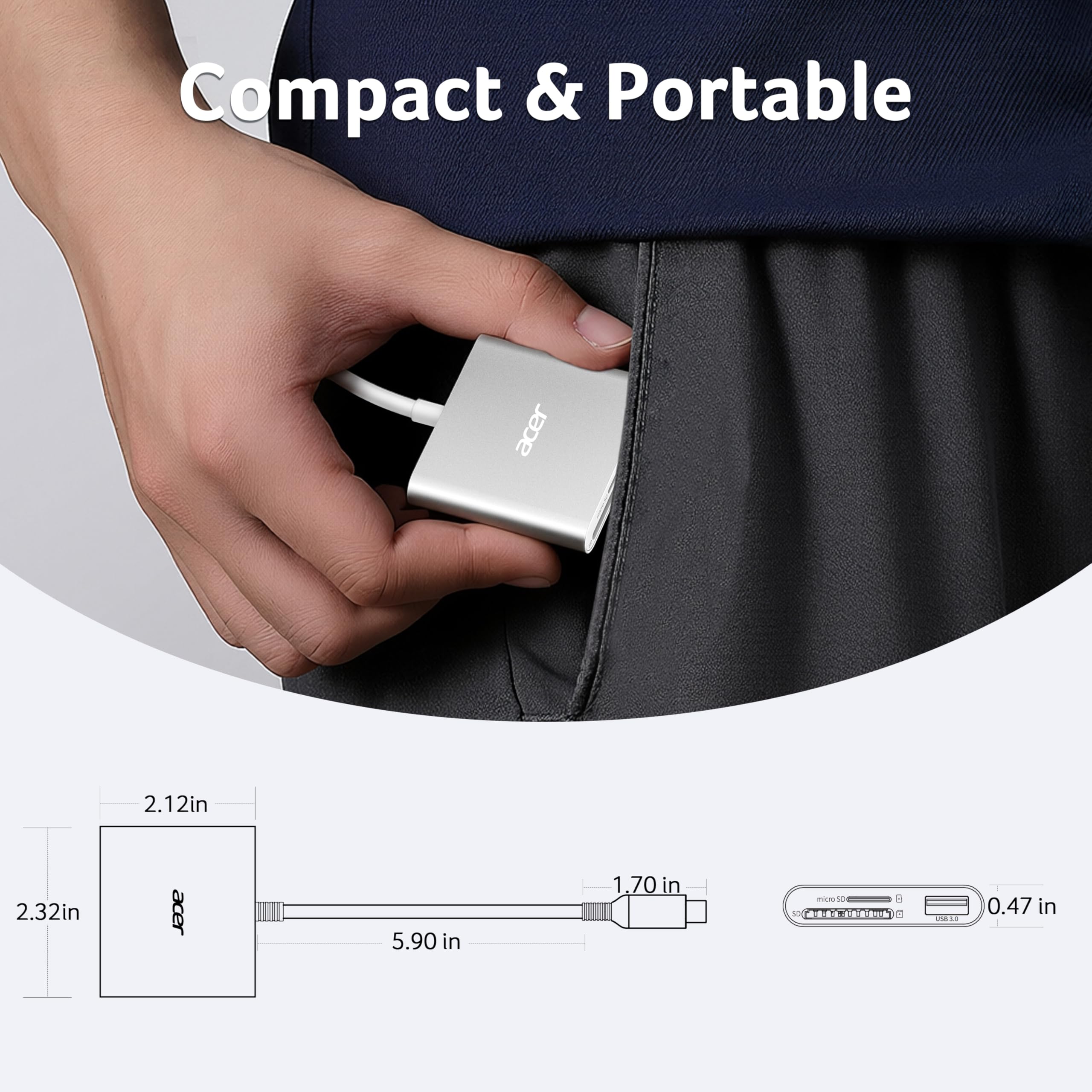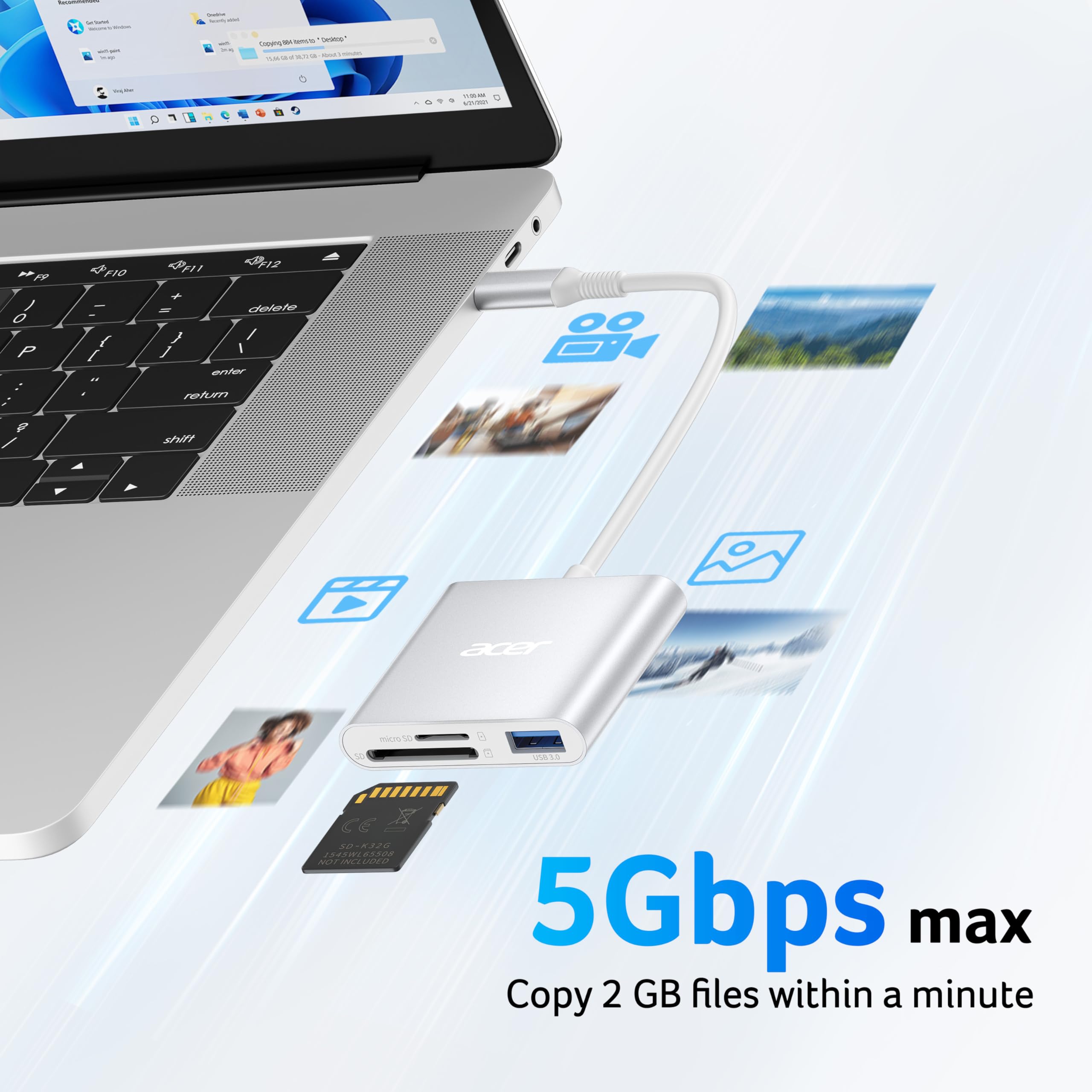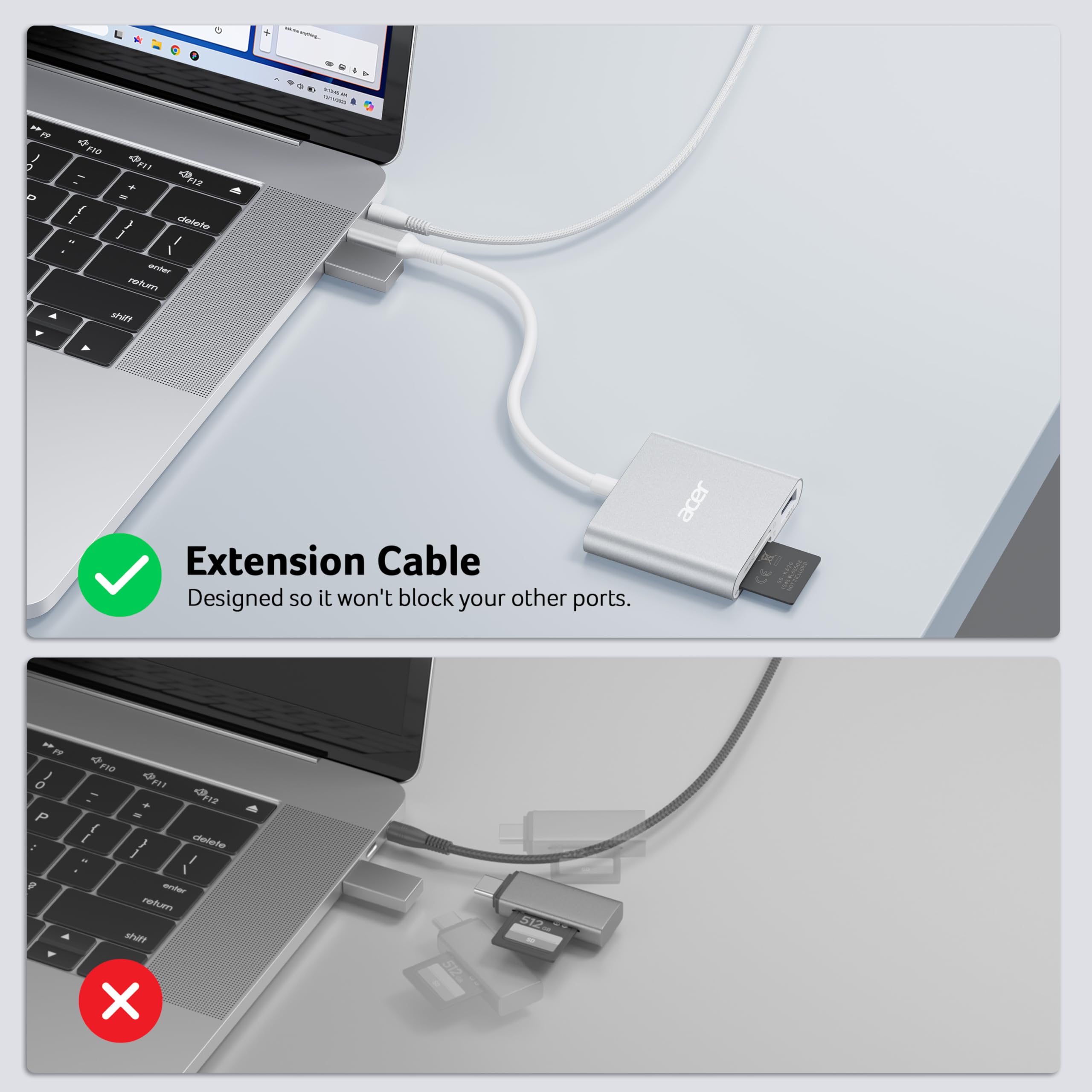 【3-in-1 Card Reader】The USB C SD Card Reader features dual card slots and a USB 3.0 port, enabling simultaneous data transfer from SD, microSD, and USB devices at up to 5Gbps. Transfer photos, videos, and files fast—no need to swap devices(📌Note:Thick cases may prevent full insertion)