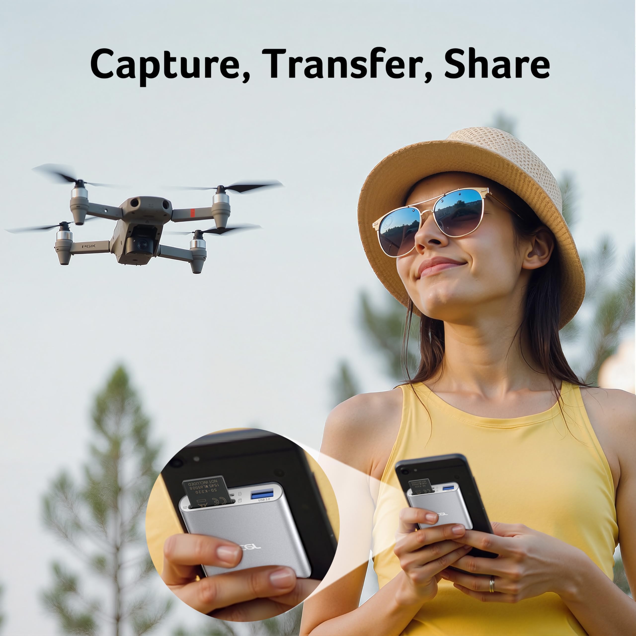 【Heat-Resistant & Portable】This SD Card Adpater features a durable aluminum shell for excellent heat dissipation and stable data transfers. Compact and lightweight, it fits easily in your pocket or bag. The 15cm cable keeps ports free—ideal for travel, remote shoots, or mobile work.(📌Note: "SD" card and "Micro SD" card not included)