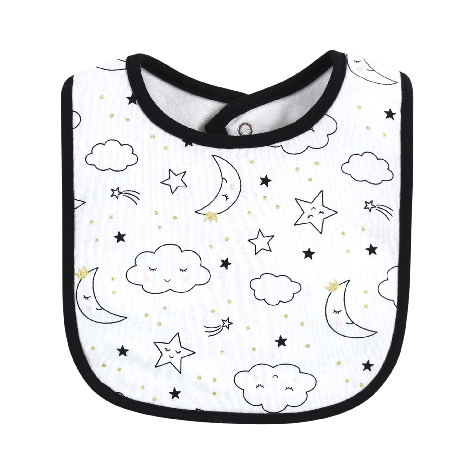Hudson Baby interlock cotton drooler bibs are fashionable baby bibs made with two layers of soft, gentle cotton. Our bibs feature cute prints and embroideries and are great fashion bibs over baby's clothes to keep their outfits clean. Our bibs are great for drooling, feeding and more.