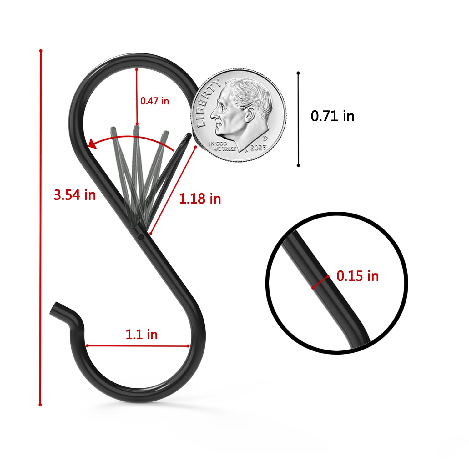 12-Pack: You'll get 12 Black Sturdy, S-Hooks with Safety Buckles, great for saving home/office/garage space/organizing and Hanging Plants, Halloween decorations, Christmas Lights & Patio Lights.