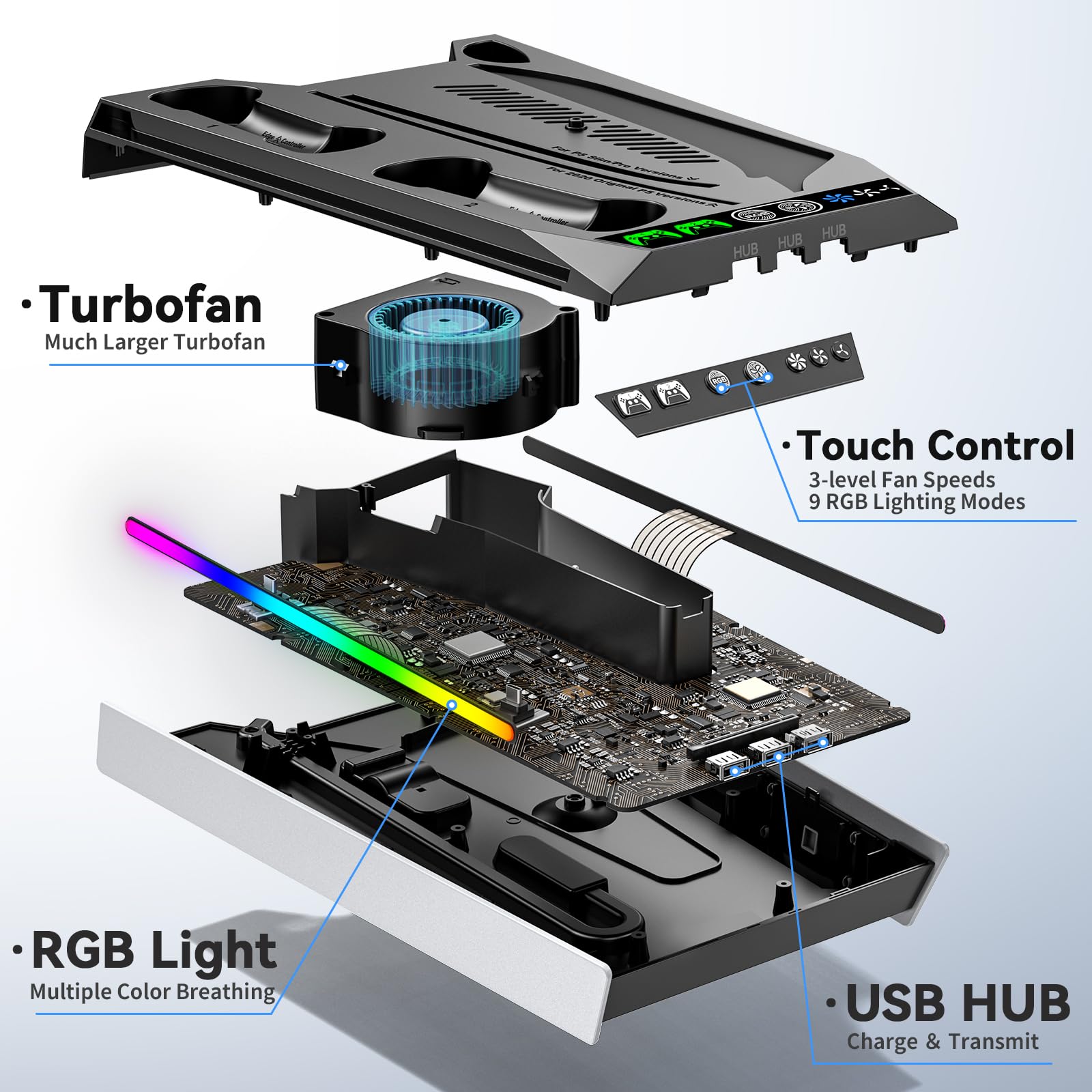 PS5/SLIM/PRO COOLING STATION:This ps5 cooling station is specifically designed for the PS5, PS5 Slim, and PS5 Pro. The PS5 cooling base features concealed built-in cables and sturdy security screws, ensuring a stable and secure connection with the PS5 console for safety and balance. Its aesthetically pleasing design harmonizes beautifully with the PS5. Playstation 5 case.