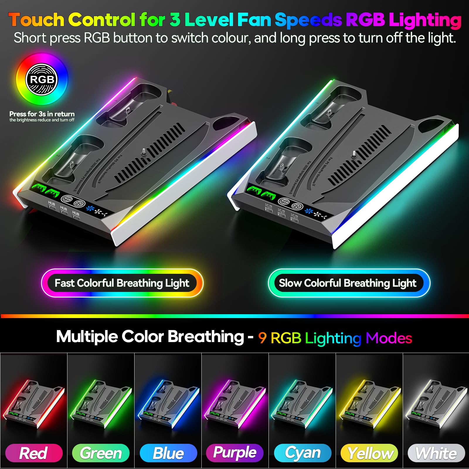 3 FAN SPEED & RGB LIGHTS: This ps5 cooler is equipped with an integrated turbo fan and a touch-sensitive fan button, allowing for convenient three-speed cooling adjustments and light switching. The PS5 cooling fan expels hot air from the side to ensure efficient heat dissipation. Simply press the touch button to effortlessly switch between different colors, with the RGB ambient lighting adding visual appeal. A long press on the touch button turns the lights on or off. This PS5 cooling fan may even remember the previous lighting mode after a restart. Playstation 5 case.