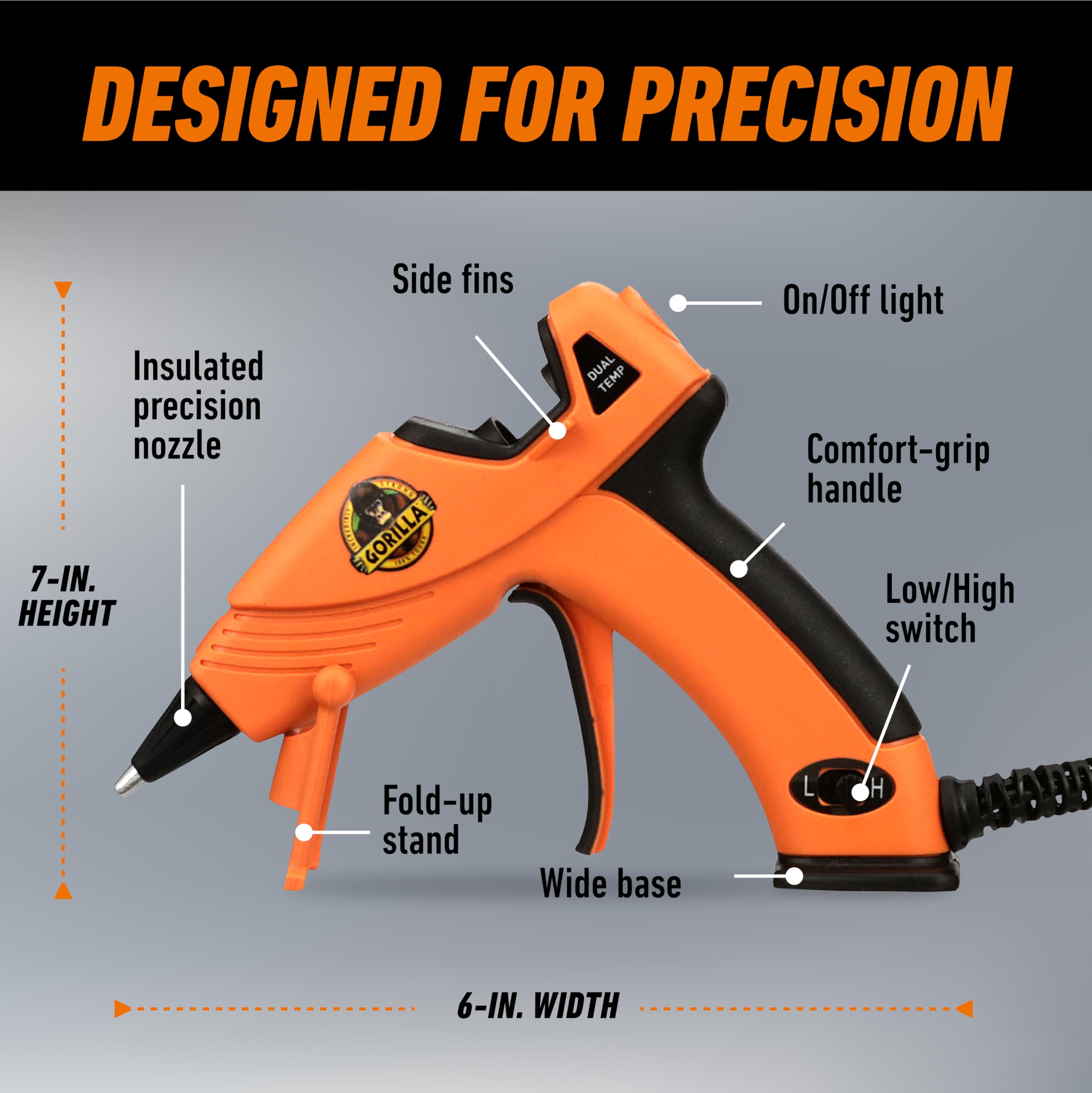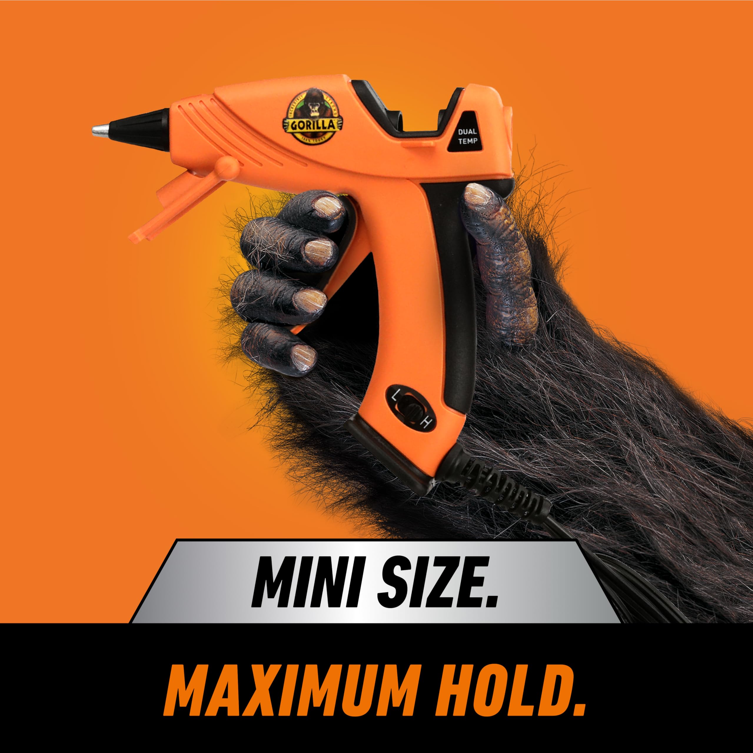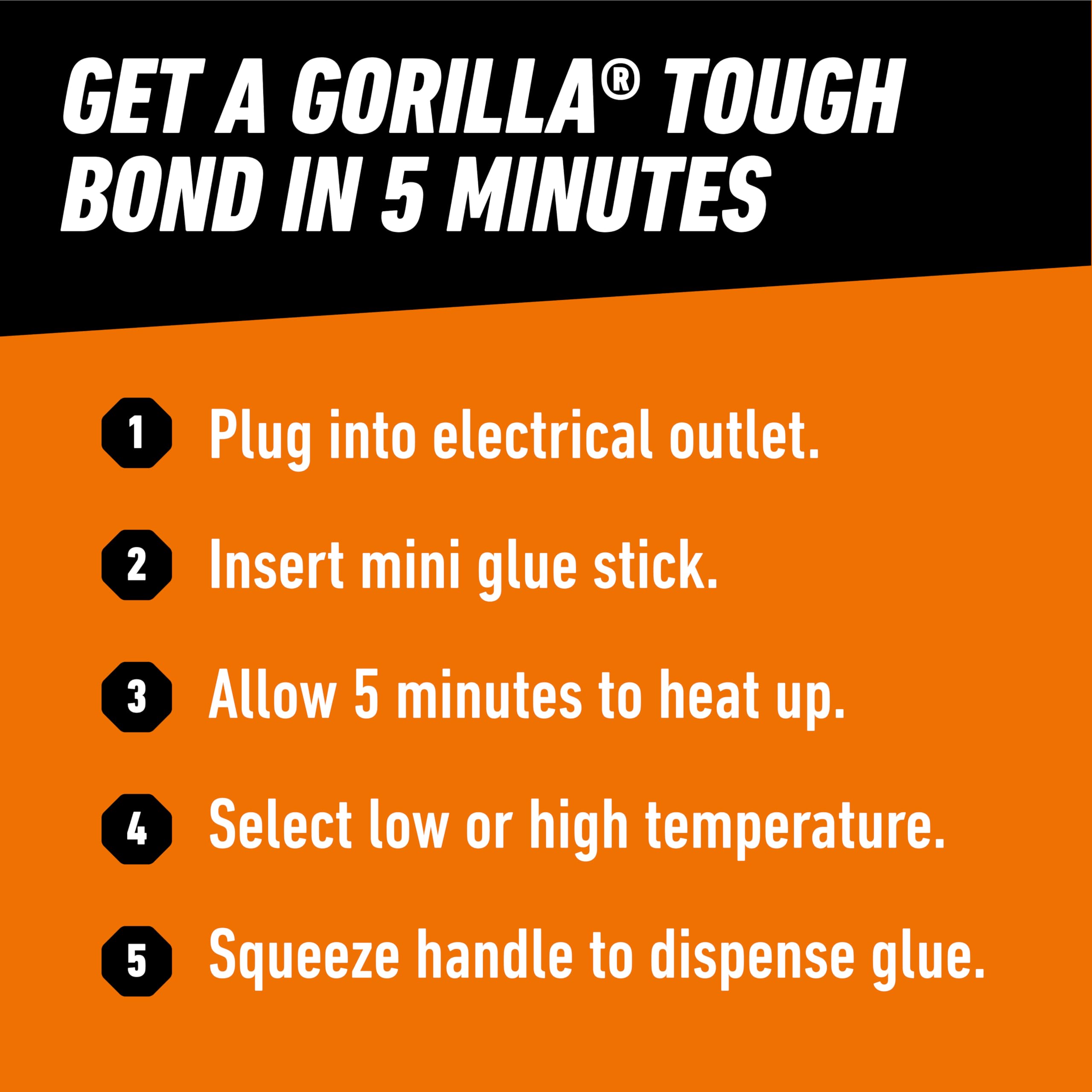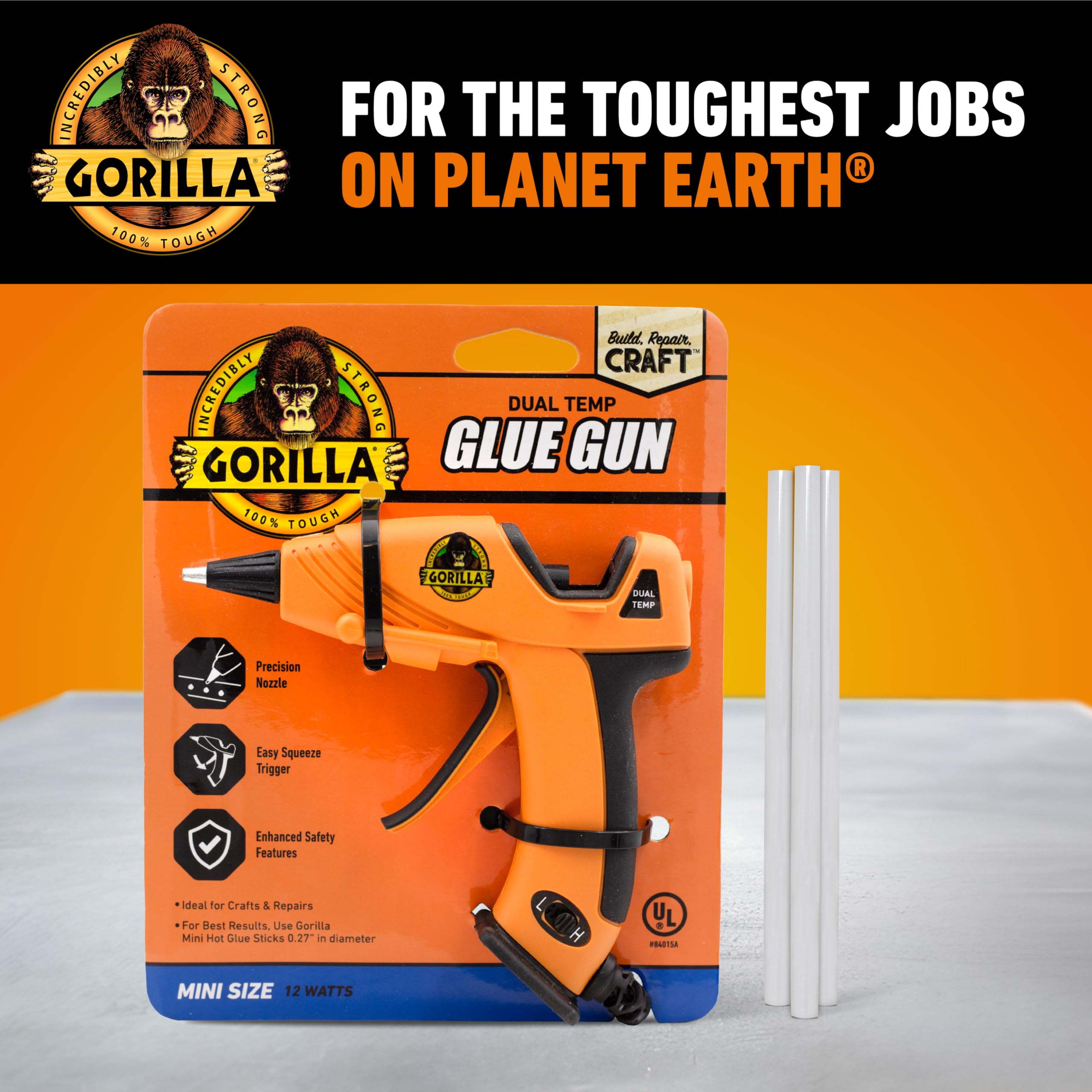 The Gorilla Dual Temp Mini Hot Glue Gun and sticks set is an ideal tool for crafts and repairs and addition to your craft room. It is light weight, with a comfort grip and a built-in stand making it easy to use. The easy squeeze trigger and long insulated nozzle allow a precise application on whatever project you are working on. Gorilla Hot Glue Sticks provide a long term hold even on hard to bond surfaces. The clear adhesive works with both high and low temperature glue guns and features an extended working time for added convenience for all types of projects. Gorilla Hot Glue is also weather-resistant and incredibly durable. Directions: 1. Plug into 120V electrical outlet. 2. Insert 0.27” diameter mini glue stick into back of glue gun through the feeder tube. 3. Allow glue gun to heat for approximately 5 minutes. 4. Squeeze trigger to dispense glue. More glue is dispensed by squeezing trigger repeatedly. Continue glue flow by adding additional glue sticks. Note: Requires approximately 2 glue sticks for initial start up. 5. Immediately press surfaces to be bonded together. 6. Do not pull glue sticks from glue gun. If changing glue, feed remainder of glue stick through glue gun. 7. Unplug after use and allow glue gun to cool completely before storing. Dual Temp Glue Gun: Use High Temperature for Wood, Plastic, Metal, Glass & more. Use Low Temperature for Floral, Fabric, Foam, Jewelry and more. Troubleshooting: Glue gun will not heat up: Make sure glue gun is plugged into a 120V electrical outlet. If glue gun still does not work, the internal fuse of the glue gun may be blown and the glue gun is not repairable. Do not use. Glue backs up at inlet tube: Glue sticks may be the wrong size. Use only the recommended 0.27"; diameter mini glue sticks. Note: Do not elevate front of glue gun. Always use side stands or attached stand.