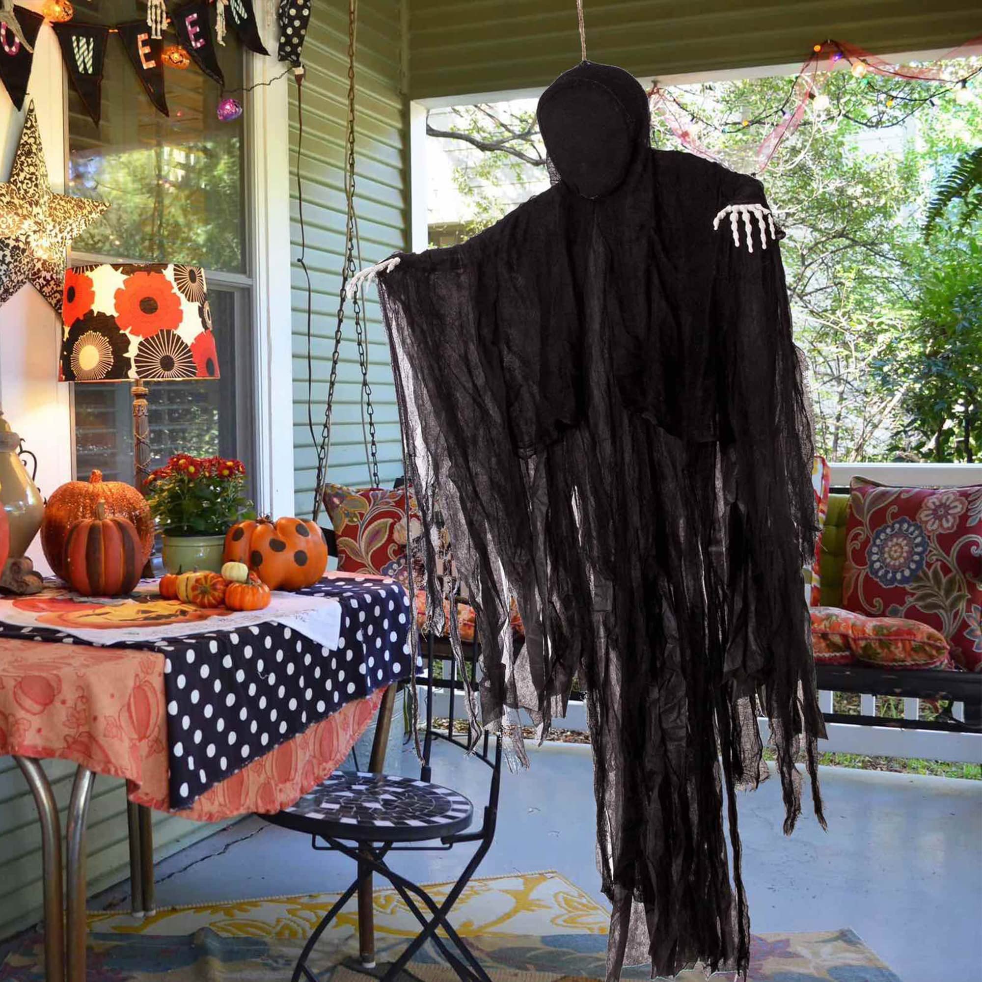 REALISTIC HALLOWEEN DECOR: Best Scary Faceless Black Hanging Grim Reaper for your Halloween Haunted House Props and creating an eerie atmosphere and spooky scene in a house or party. A great addition to your halloween yard this year.