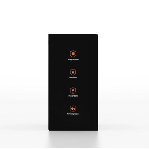 【 8-IN-1 MULTI-FUNCTIONAL JUMP STARTER 】Say goodbye to old bulky car battery jump starter! It is more lightweight and portable, integrates 8 practical functions to meet all your needs, including car emergency start, air compressor, pressure gauge, 3-mode lights (flashlight, SOS, strobe), dual USB ports power bank, and 160W EC out with EC cigarette lighter adapter. Portable, versatile and must-have road trip kit.