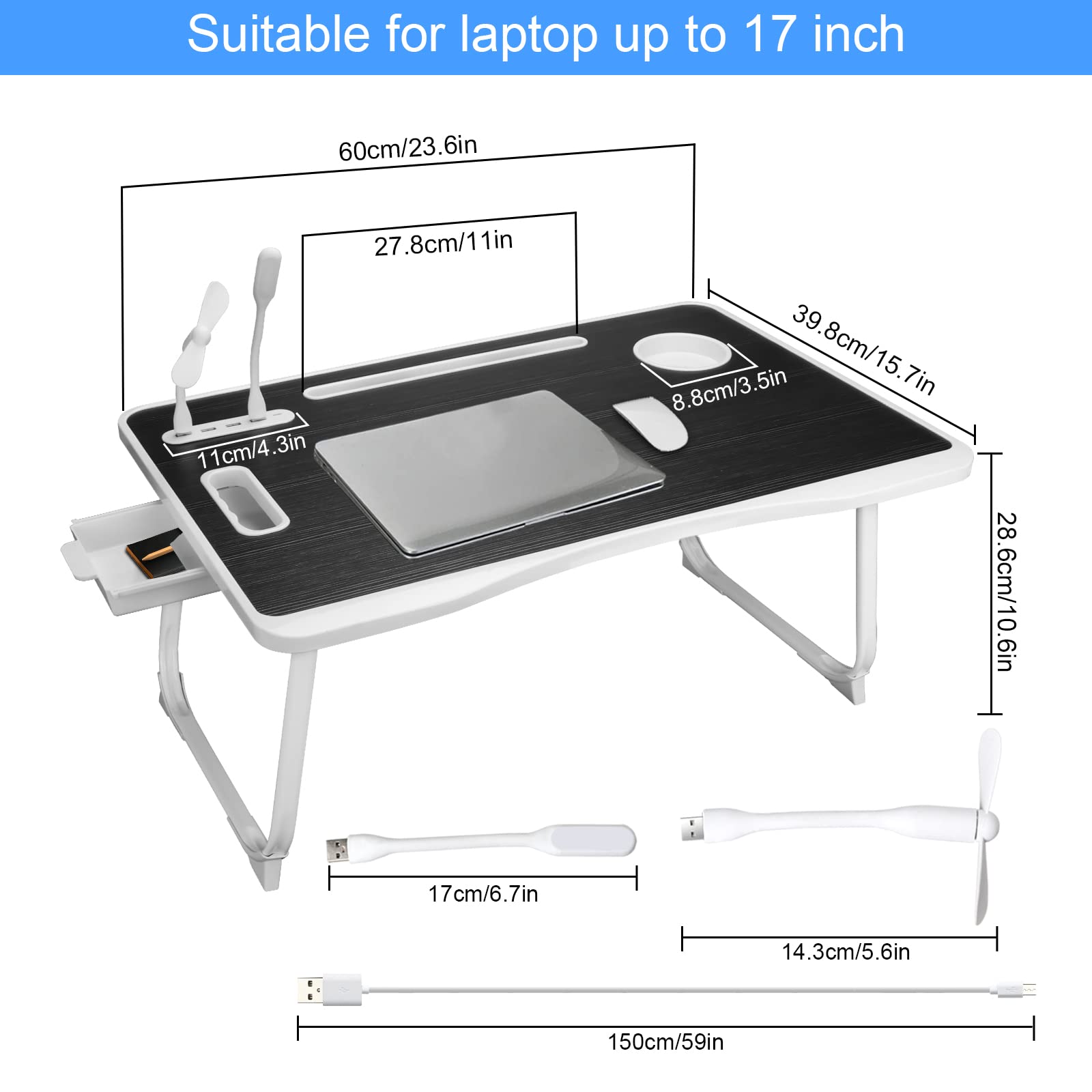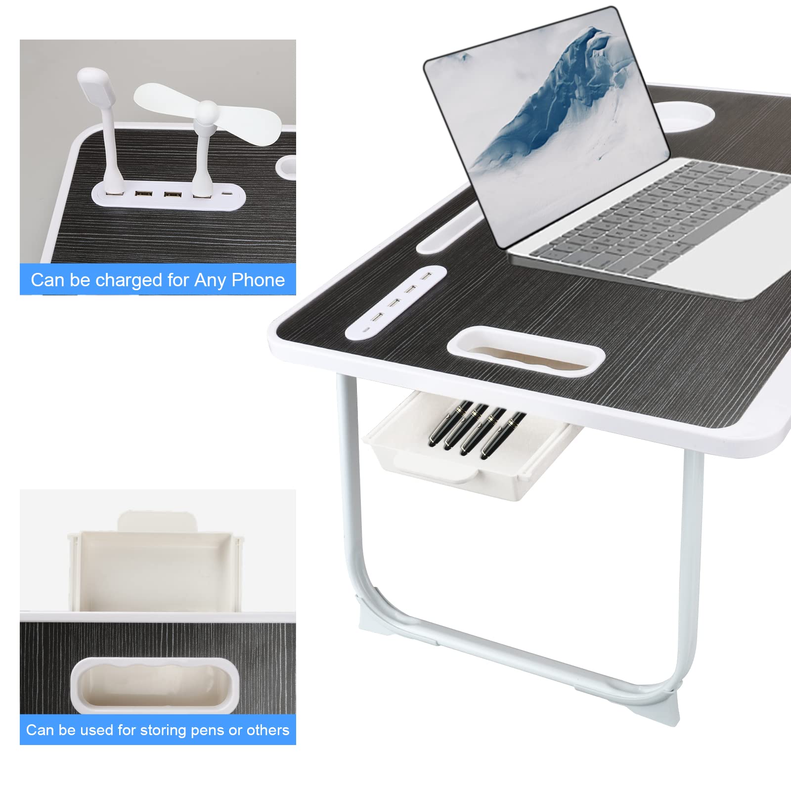 【Portable Laptop Bed Desk with 4 USB Ports】 Laptop bed desk comes with a USB powered mini light and mini fan. 4 USB ports are powered by one USB cable, you can use it to charge mobile phone or lamp if necessary.
