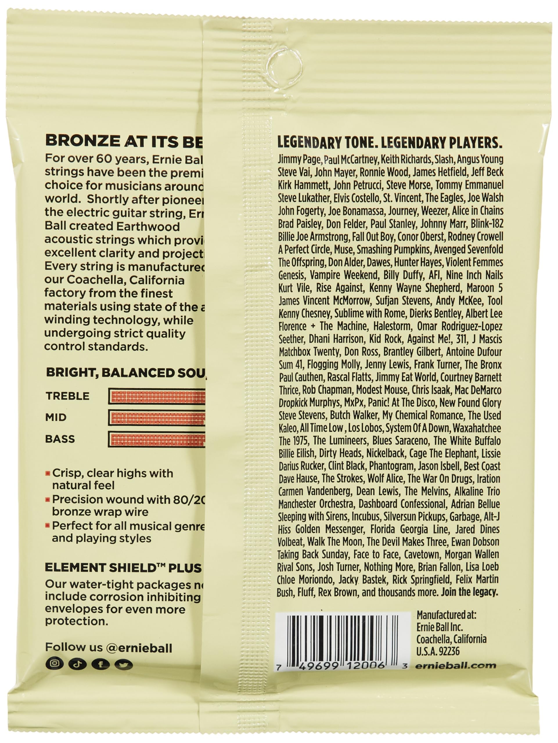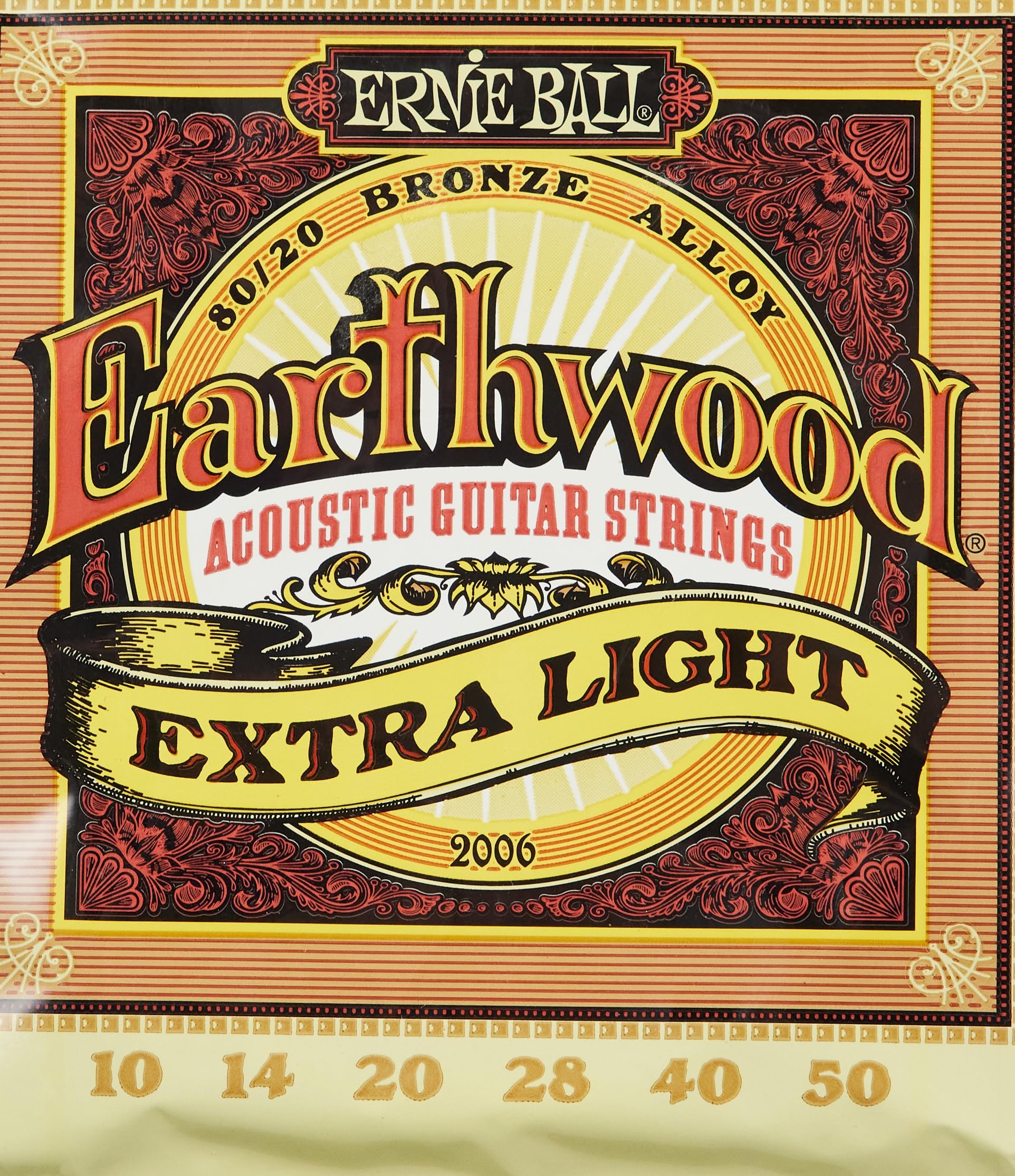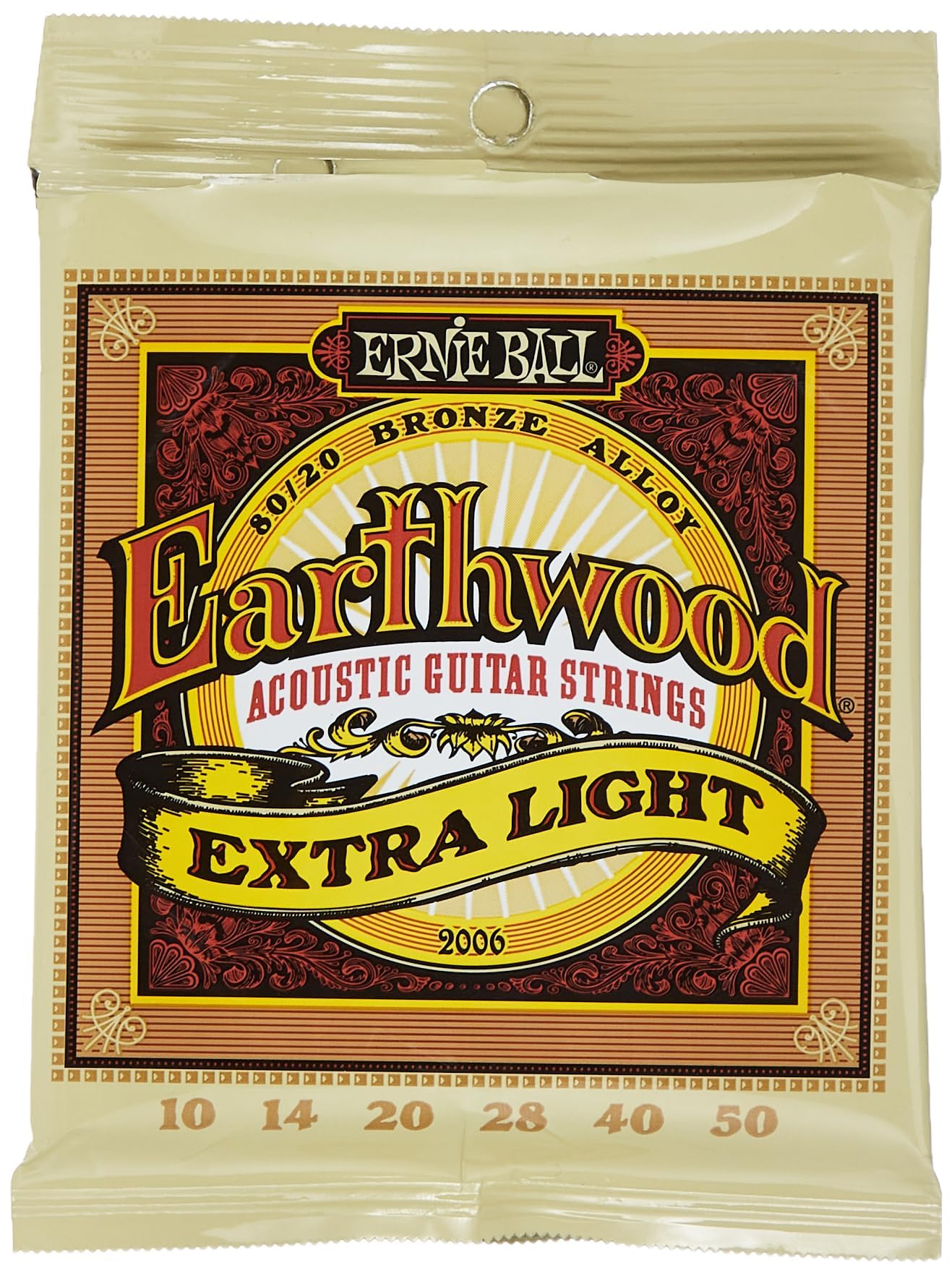 Ernie Ball Earthwood 80/20 Bronze acoustic guitar strings are made from 80% copper, 20% zinc wire wrapped around hex-shaped, brass-plated steel core wire. These acoustic guitar strings produce a bright, balanced sound with pleasing overtones. Gauges .010, .014 .020, .028, .040, .050.