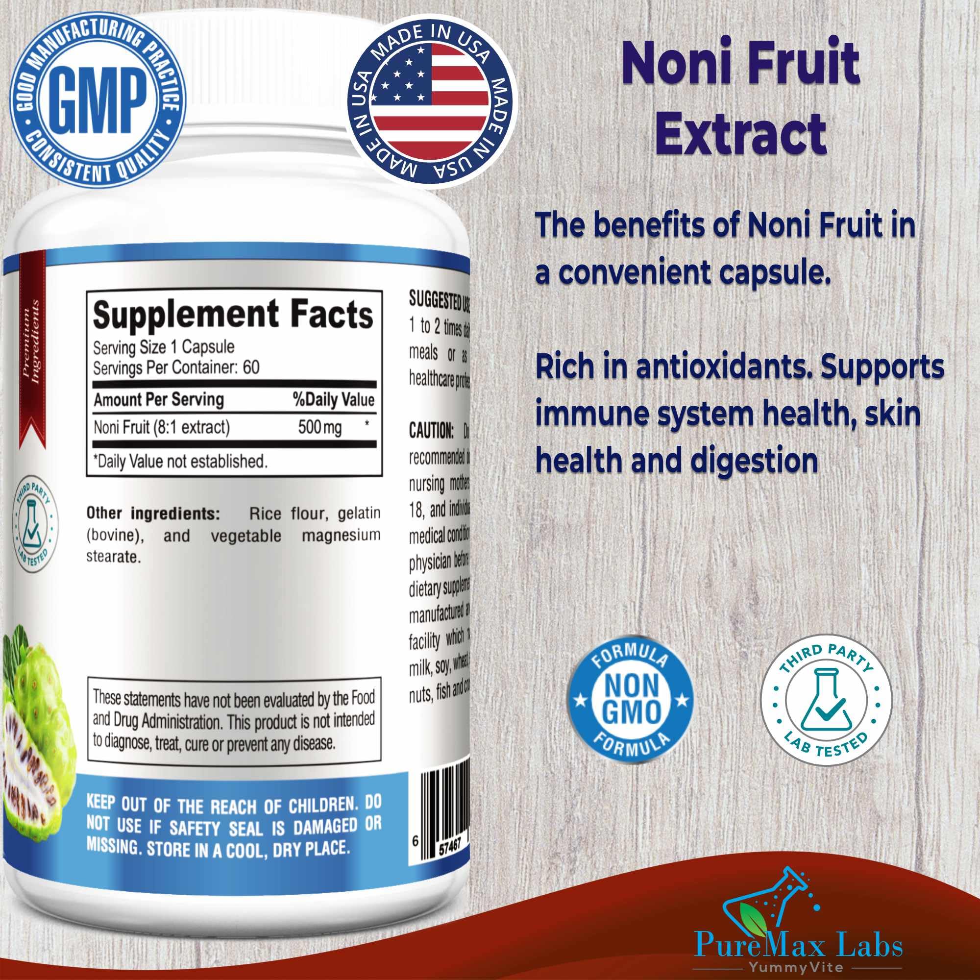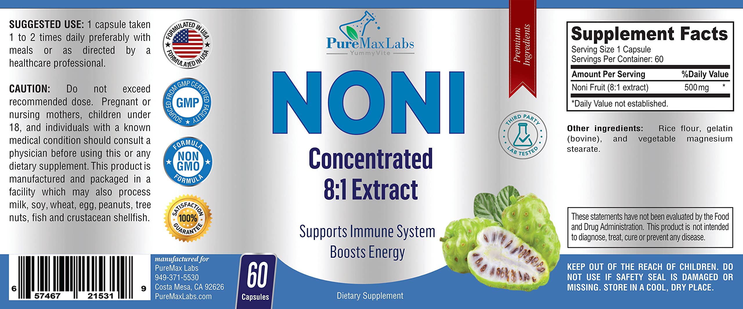 PureMax Labs Noni capsules are manufactured in the USA in an FDA-inspected, GMP facility from premium natural non-GMO ingredients and is 3rd party lab tested.