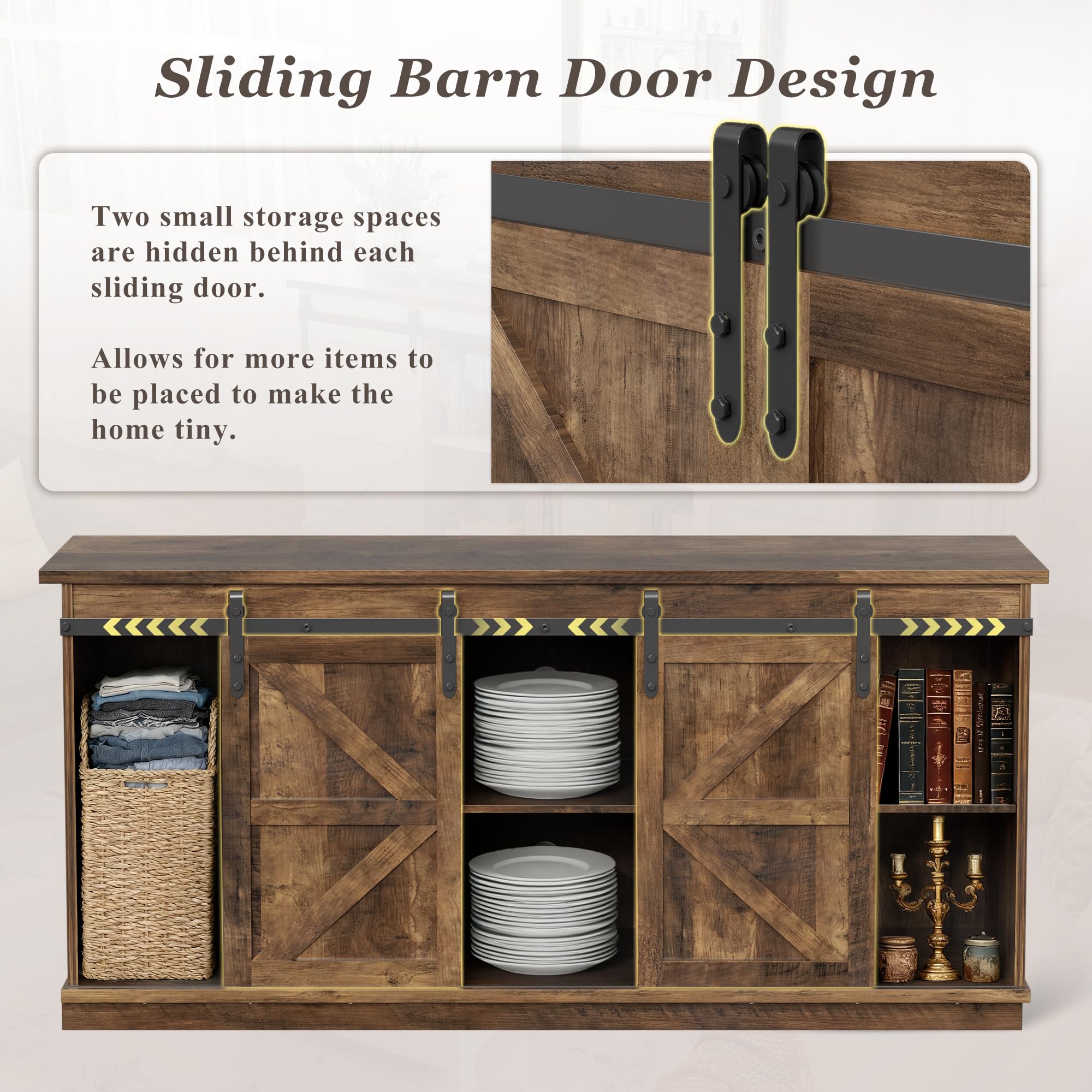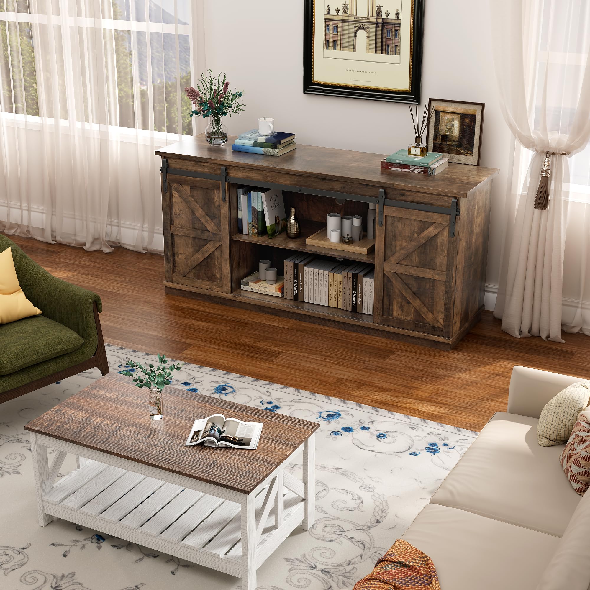 YESHOMY TV Stand Feature: TV stand is 27.6” H x 15.5” D x 58” L for TVs up to 65 Inches Two sliding doors can slide on metal rails to hide the storage cabinet Large storage space can hold more items, freeing up space in your living room Various styles to decorate your room, Create a comfortable home environment Drilling design which allows your electronic equipment power supplies to be easily Specification: Color: Barnwood Material: Metal, wood, etc. Package Dimensions:63"(L) x 18.25"(W) x 6.25"(H) Package Weight: 81.3 lbs Package includes: A tool kit A tv stand A manual of installation and usage Notice: There may be some differences between photos and items in term of color because the influence of lighting during the shooting or the settings of the computers’ display screen.