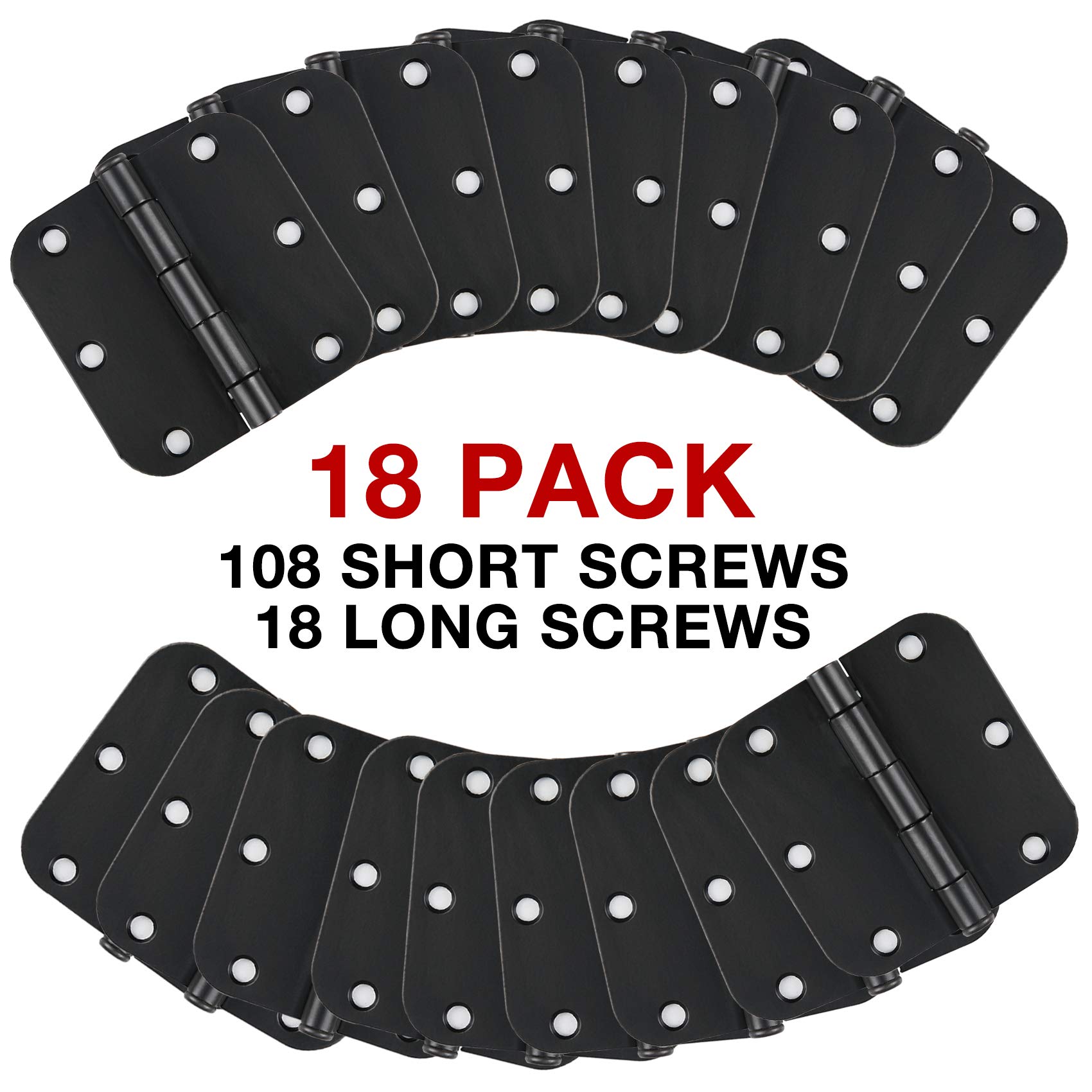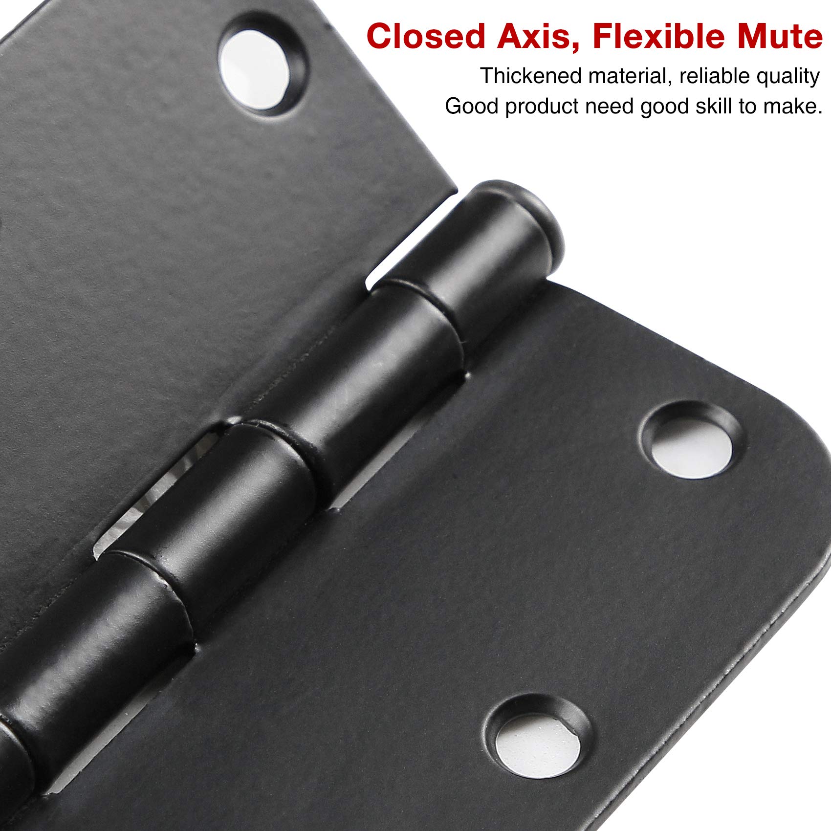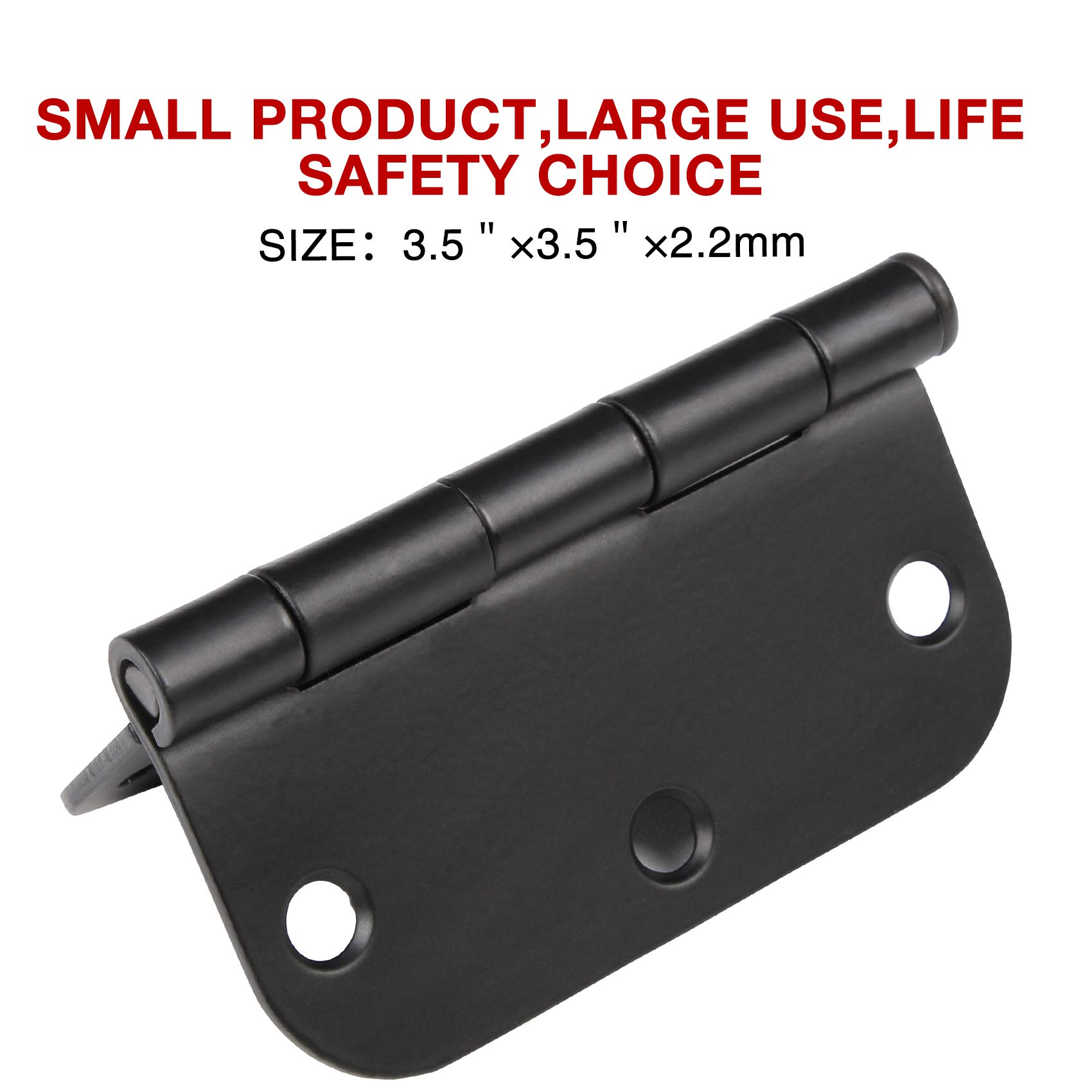 Door hinges Black Matte 3.5 inch with 5/8 rounded corners and 6 holes for front door, cabinet, wooden box. Safe black door hinges 3.5" Includes 108 free screws for quick and easy installation. Mat black door hinges can be rotated 270 degrees.