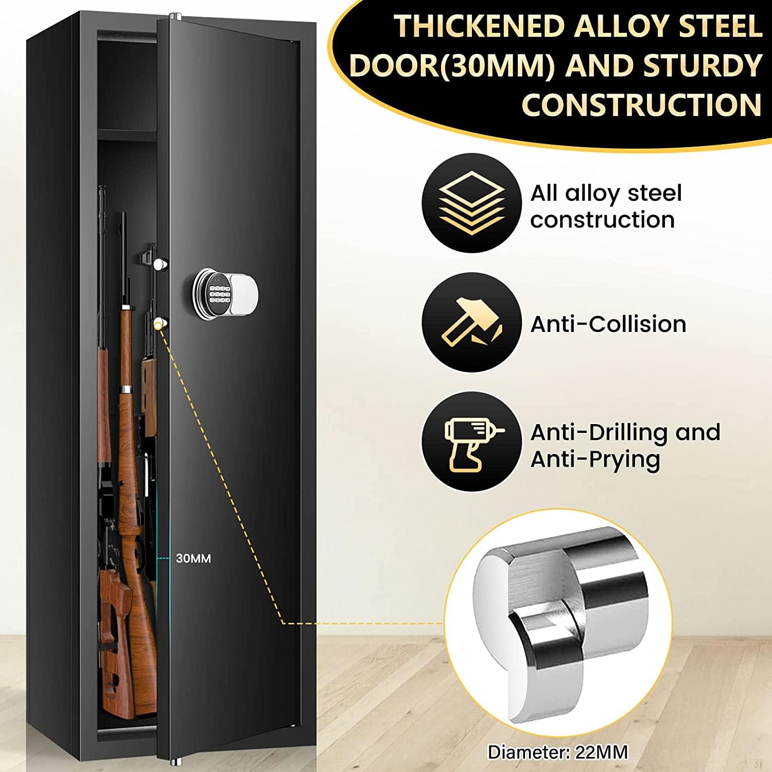 Heavy Duty Anti-Theft Rifle Gun Safe: Large gun safe is made of solid cold rolled steel with good anti-pick, anti-rust and high temperature resistance. Gun cabinet weighs up to 71.31 lbs and comes with four 22 mm solid bolts and 30 mm thickened front door. The rifle safe is solid enough to keep firearms from being accessed by children and to deter burglars. 3 consecutive wrong entries will cause the keyboard to be locked for 20 seconds. You can set silent mode or turn on the sound if you want