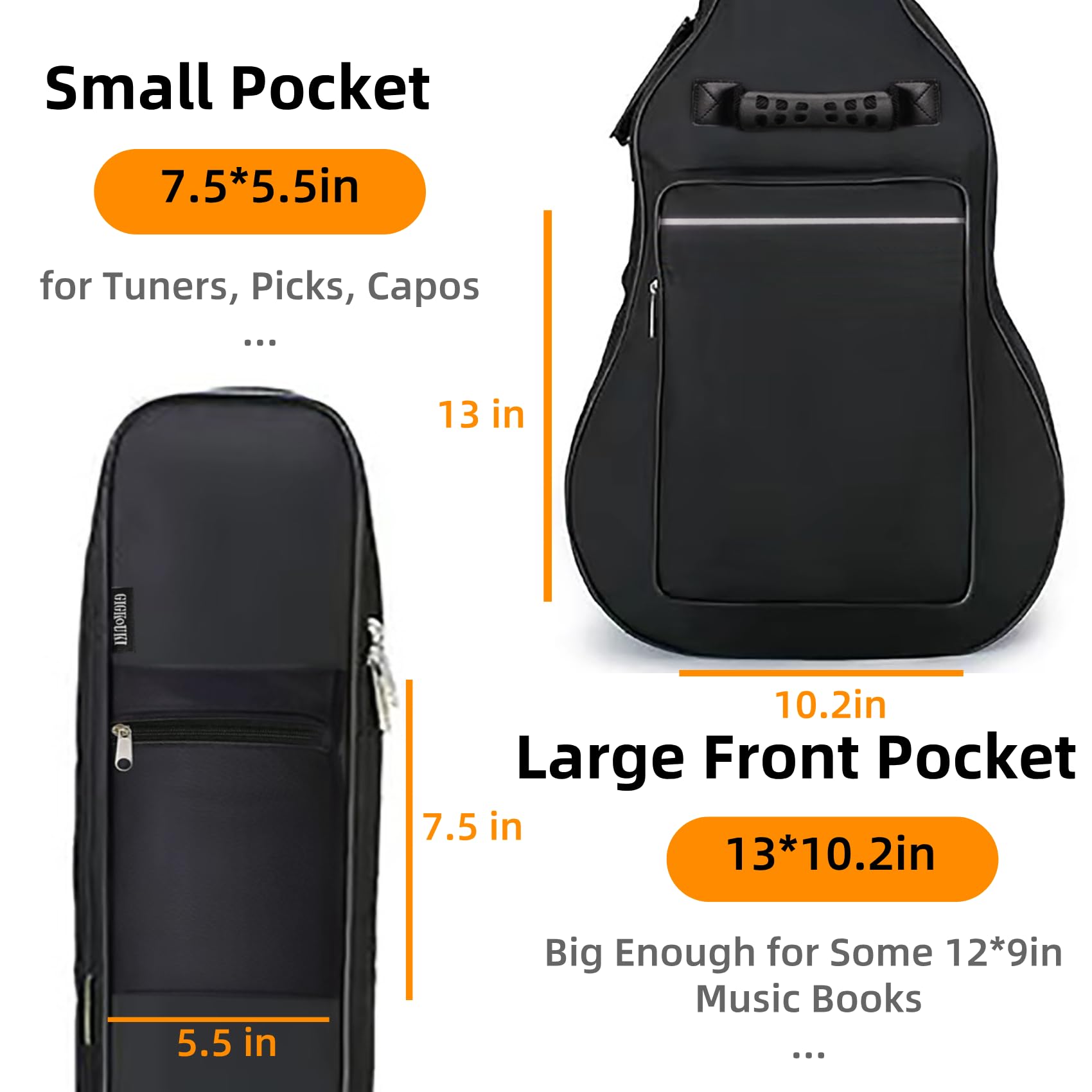 Larger Front Pocket+Neck Pocket: Humanized design 2 Pocket provides enough storage space for all your electric guitar accessories. The larger pocket Hold A4 and US letter size music sheets books, tablet PC, mobile phone, guitar straps; the Neck small Pocket is used to sore such as tuners, strings, cables, picks and etc.